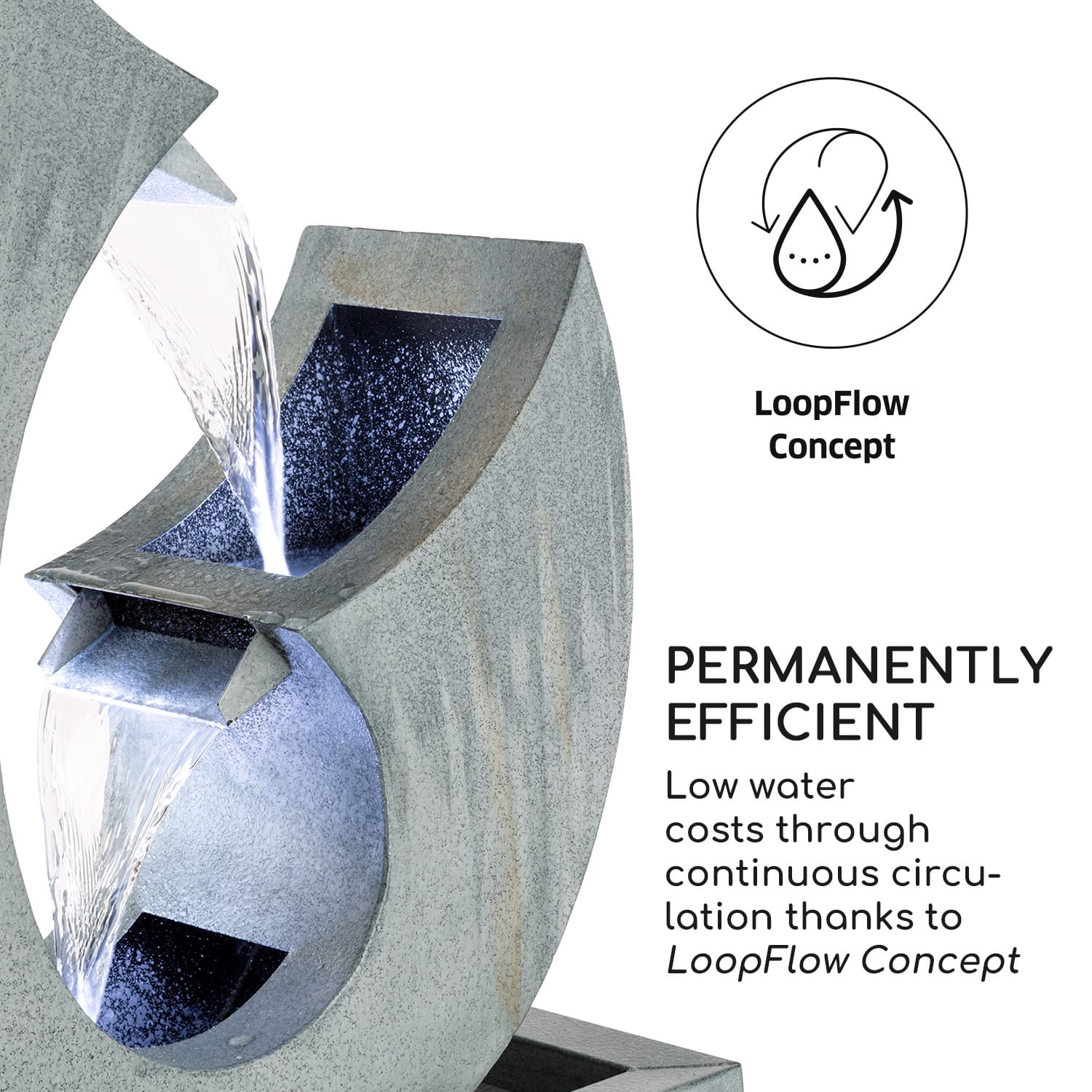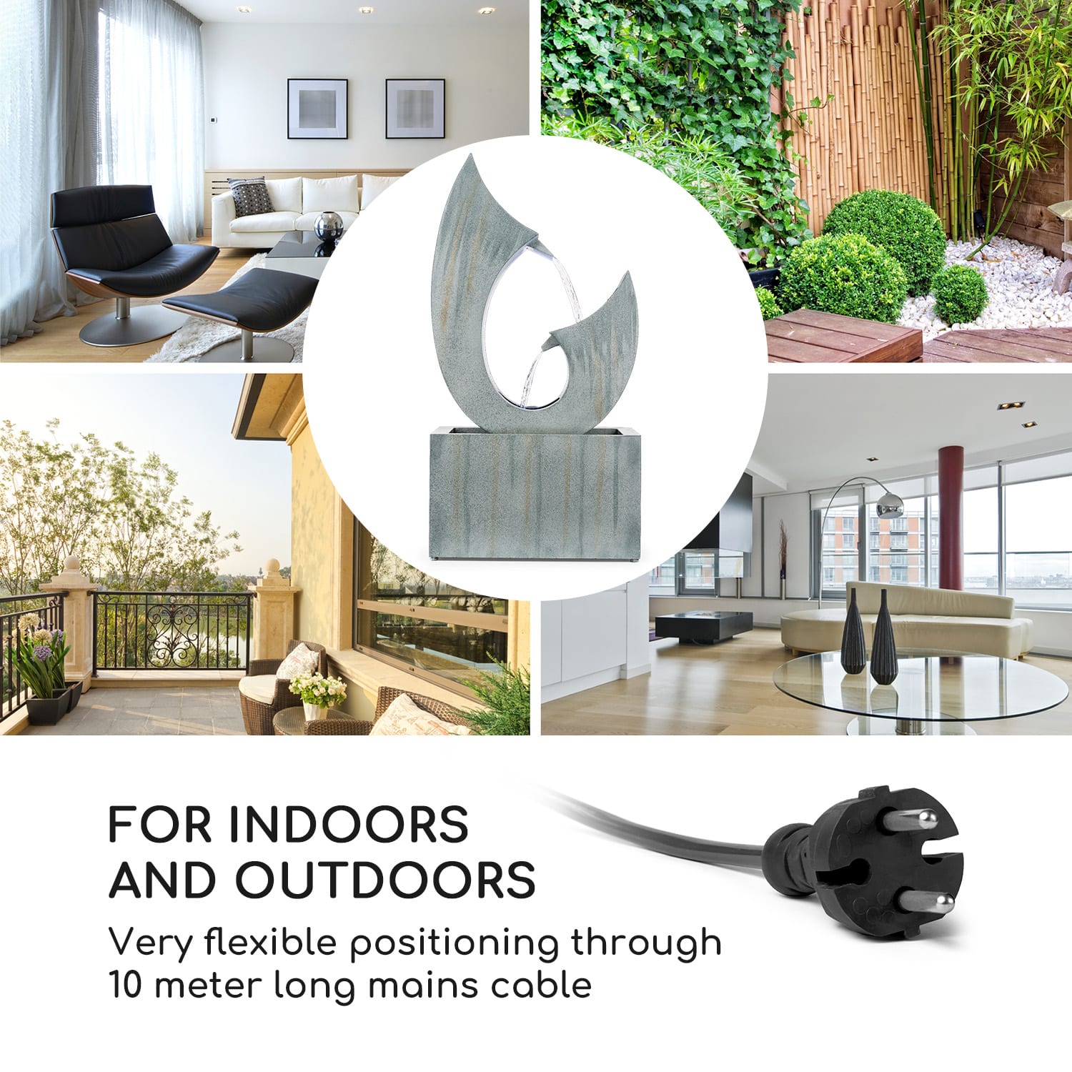 Jednoducho vypnúť a nasávať novú energiu: záhradná fontána Blumfeldt Trumpet Flow je zurčiaci prameň novej energie a záhradu, balkón či byt premení na útočisko uvoľnenia. Voda osvetlená štyrmi LEDkami zurčí v dvoch fontánkach, ktoré sa vylievajú z otvorov na koncoch do spodnej nádoby a odtiaľ opäť nahor. Tento Loopflow Concept potrebuje iba malé množstvo prúdu a je mimoriadne účinný. Svojím pekným a jasným dizajnom prináša záhradná fontána Trumpet Flow mimoriadnu eleganciu do každej domácnosti a všade sa z nej stáva pútač pozornosti. Záhradná fontána vyrobená z pozinkovaného kovu je pritom mimoriadne masívna a odolná voči poveternostným vplyvom. Aby sa vodná hra nikdy neunavila, pumpa s výkonom 8 W zabezpečí neustálu cirkuláciu vody. Vďaka extra dlhému sieťovému káblu s dĺžkou 10 m je možné záhradnú fontánu voľne umiestniť, všade si nájde perfektné miesto. Prináša oddych do záhrady aj bytu: záhradná fontána Trumpet Flow od spoločnosti Blumfeldt.