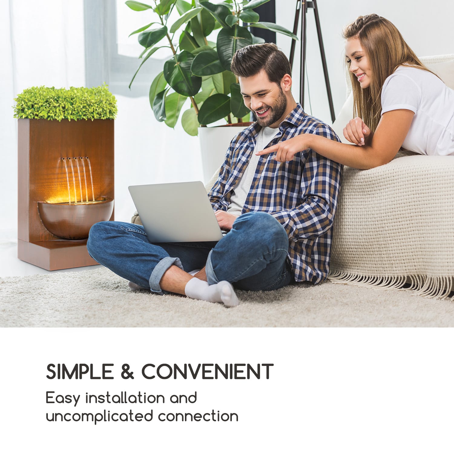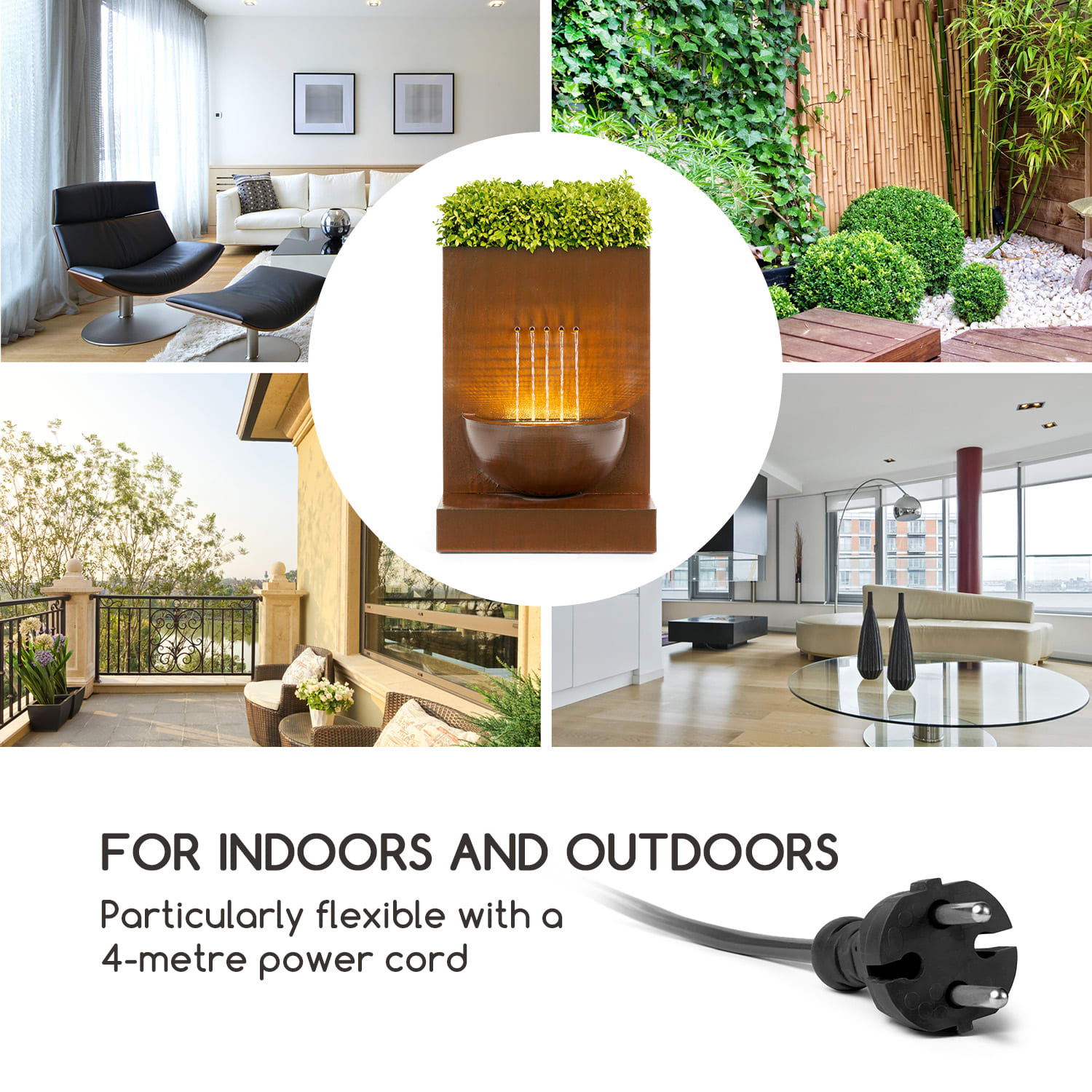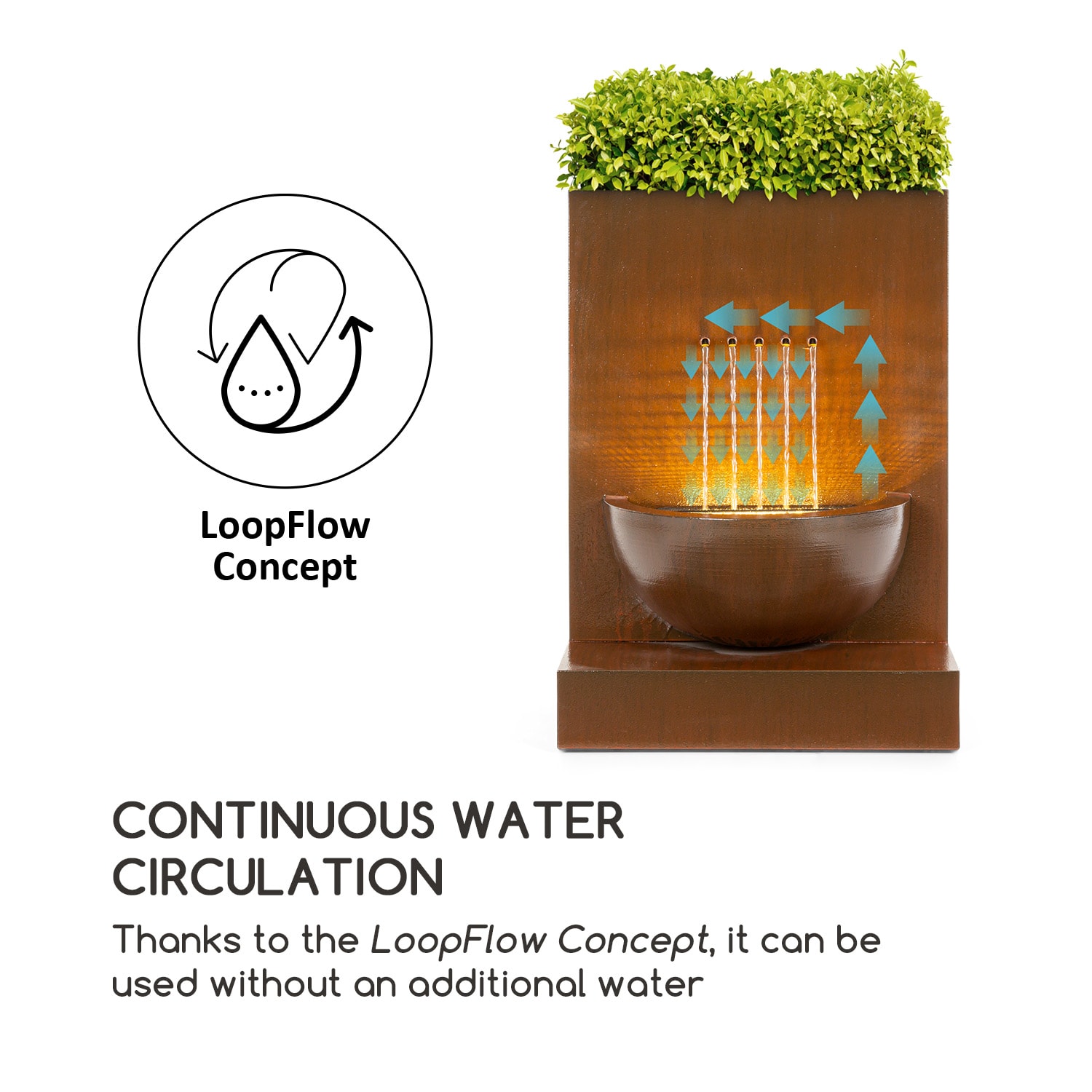 Vychutnajte si osviežujúcu zeleň čerstvých rastlín a upokojujúci prúd vody: záhradná fontána Blumfeldt Windflower do interiéru aj exteriéru kombinuje dva vitalizujúce prvky do zaujímavej konštrukcie.Prostredníctvom 5 malých otvorov padá voda v elegantnom oblúku do spodnej nádrže. 20 cm dlhá LED svetelná lišta zdola osvetľuje fontánu a pôsobivo uvádza na scénu 5 trblietavých vodných prúdov. Nad malým vodopádom je priehlbina, ktorá je určená na výsadbu kvetov alebo zelených rastlín. Kvety alebo svieža zeleň v kombinácii s nepretržitým pohybom vody zdokonalia každú záhradu aj bývanie a dodávajú im osviežujúci charakter. Materiál z pozinkovaného kovu dodáva záhradnej fontáne kvalitný vzhľad, zatiaľ čo zemité sfarbenie vyžaruje príjemnú prirodzenosť.Oddych pri pohľade na svieže rastliny a pri zvuku žblnkajúcej vody: záhradná fontána Blumfeldt Windflower robí z obytných priestorov a záhrad oázu oddychu.