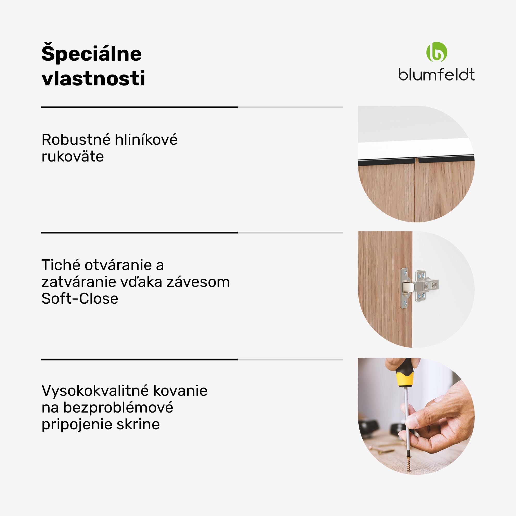 Skrinka na digestor Blumfeldt WoodVista spája funkčnosť s vysokokvalitným dizajnom, aby digestor dokonale zapadol do vašej kuchynskej linky.Skrinka je vyrobená z robustnej 16 mm drevotrieskovej dosky s ľahko udržiavateľnou melamínovou povrchovou úpravou, ktorá zaručuje odolnosť a elegantný povrch. Moderný estetický vzhľad dopĺňajú hliníkové rukoväte v matnom vyhotovení. Táto skrinka s plynovými vzperami pre hladké a užívateľsky príjemné používanie je zmesou funkčnosti a štýlu. Materiály pochádzajú z udržateľných zdrojov a ponúkajú ekologické riešenie pre moderné kuchyne. Ľahké balenie zaručuje jednoduchú prepravu a montáž, zatiaľ čo dizajn umožňuje elegantné obloženie alebo priamu integráciu digestora.Doplňte svoju kuchyňu o skrinku pre digestor Blumfeldt WoodVista, ktorá je dokonalým doplnkom k vybaveniu vašej kuchyne!