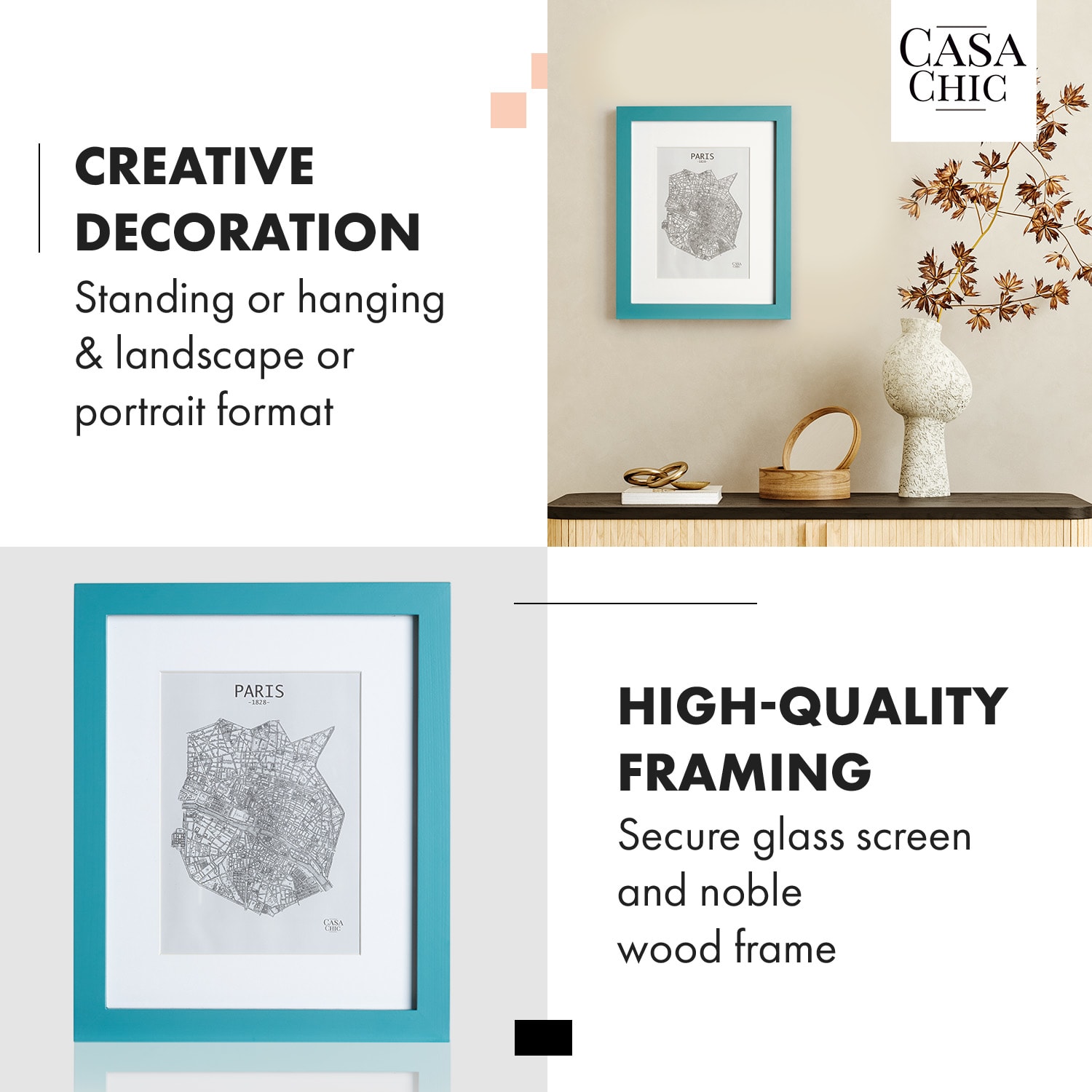 Obrazové rámy Clapton od Casa Chic by blumfeldt vnesú do vášho domova novú eleganciu. Šikovne prezentujte svoje obľúbené fotografie – s paspartou alebo bez nej: ako stojan na výšku alebo na šírku alebo ako klasický nástenný rám . Za sklenenou tabuľou sa každý obrázok stane lákadlom pre oči. Kvalitný držiak na zadnej strane umožňuje mimoriadne jednoduché vkladanie alebo výmenu obrázkov. Krásny domov pre vaše spomienky: Fotorámik Clapton od Casa Chic by blumfeldt.