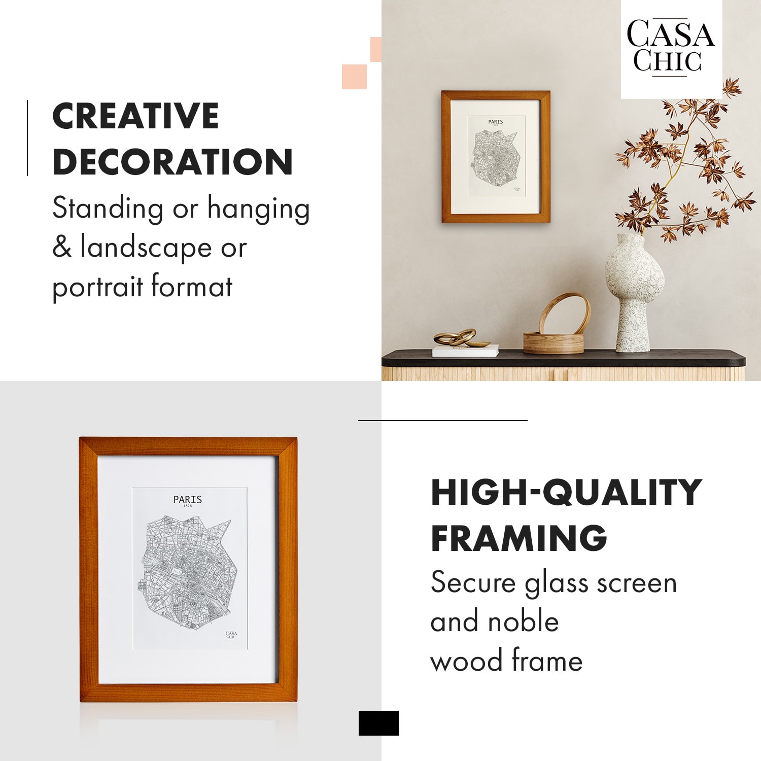 Vystavte pútavo vaše obľúbené fotky a obrazy s rámami na obrazy od Casa Chic by blumfeldt. Vysokokvalitné rámy z pravého dreva svojou jednoduchou eleganciou skrášlia steny vašej izby, príborníky alebo police. Vďaka priloženej pasparte si zvolíte vhodný výrez pre obraz na šírku alebo na výšku. Za bezpečnostným sklom budú vaše umelecké diela dokonale chránené pred prachom a nečistotami. S fotorámikmi Kenton bude každá fotografia pastvou pre oči.
