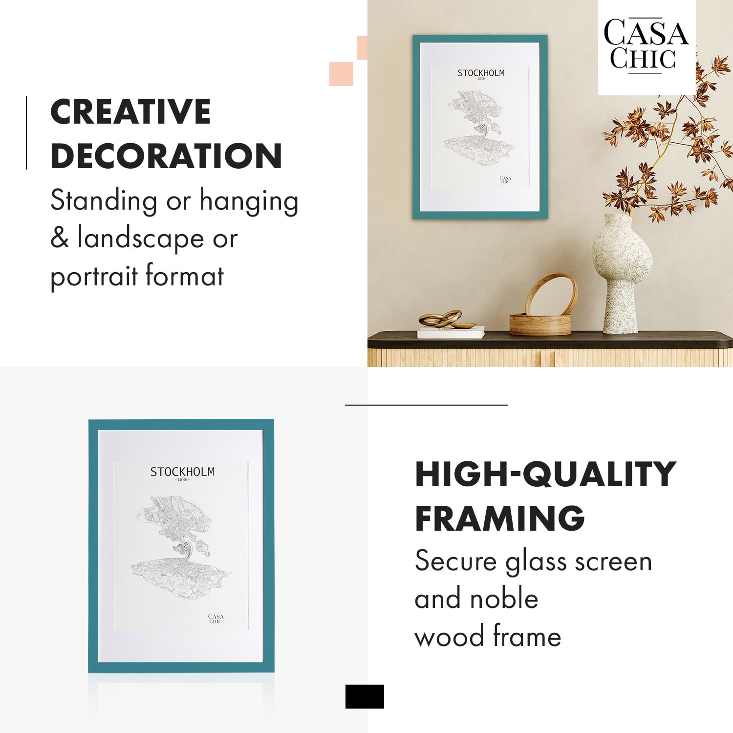 Vystavte pútavo vaše obľúbené fotky a obrazy s rámami na obrazy od Casa Chic by blumfeldt. Vysokokvalitné rámy z pravého dreva svojou jednoduchou eleganciou skrášlia steny vašej izby. Vďaka priloženej pasparte si zvolíte vhodný výrez pre obraz na šírku alebo na výšku. Za plexisklom, odolným voči rozbitiu, budú vaše umelecké diela dokonale chránené pred prachom a nečistotami. S fotorámikmi Kenton bude každá fotografia pastvou pre oči.