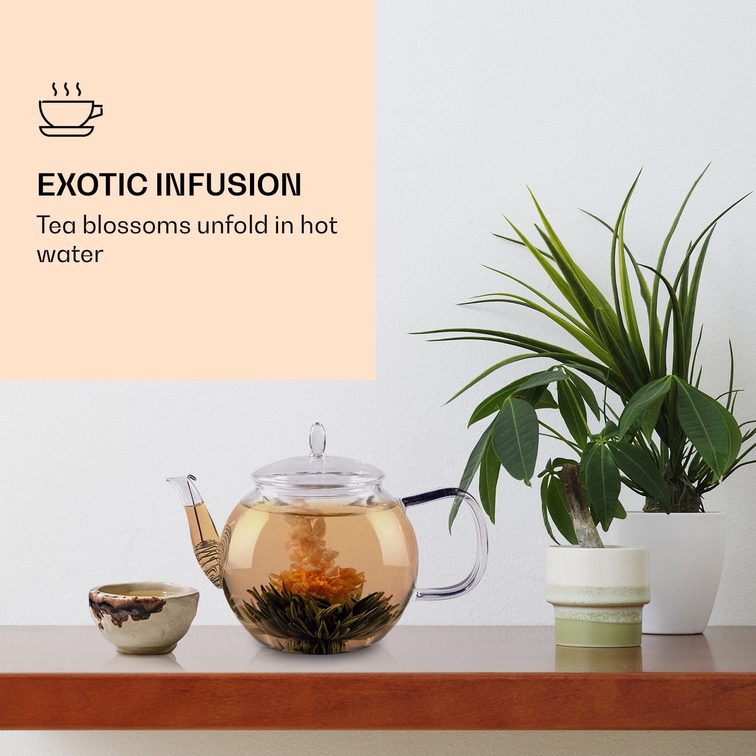 It´s tea time: exotické čajové ruže od Feelino by Klarstein očaria nielen svojou zvodnou vôňou. Čaj je v tvare guľôčok, ktoré sa po zaliatí horúcou vodou nádherne rozvinú. Každá čajová guľôčka sa otvorí a stane sa z nej nádherný kvet, ktorý je pri pohľade cez vodu farebný a očarujúci. Okrem plnej chuti čaju si môžete vychutnať aj špeciálny vizuálny zážitok. Celkovo je v balení 6 rôznych čajových kvetov jednej príchute, z ktorých každá ukazuje inú krásu kvetov. Každý čajový kvet je individuálne a vákuovo balený, aby si zachoval plnú chuť po dlhú dobu. Okrem toho je exkluzívny čaj veľmi produktívny: z jedného čajového kvetu získate až 2,5 litra čaju a kvety môžete použiť na niekoľko nálevov. Dekoratívne zabalená súprava čajových kvetov od Feelino by Klarstein je špeciálnym darčekom na mnohé príležitosti.Štýlový pôžitok z čaju s kvetinovým nádychom: exotické, čerstvo uvarené čajové kvety sa otvárajú v záplave farieb a poskytujú výnimočné chvíle pôžitku.