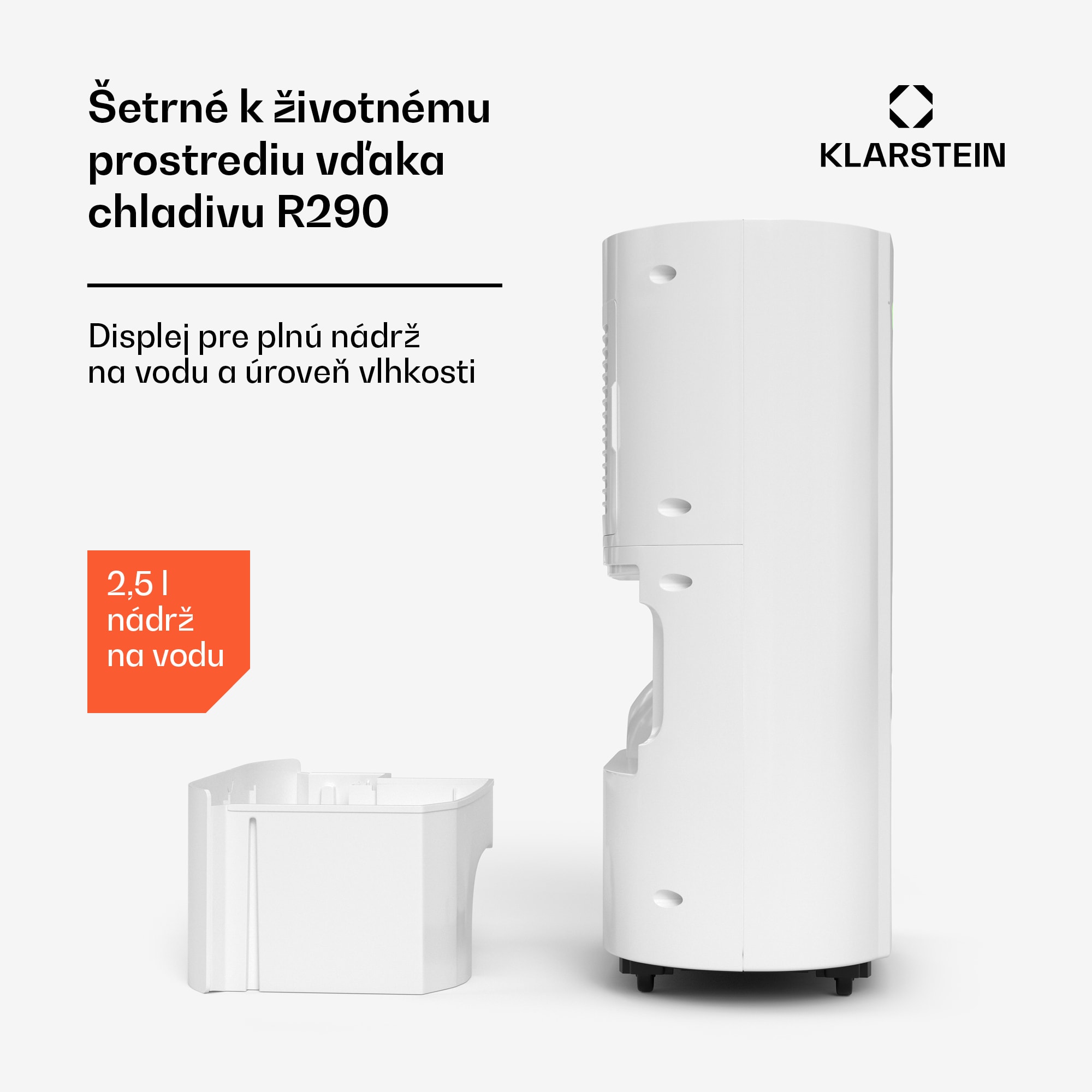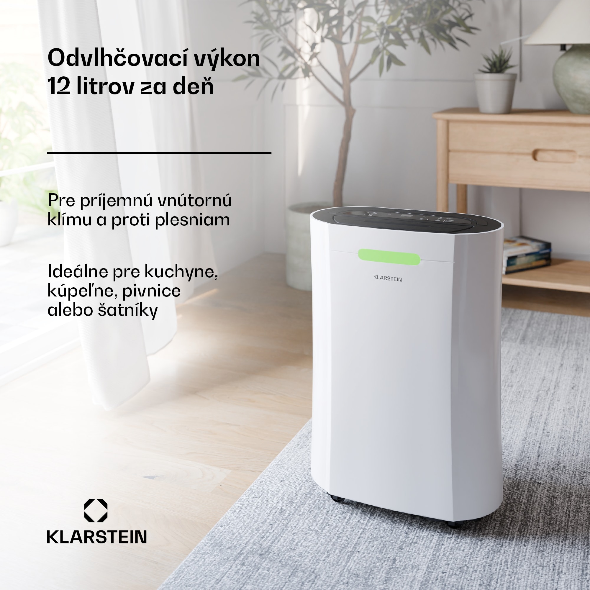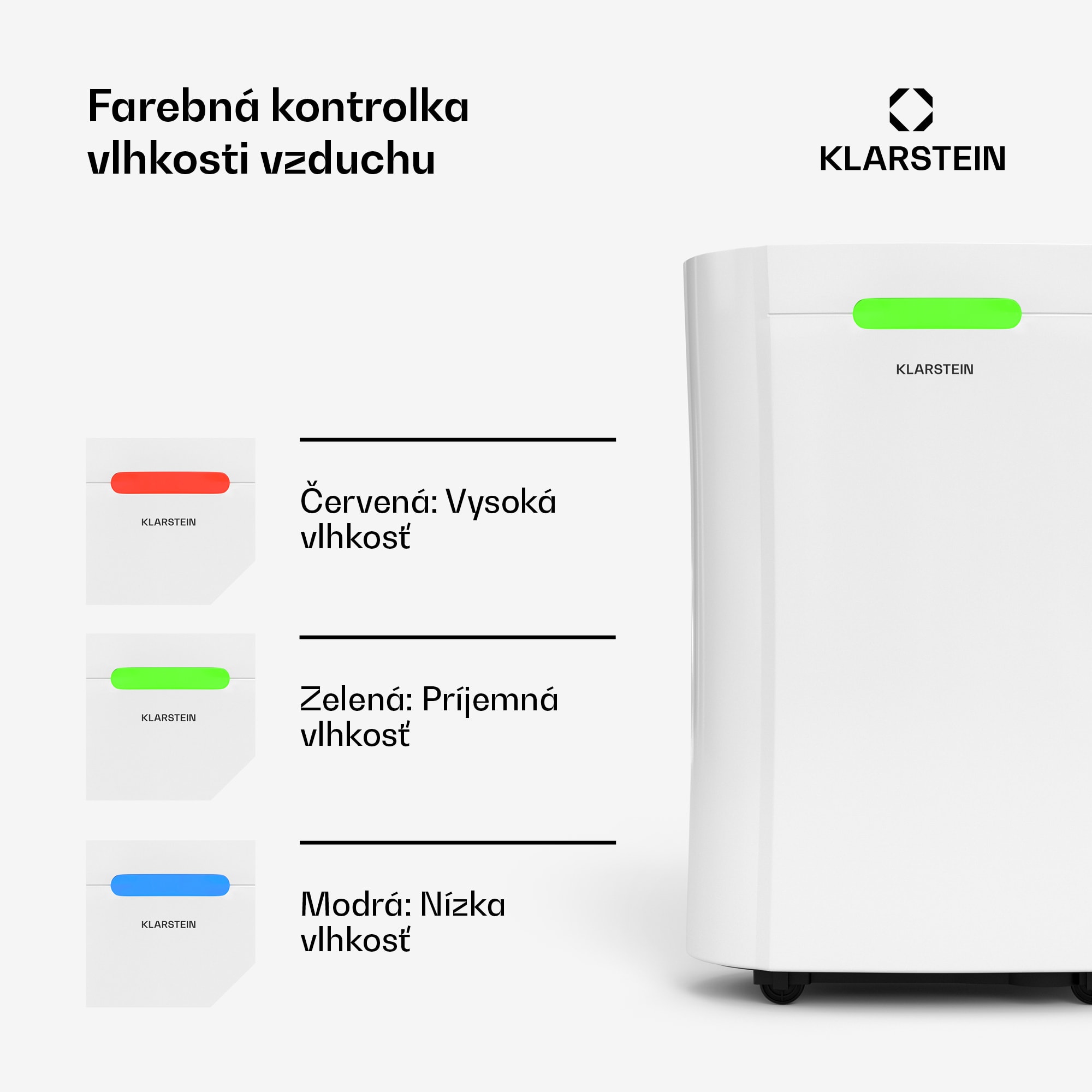 Odvlhčovač vzduchu Klarstein AeroDry Smart ponúka efektívne a inteligentné riešenie na kontrolu vlhkosti vo vašej domácnosti alebo kancelárii. S kapacitou odvlhčovania až 12 litrov za deň je ideálny pre miestnosti do 30m². Vďaka inteligentnému snímaču vlhkosti je možné nastaviť požadovanú vlhkosť v krokoch po 5 % od 35 % do 80 %, aby vaše miestnosti neboli príliš suché a spotreba energie sa minimalizovala. Trojfarebné LED indikátory vždy zobrazujú aktuálnu vlhkosť. Odvlhčovač vzduchu Klarstein AeroDry Smart sa ľahko obsluhuje a možno ho ovládať prostredníctvom WiFi, aplikácie Klarstein, Alexa alebo priamo na dotykovom paneli. 24-hodinový časovač a funkcia odloženého zapnutia a vypnutia ponúkajú dodatočný komfort.Nádrž na vodu s objemom 2,5 litra sa dá ľahko vybrať a vyprázdniť a kontrola hladiny vody automaticky vypne spotrebič, keď je nádrž plná. S prietokom vzduchu 135 m³/h a minimálnou hlučnosťou 37 dB pracuje odvlhčovač vzduchu Klarstein AeroDry Smart ticho a efektívne. Integrovaná rukoväť a štyri kolieska uľahčujú jeho prepravu. Funkcia nepretržitého odvlhčovania a uhlíkový filter zabezpečujú čistý a zdravý vzduch. Tento odvlhčovač a čistička vzduchu v jednom je nielen funkčný, ale aj spoľahlivý partner pre príjemnú klímu v miestnosti.