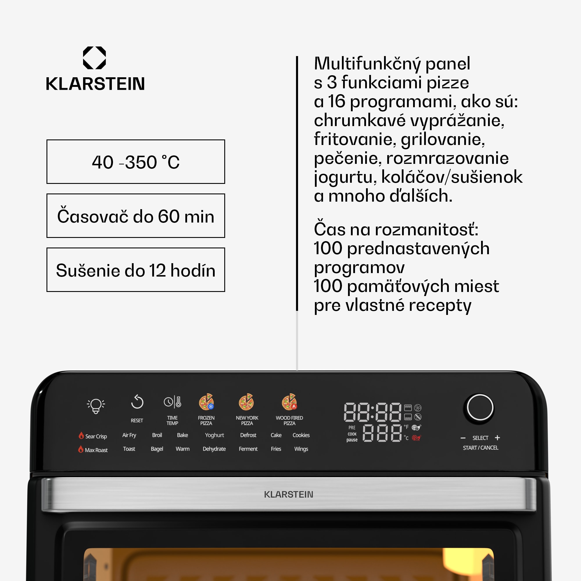 Teplovzdušná fritéza Klarstein AirGlaze Digital je ideálnym kuchynským zariadením pre gurmánov, ktorí dbajú o svoje zdravie. Vďaka inovatívnej teplovzdušnej technológii si môžete vychutnať chrumkavé pokrmy s nízkym obsahom tuku, ktoré sú rovnako chutné ako vyprážané jedlá – ale bez zbytočných kalórií.Teplovzdušná fritéza AirGlaze Digital s veľkým objemom 34 litrov a 19 prednastavenými programami vrátane špeciálnych funkcií na prípravu pizze ponúka flexibilitu a pohodlie pri príprave každého jedla. Integrovaná funkcia rotisserie zabezpečuje rovnomerné prepečenie mäsa s menším množstvom tuku a moderný dizajn s farebným digitálnym displejom a dotykovým ovládaním umožňuje presnú reguláciu teploty. Šesť robustných výhrevných telies z nehrdzavejúcej ocele a dvojité sklo dvierok zaručujú odolnosť a dokonalé výsledky varenia. Okrem toho vám čistenie uľahčí odnímateľné príslušenstvo, ktoré možno umývať v umývačke riadu, ako napríklad kameň na pizzu a grilovacie rošty.Vyskúšajte všestrannosť a pohodlie teplovzdušnej fritézy Klarstein AirGlaze Digital a urobte revolúciu vo svojej kuchyni už teraz!