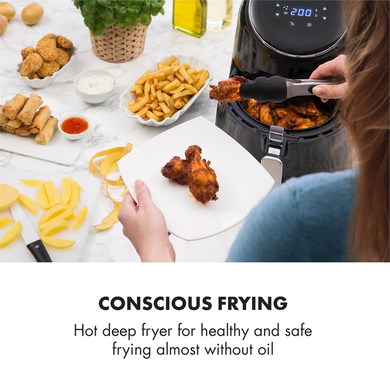 Ste pripravení na vyprážanie? Potešenie žalúdka z fritézy, no zároveň o 80% menej kalórií? Dá sa to! S teplovzdušnou fritézou Klarstein AirVital sa frituje, opeká, pečie a griluje takmer bez oleja a tuku: Chrumkavo, zdravo a chutne! Pripraviť hranolčeky, pozor, štart! Teplovzdušná fritéza Klarstein AirVital prináša revolučné fritovanie bez tuku a chuť povyšuje na novú úroveň. Jej 1300 W teplovzdušný systém používa sofistikovaný cirkulačný a prevzdušňovací systém a tým dosahuje požadované prevádzkové teploty v priebehu len 3 minút. Pomocou termostatu sa nastavuje požadovaný vykurovací výkon v krokoch po 5 °C od 80 °C do 200 °C. Potom ešte naprogramovať časovač po minútach do 60 minút a AirVital začne piecť. Pre koho je to ešte stále príliš komplikované, ten môže použiť jeden z 8 prednastavených programov: hranolčeky, slanina, kuracina, homár, steak, muffiny, huby & zelenina alebo ryby poskytujú celú škálu možností vyprážania, opekania, grilovania, pečenia. Do grilovacieho košíka sa zmestí až 2,5 kg surovín na zdravé fritovanie. Vďaka neprehrievajúcej sa rúčke môžete košík jednoducho vybrať a chrumkavé horúce lahôdky priniesť na stôl. Náš revolučný nepriľnavý povrch CeraPlus zabraňuje pripekaniu a následne uľahčuje čistenie. Digitálny displej s dotykovým ovládacím panelom veľmi zjednodušuje ovládanie a vždy zobrazuje všetky vykonané nastavenia. Nielen na jednohubky: S teplovzdušnou fritézou Klarstein AirVital sa bude fritovať, piecť a opekať zdravo a energeticky úsporne. Teplovzdušná frítéza je ideálnym riešením pre každého, kto chce kombinovať zdravý životný štýl s vynikajúcou chuťou. Dostupné farby: čierna, biela (produkt 10032331)
