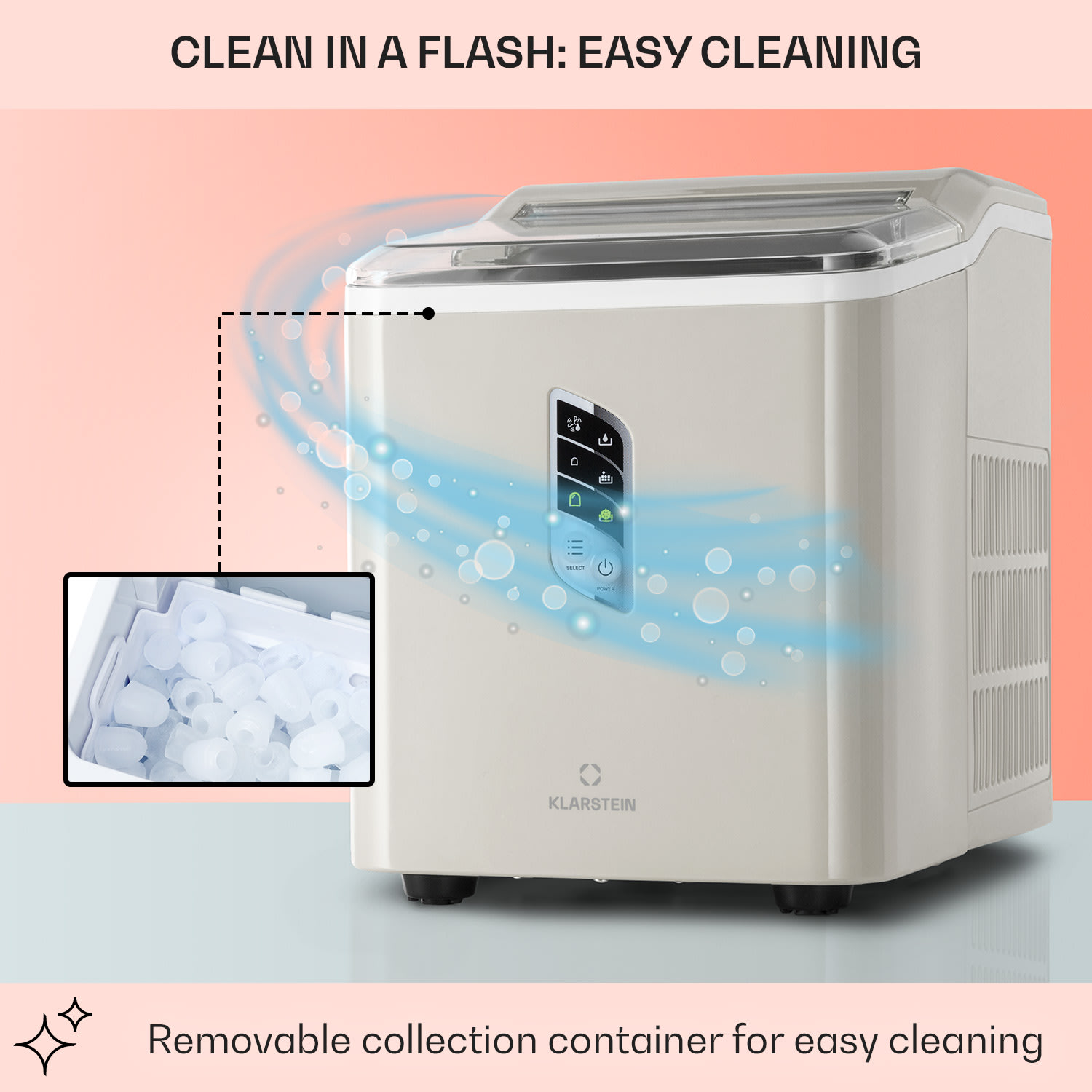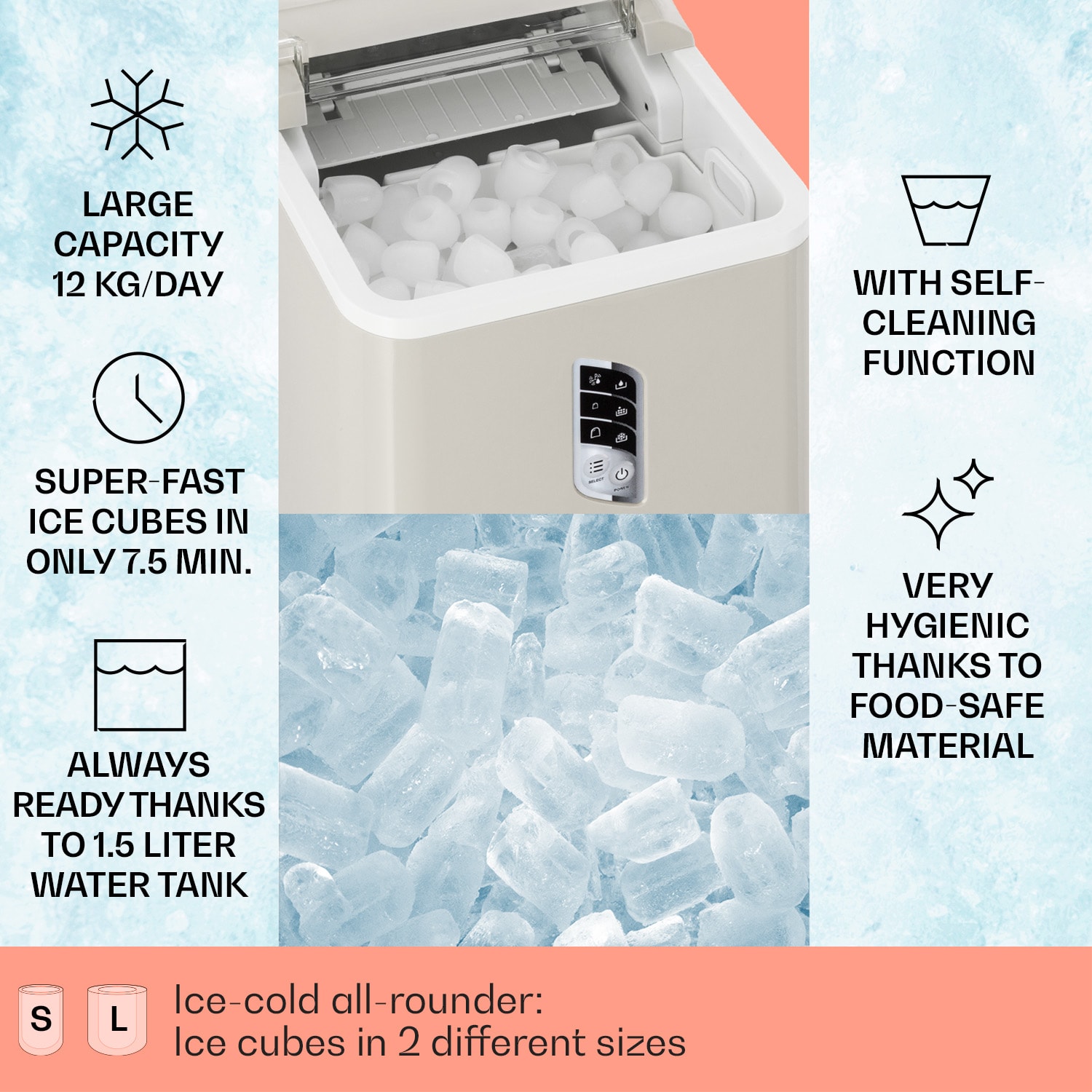 Studený ľad pre horúcu párty! S výrobníkom ľadu Klarstein Albaron budú vaše nápoje vždy osviežujúce a dobre vychladené. Za 24 hodín vyrobí výrobník ľadu až 12 kg ľadu v tvare malých alebo veľkých kociek. Jednoducho naplňte 1,5 litra vody do nádržky, zapnite a už po 9 minútach – alebo 7,5 minútach pri malých kockách – padnú prvé kocky ľadu do vyberateľnej zbernej nádoby s objemom 600 g. Kontrolky na displeji uľahčujú obsluhu a informujú vás o potrebe doplniť vodu alebo vyprázdniť zbernú nádobu. Po skončení večierka bude výrobník ľadu Albaron od Klarstein opäť čistý bez akejkoľvek námahy vďaka samočistiacemu programu. Vnútro je samozrejme úplne bez BPA.
