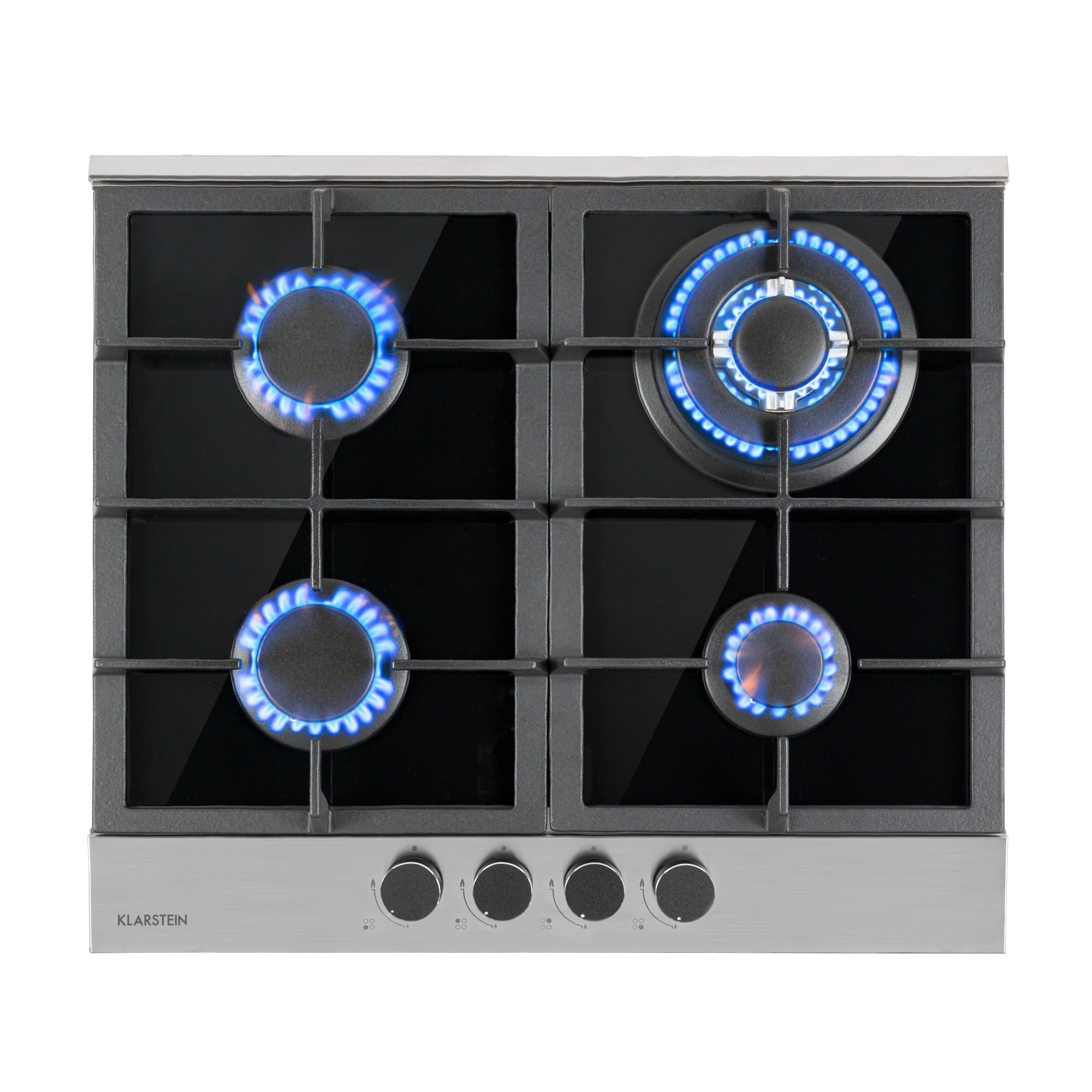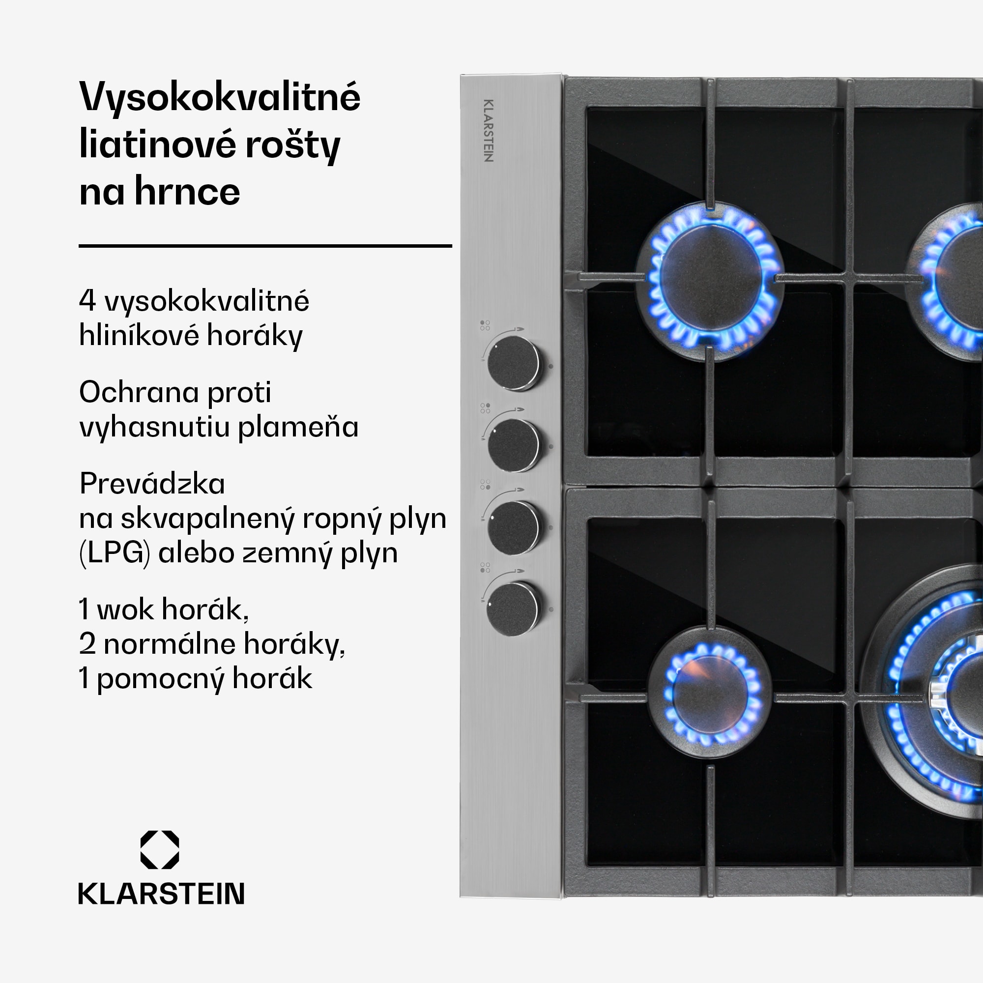 Bez ohňa pre efektívne a ekologické varenie: plynová varná doska Klarstein Alchemist prináša teraz túto možnosť do tvojej kuchyne. Cíť sa pri príprave svojich obľúbených jedál ako šéfkuchár a poteš nielen svoje chuťové poháriky, ale aj svojich hostí. Plyn je nielen efektívnejší a šetrnejší k životnému prostrediu, ale je tiež oveľa viac kontrolovateľný, a teda praktickejší ako varenie na elektrine.Elegantná varná doska má štyri kvalitné hliníkové horáky, ktoré tvoje hrnce a panvice poriadne zahrievajú s výkonom 3,4 kW, dvakrát 1,8 kW a 1 kW. Zvláštnosťou je silný horák s tromi kruhmi plameňa. Ovládanie je úplne jednoduché a intuitívne vďaka zrozumiteľným symbolom na veľkých otočných gombíkoch. Počas varenia je možné neustále upravovať prívod tepla. Bezpečnosť nadovšetko: plynový plameň sa zapáli jednoducho pomocou systému zapaľovania SnapJetIgnition, takže nie je potrebný žiaden ďalší oheň na zapálenie. Zariadenie Alchemist má okrem toho integrované monitorovanie plameňa: akonáhle by plyn unikal bez horenia plameňa, prívod plynu sa okamžite vypne. Štyri horáky rozdeľujú teplo rovnomerne do stredu a na okraje hrncov alebo panvíc, aby bolo všetko perfektne a optimálne uvarené. Pevná liatinová mriežka je vhodná pre takmer všetky typy kuchynského riadu, je umiestnená presne a bez rizika prevrátenia hrncov.Po varení je možné v prípade potreby plynovú varnú dosku jednoducho očistiť: z tohto dôvodu má zariadenie ľahko umývateľný povrch zo sklokeramiky a ušľachtilej ocele. Nielen že vyzerá neuveriteľne dobre, úžasne ľahko sa tiež čistí.Založ nový oheň na efektívne varenie pri nižších nákladoch so všetkými výhodami plynového sporáka: 4-zónová plynová varná doska Alchemist od spoločnosti Klarstein presvedčí nielen amatérskych kuchárov.
