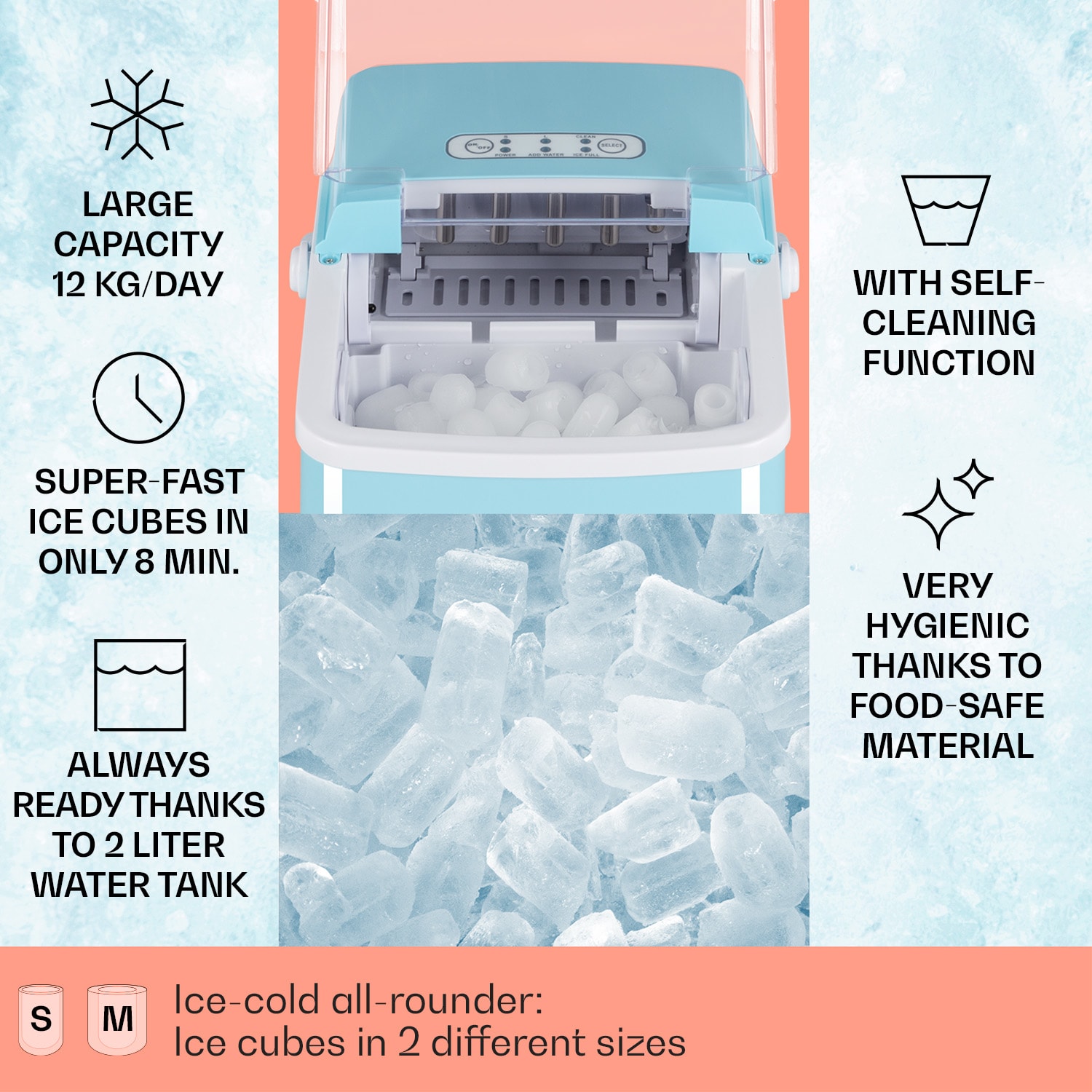 Či už na rodinnú oslavu, spoločnú párty v byte, alebo ako profesionálny výrobník ľadu v baroch alebo reštauráciách: s výrobníkom ľadu Klarstein Arctic Porter sa dajú perfektne pripraviť a vychladiť všetky nápoje.Výkonný výrobník ľadu Arctic Porter denne vyprodukuje až do 12 kg kužeľovitých kúskov ľadu a vynikajúco sa hodí na všetky párty, záhradné oslavy alebo do barov. Zariadenie Arctic Porter je vhodné aj na bežné domáce použitie. Budú s ním doma vždy k dispozícii čerstvé kocky ľadu na chladenie nápojov. V závislosti od nastavenej veľkosti S alebo L pripraví zariadenie 9 kociek ľadu v jednom cykle za 8 minút. V prípade prázdnej nádrže na vodu alebo plného zásobníka na kocky ľadu poskytujú spoľahlivé informácie kontrolky na prehľadnom dotykovom ovládacom paneli výrobníka ľadu. A kto chce mať prehľad o všetkom, môže sledovať hladinu naplnenia cez veľké priehľadné okienko bez otvárania chladiacej nádoby. Mimoriadne praktické je veľké držadlo, s ktorým sa z výrobníka ľadu stane mobilný pomocník pri príprave osvieženia. Po použití sa zariadenie Arctic Porter jednoducho čistí vďaka funkcii samočistenia a hladkej konštrukcii z ušľachtilej ocele. Elegantné prevedenie sa ideálne začlení do každého prostredia.Ľadovo studené osvieženie: s výrobníkom ľadu Arctic Porter od spoločnosti Klarstein sa dajú v okamihu pripraviť lahodné a osviežujúce nápoje na večierkoch, v reštauráciách a baroch.