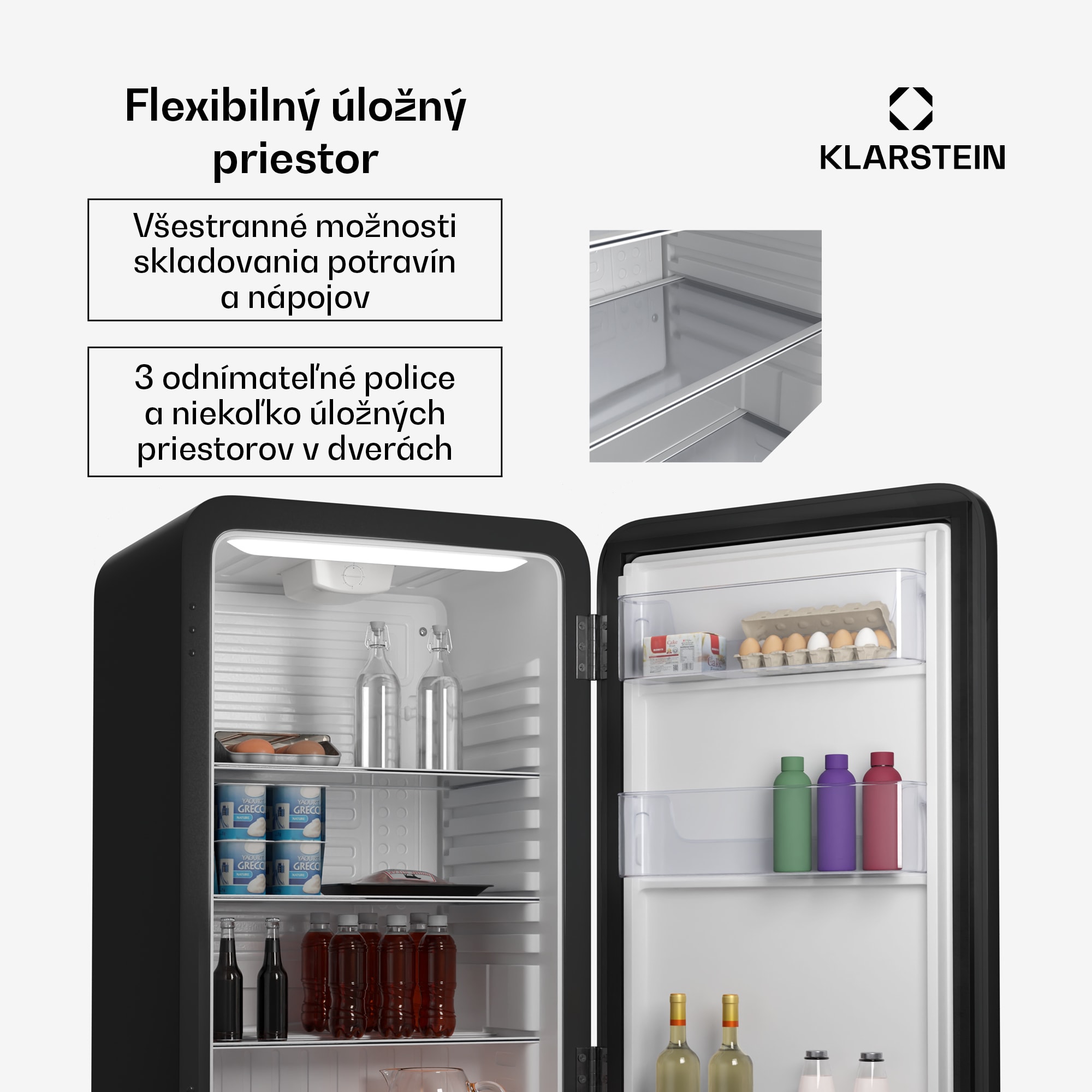 Mini chladnička Klarstein Audrey Evo kombinuje očarujúci retro dizajn s modernou technológiou. S objemom 90 litrov, nízkou hlučnosťou a flexibilnými možnosťami inštalácie je dokonalým doplnkom štýlových obytných a pracovných priestorov.Mini chladnička Audrey Evo od spoločnosti Klarstein ponúka napriek svojej kompaktnej veľkosti dostatok úložného priestoru. Odnímateľná polica a praktická priehradka vo dverách umožňujú prehľadné usporiadanie nápojov a občerstvenia. Vďaka nastaviteľným nožičkám a obojstranným dverám je chladnička mimoriadne prispôsobivá – ideálna do miestností s obmedzeným priestorom, ako sú hotelové izby, kancelárie alebo pivnice na párty.Vintage dizajn vnesie do každého prostredia nádych nostalgie. Chladnička pracuje s výkonným kompresorovým chladiacim systémom a vďaka mechanickému termostatu umožňuje presnú reguláciu teploty od 0 °C do 10 °C. S prevádzkovou hlučnosťou iba 40 dB je dostatočne tichá na to, aby nerušila ani pri odpočinku, ani pri práci.Kúpte si mini chladničku Klarstein Audrey Evo – kompaktná, tichá a štýlová do každého prostredia.