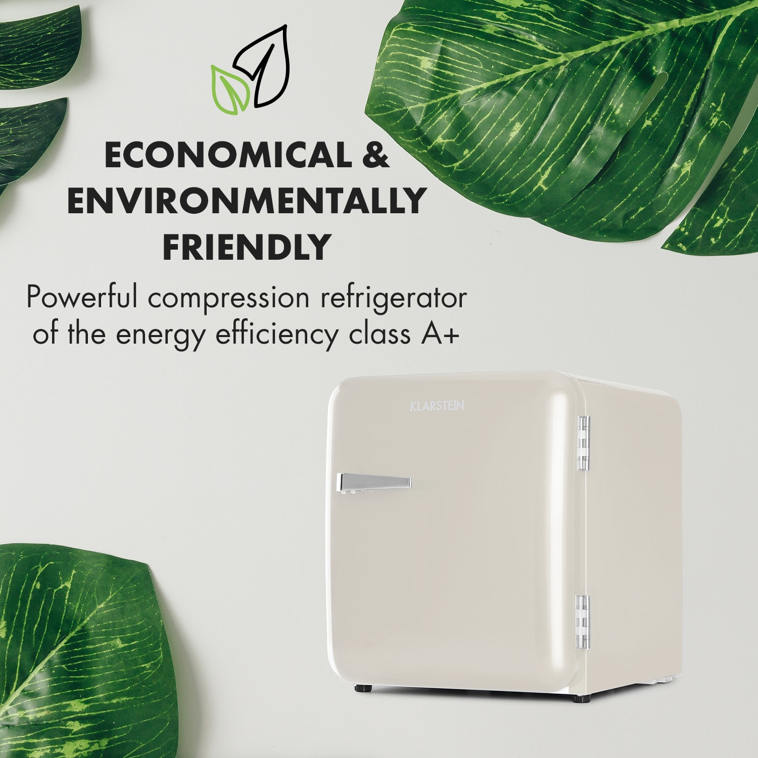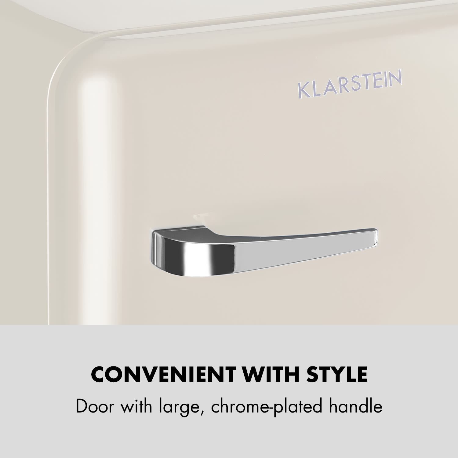 Mini chladnička Klarstein Audrey Mini teraz prináša retro vzhľad do každej kuchyne! Tento návrat do 50. rokov poskytuje nielen veľký úložný priestor pre chladené nápoje a čerstvé potraviny, ale zároveň dodáva svojím vzhľadom šarm každej malej rodinnej kuchyni alebo kuchyniam jednotlivcov, hosťovským izbám či víkendovým domčekom a to všetko s nízkymi nárokmi na miesto. Štýlové zariadenie si Vás získa elegantnou retro sviežosťou. 48 litrov úložného priestoru poskytuje dostatok priestoru v retro chladničke Klarstein Audrey Mini. Poriadok v chladničke udržujú 2 police ako aj 2 priečinky vo dverách na fľaše, poháre a plechovky. Všetko je zavŕšené koncepciou Vint-Age Concept: zaoblené tvary a pochrómovaná rukoväť dverí prinášajú štýl 50. rokov do súčasnosti. Pre správny stupeň čerstvosti sa dá teplota nastaviť medzi 0 a 10 °C. Priestorovo úsporná chladnička s mrazničkou nepospotrebuje 1,21 GW, ale vďaka svojej modernej, tichej kompresnej chladiacej technológii využíva úsporný výkon v triede energetickej účinnosti D, čo je v záujme životného prostredia aj Vašej peňaženky. Doplnok vo Vašej domácnosti: chladnička Klarstein Audrey Mini premení kuchyňu na skutočné retro bistro z 50. rokov.