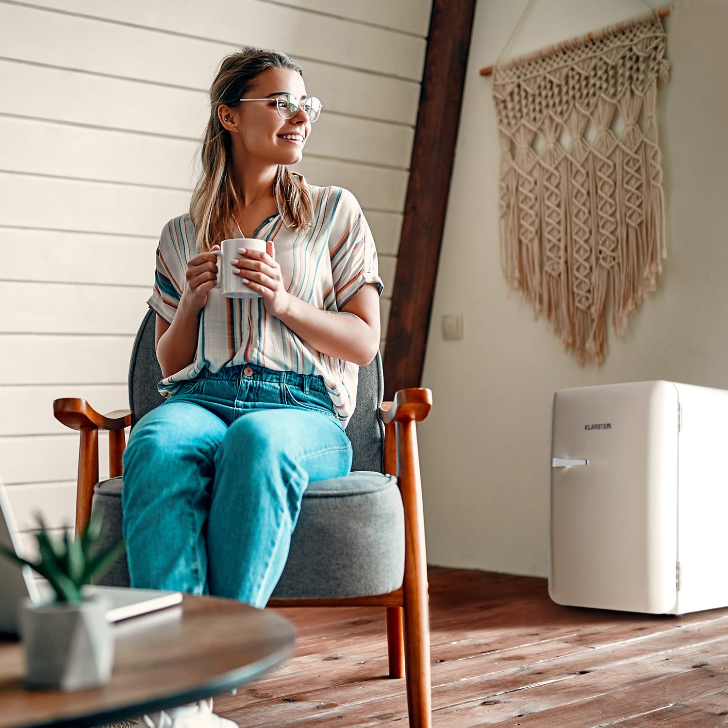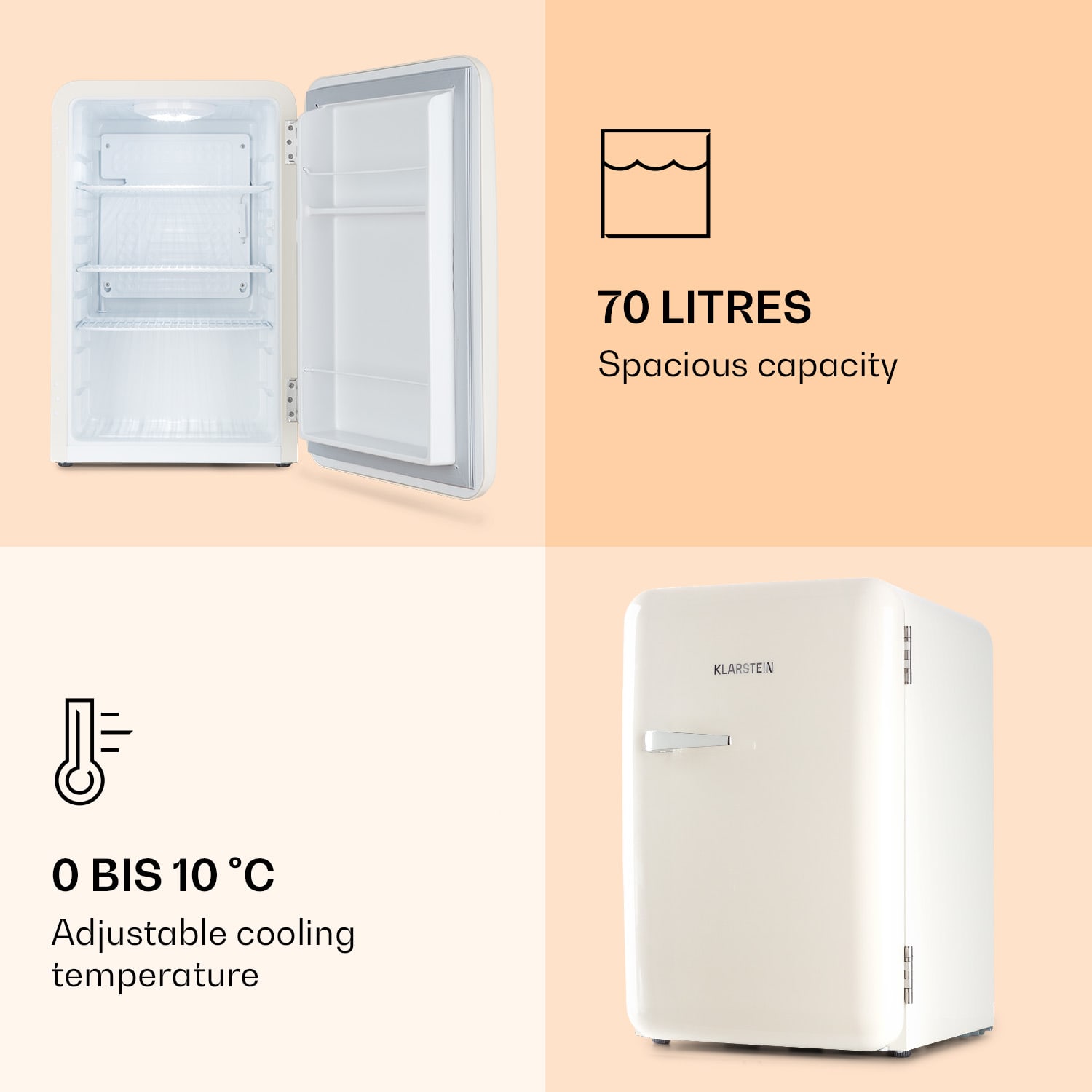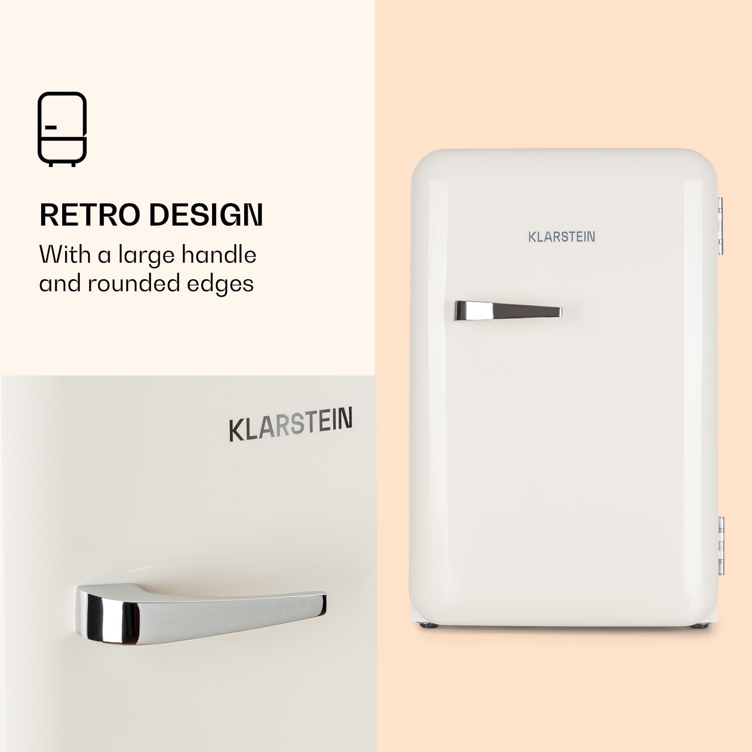 S farebnou a štýlovou chladničkou Audrey od Klarstein vytvoríte vo vašej domácnosti nový štýl. Či už v kuchyni, v kancelárii alebo v izbe pre hostí: priestrannú chladničku Audrey môžete vďaka jej kompaktným rozmerom použiť kdekoľvek. Táto mini chladnička s veľkou rukoväťou na prednej strane dotvára vzhľad 50. rokov. 70 litrov úložného priestoru ponúka dostatok miesta a poriadok zabezpečujú 4 poschodia s tromi nastaviteľnými mriežkovými policami, ako aj 2 priehradky vo dverách na fľaše, poháre a plechovky. Vďaka vnútornému osvetleniu máte vždy prehľad o svojich potravinách, nápojoch a občerstvení. Svieža a štýlovo verná: Chladnička Audrey od Klarstein je ako osviežujúca cesta späť v čase do 50. rokov.