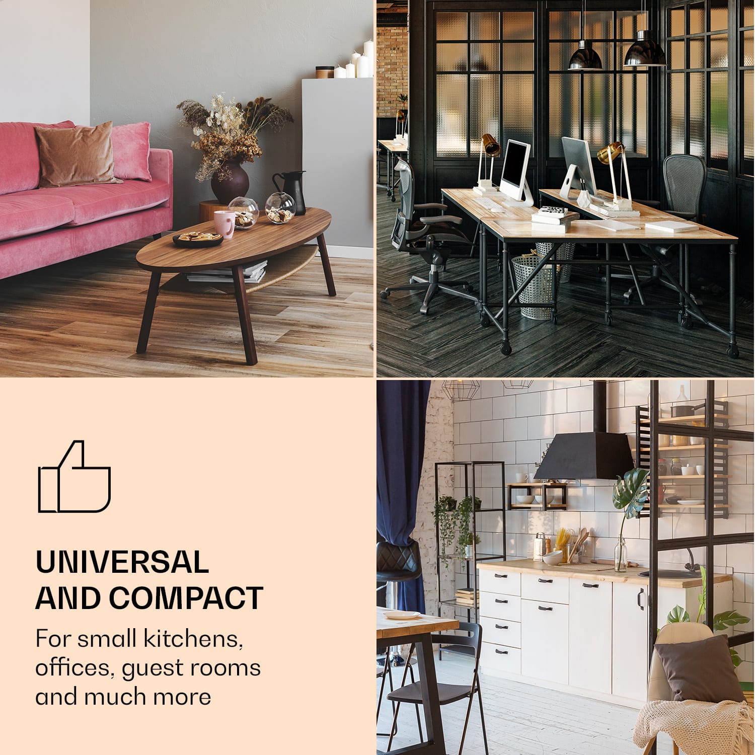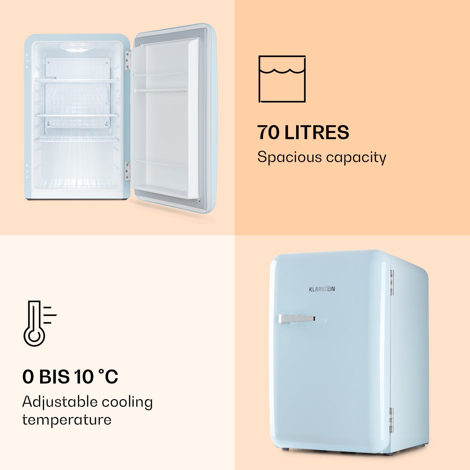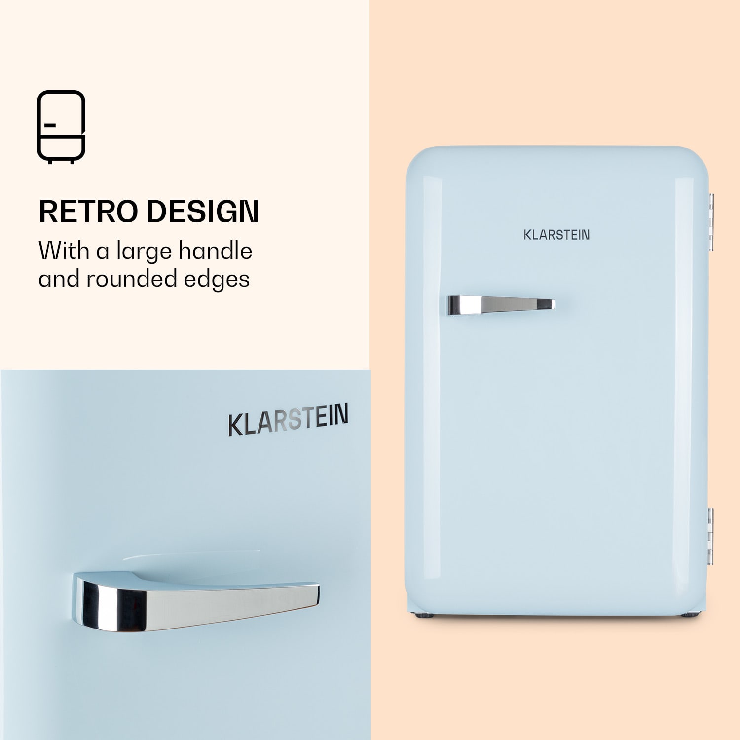 S farebnou a štýlovou chladničkou Audrey od Klarstein vytvoríte vo vašej domácnosti nový štýl. Či už v kuchyni, v kancelárii alebo v izbe pre hostí: priestrannú chladničku Audrey môžete vďaka jej kompaktným rozmerom použiť kdekoľvek. Táto mini chladnička s veľkou rukoväťou na prednej strane dotvára vzhľad 50. rokov. 70 litrov úložného priestoru ponúka dostatok miesta a poriadok zabezpečujú 4 poschodia s tromi nastaviteľnými mriežkovými policami, ako aj 2 priehradky vo dverách na fľaše, poháre a plechovky. Vďaka vnútornému osvetleniu máte vždy prehľad o svojich potravinách, nápojoch a občerstvení. Svieža a štýlovo verná: Chladnička Audrey od Klarstein je ako osviežujúca cesta späť v čase do 50. rokov.