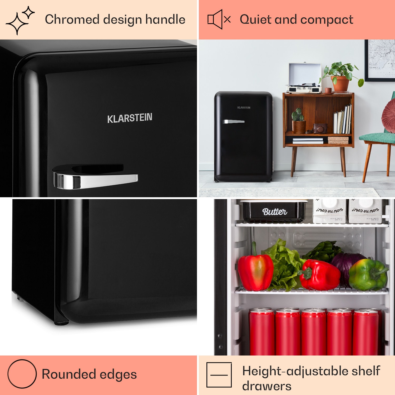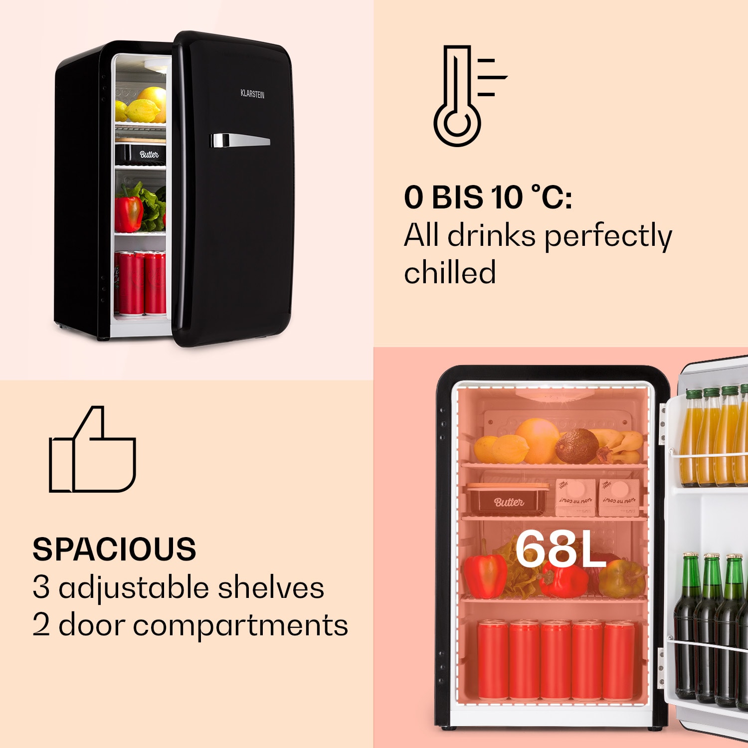 S farebnou a štýlovou chladničkou Audreyod Klarstein vytvoríte vo vašej domácnosti nový štýl. Či už v kuchyni, v kancelárii alebo v izbe pre hostí: priestrannú chladničku Audrey môžete vďaka jej kompaktným rozmerom použiť kdekoľvek. Táto mini chladnička s veľkou rukoväťou na prednej strane dotvára vzhľad 50. rokov. 70 litrov úložného priestoru ponúka dostatok miesta a poriadok zabezpečujú 4 poschodia s tromi nastaviteľnými mriežkovými policami, ako aj 2 priehradky vo dverách na fľaše, poháre a plechovky. Vďaka vnútornému osvetleniu máte vždy prehľad o svojich potravinách, nápojoch a občerstvení. Svieža a štýlovo verná: Chladnička Audrey od Klarstein je ako osviežujúca cesta späť v čase do 50. rokov.