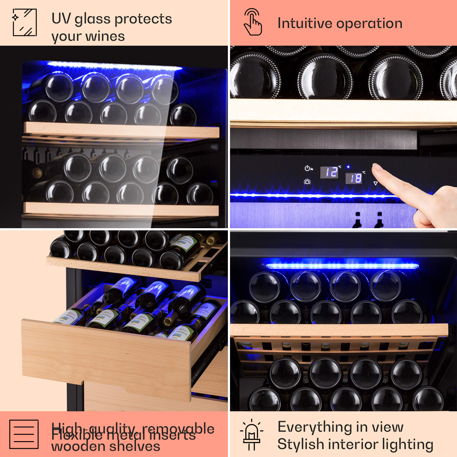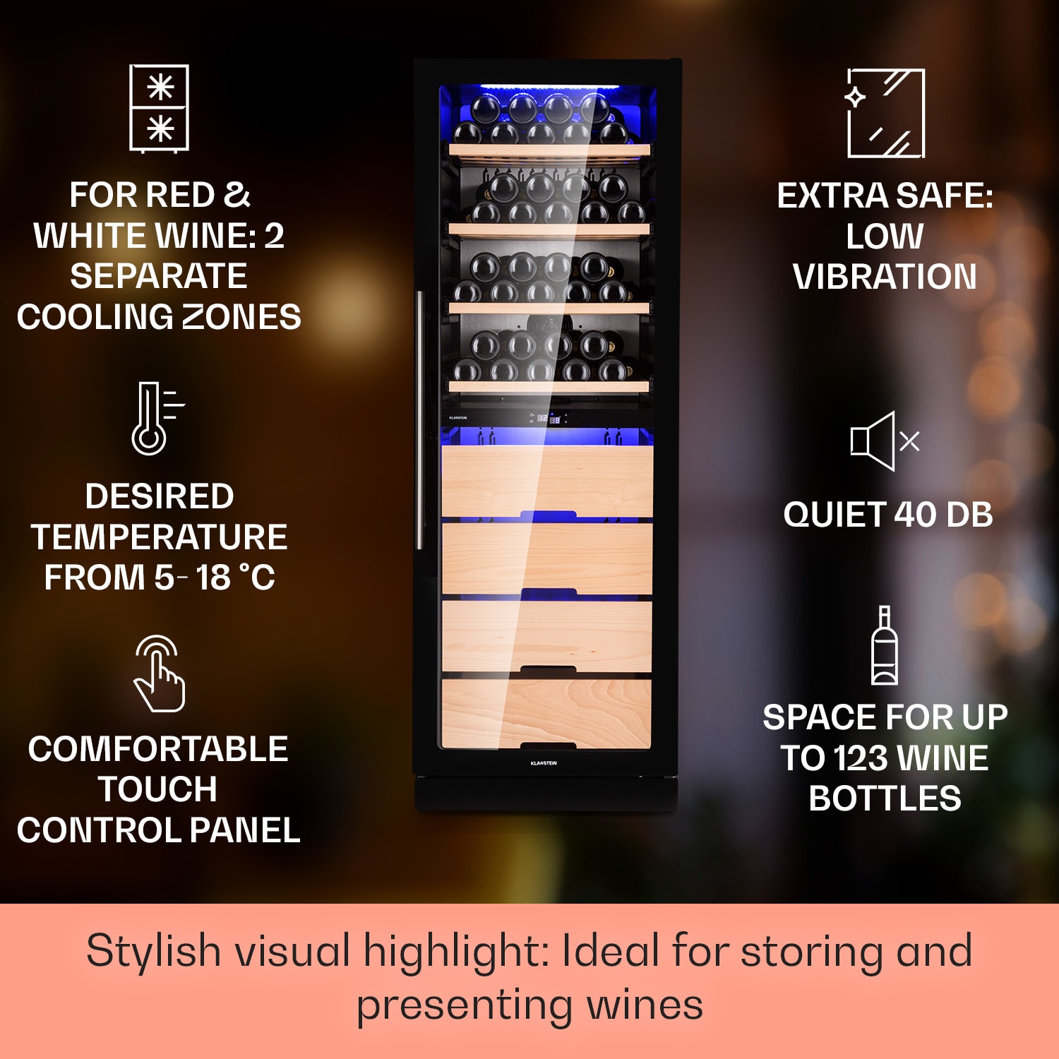 Vždy s ideálnou teplotou: vďaka dvom rôznym chladiacim zónam môžete mať s vinotékou Barossa 123 Duo od Klarstein vždy perfektne vychladené víno v správny čas. Táto dvojzónová vinotéka umožňuje v hornej a dolnej chladiacej zóne ochladiť až 123 fliaš vína. Čierna sklenená predná časť s panoramatickým oknom z bezpečnostného skla s UV ochranou, zabezpečuje štýlovú prezentáciu vínnych pokladov. Zapínateľné vnútorné osvetlenie šikovne prezentuje uložené fľaše.