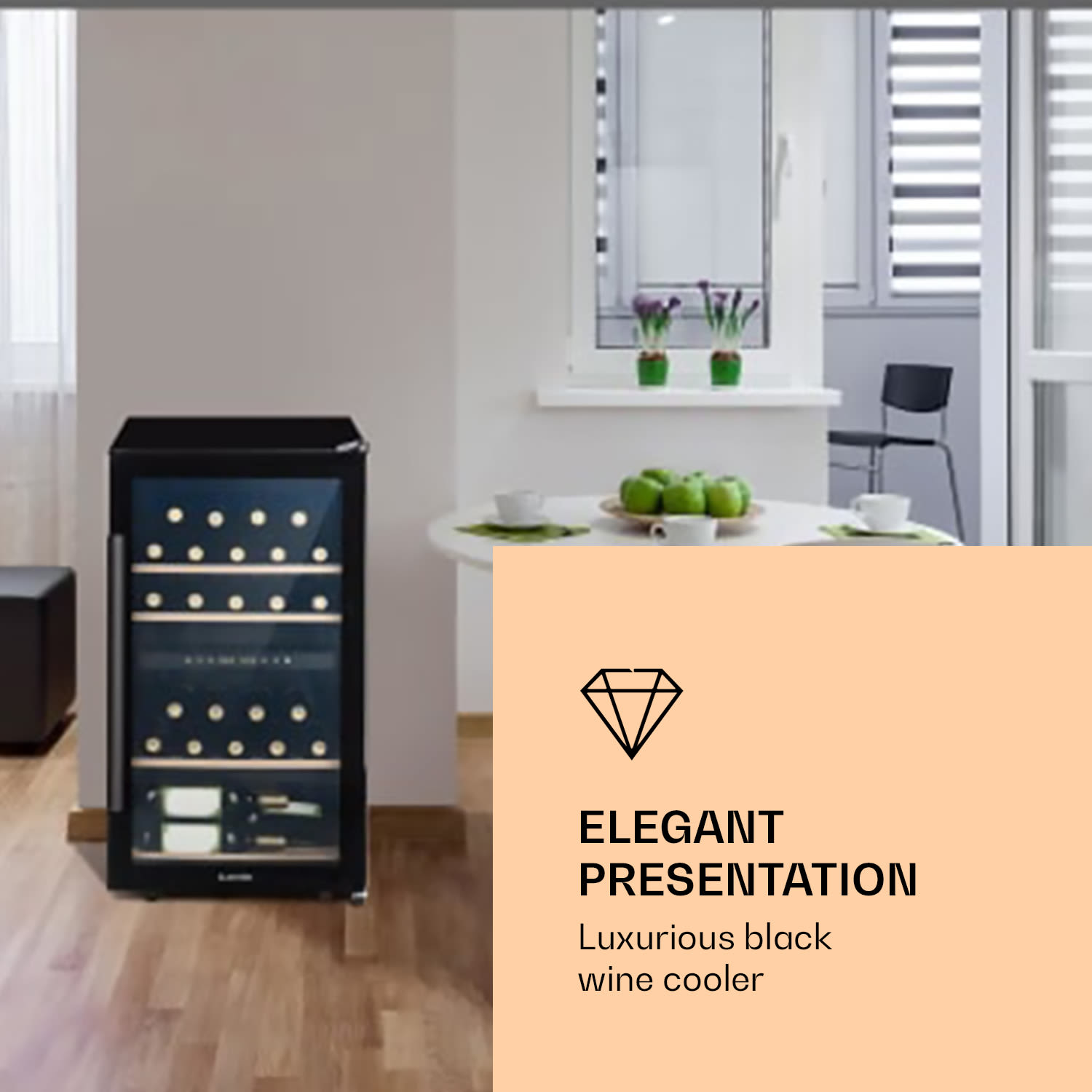 Vždy perfektne vychladené: vďaka dvom rozdielnym chladiacim zónam vinotéky Klarstein Barossa 34 Duo si vaše víno počká na ten správny čas.Pre plné uvoľnenie chutí a arómy sa musí víno vychladiť na vhodnú teplotu. Vďaka dvojzónovej vinotéke Klarstein Barossa 34 Duo je to celkom jednoduché – a to v štýlovej podobe. Dve chladiace zóny ponúkajú úložné miesto pre max. 34 fliaš vína na štyroch vysúvateľných drevených roštoch. Teplotu jednoducho nastavíte na dotykovom ovládacom paneli s LCD displejom, čo umožňuje precízne vychladenie bieleho, červeného alebo ružového vína. Korunovanú prezentáciu vína zabezpečujú panoramatické sklené dvierka z bezpečnostného skla s čiernym orámovaním. Zapínateľné vnútorné osvetlenie nechá skladované fľaše skutočne vyniknúť. Vďaka tomu je vinotéka vhodná aj na vystavenie v bare alebo reštaurácii.Pre milovníkov a pôžitkárov: vinotéka Klarstein Barossa 34 Duo ponúka štýlové miesto pre víno, sekty a iné nápoje.Tvar fliaš na víno ovplyvňuje maximálny objem a kapacitu vinotéky.