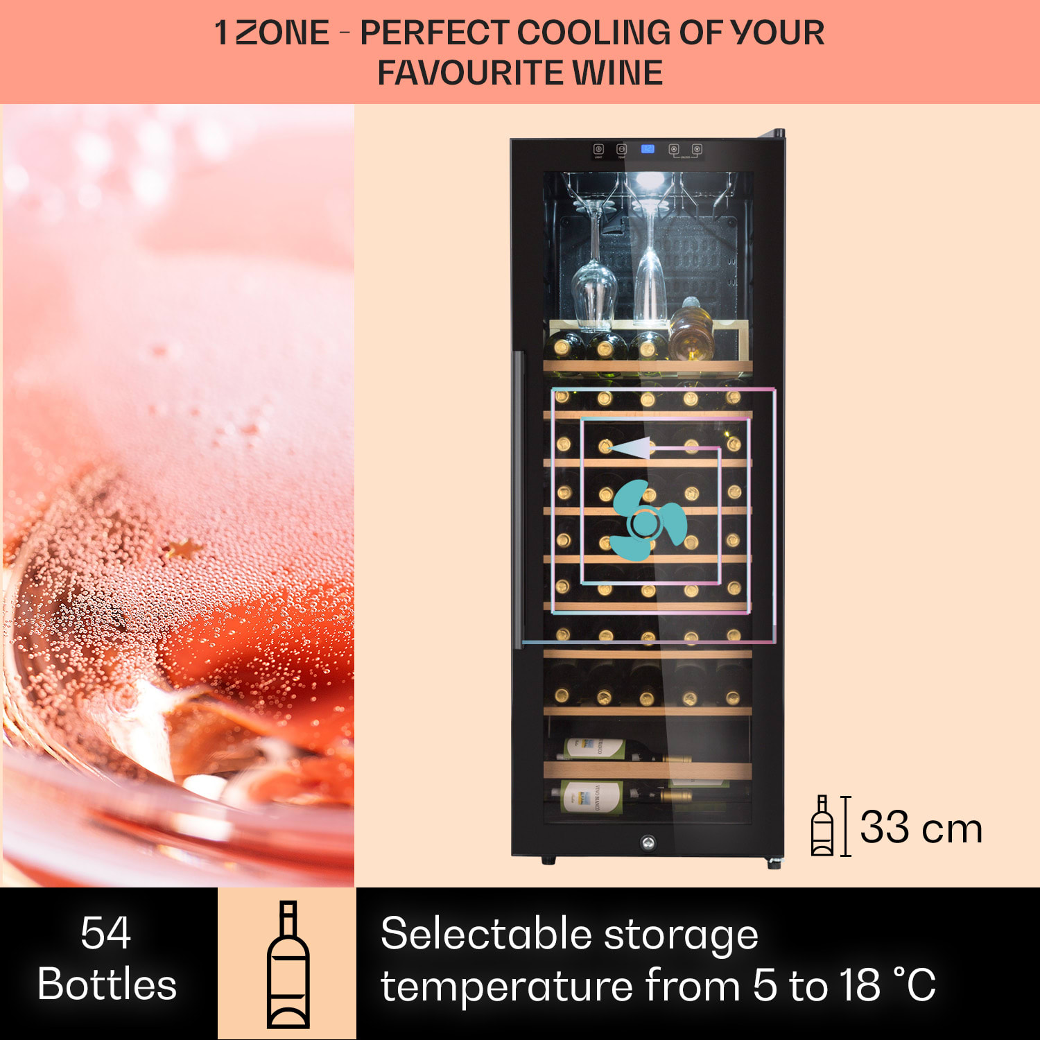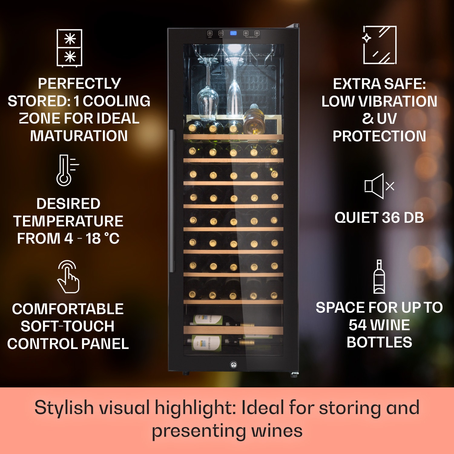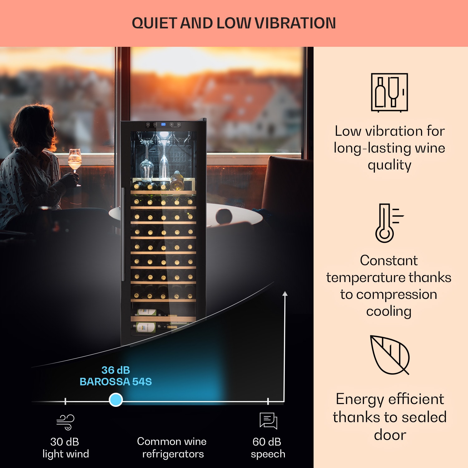 Z lásky k vínu: Vinotéka Barossa 54 Uno od Klarstein zaručuje ten najlepší pôžitok. Vínam dodá ideálnu teplotu na pitie a poháre v nej môžete dokonca vopred vychladiť. Vďaka dotykovému ovládaciemu panelu s LC displejom je ovládanie veľmi pohodlné a fľaše sú bezpečne uložené na výsuvných drevených policiach. Vstavaná vinotéka je ideálnym riešením pre každého milovníka vína. Skladované v chlade a výborne prezentované: Zásoby vína v chladničke na víno Barossa 54 Uno od Klarstein!