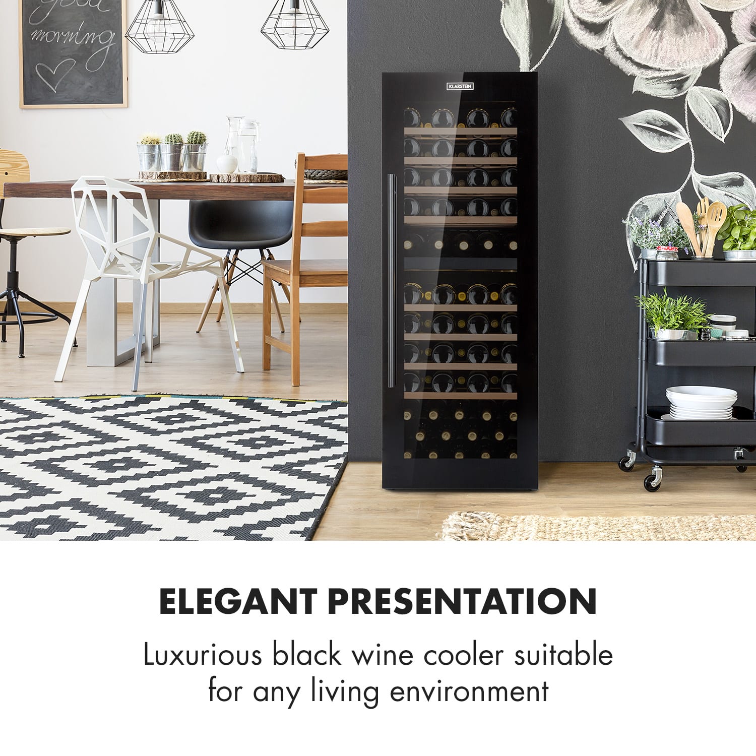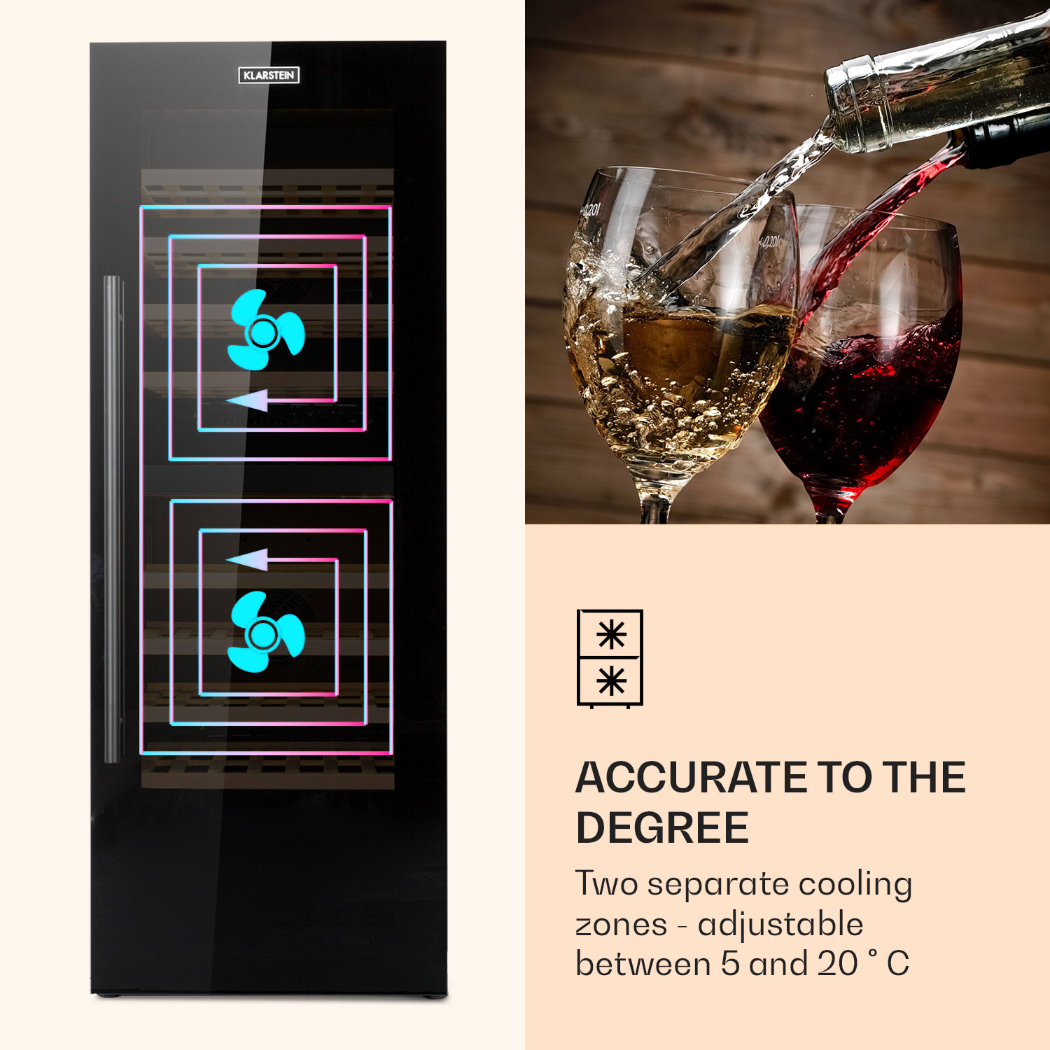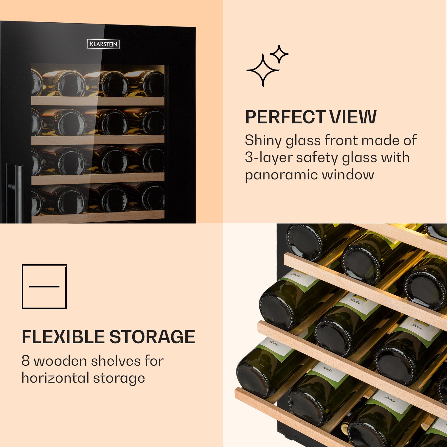 Vinotéka Klarstein Barossa 77 Duo premení dobré víno na veľkolepý pôžitok. Jej veľký interiér poskytuje atraktívny a dobre temperovaný domov až pre 77 fliaš vína na 8 vyberateľných drevených policiach. Vďaka dvom oddeleným chladiacim zónam sa biele i červené vína cítia rovnako dobre doma a plne rozvinú svoju individuálnu arómu medzi 5 a 20 °C. Táto Dvojzónová vinotéka umožňuje nastaviť teplotu pomocou prehľadného dotykového panela s LCD displejom. Vďaka prepínateľnému vnútornému osvetleniu LED, veľkým panoramatickým preskleným dverám a jednoduchému dizajnu sa Barossa 77 Duo stane skutočne pútavou ozdobou vašej domácnosti.