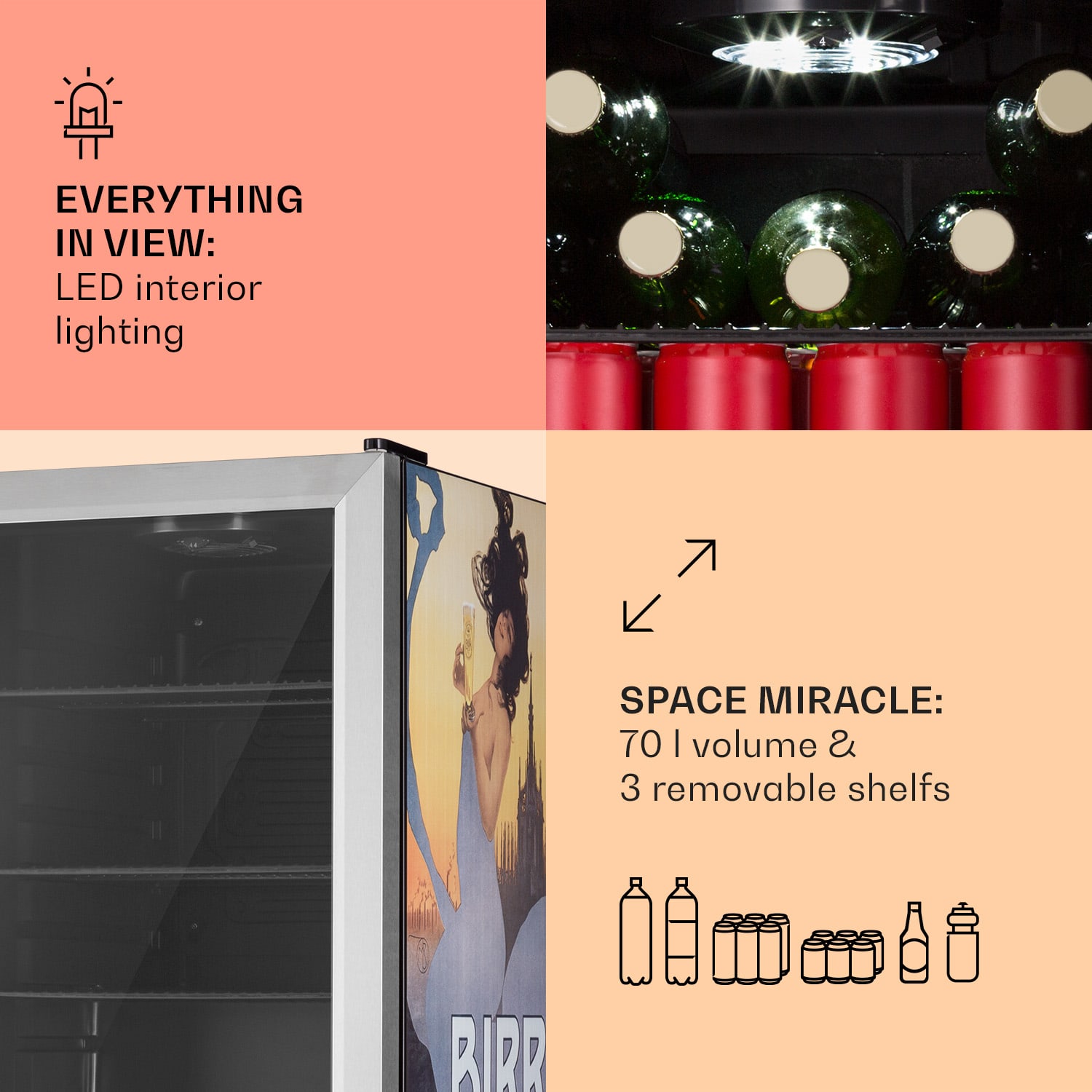 Klarstein Beersafe 70 Birra Milano Edition, chladnička, 70 litrov, 3 police, panoramatické sklenené dvere, nehrdzavejúca oceľ – Kúpiť