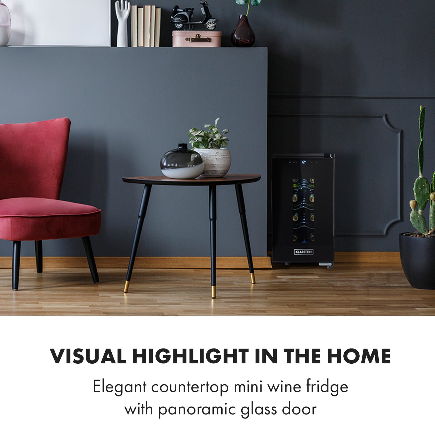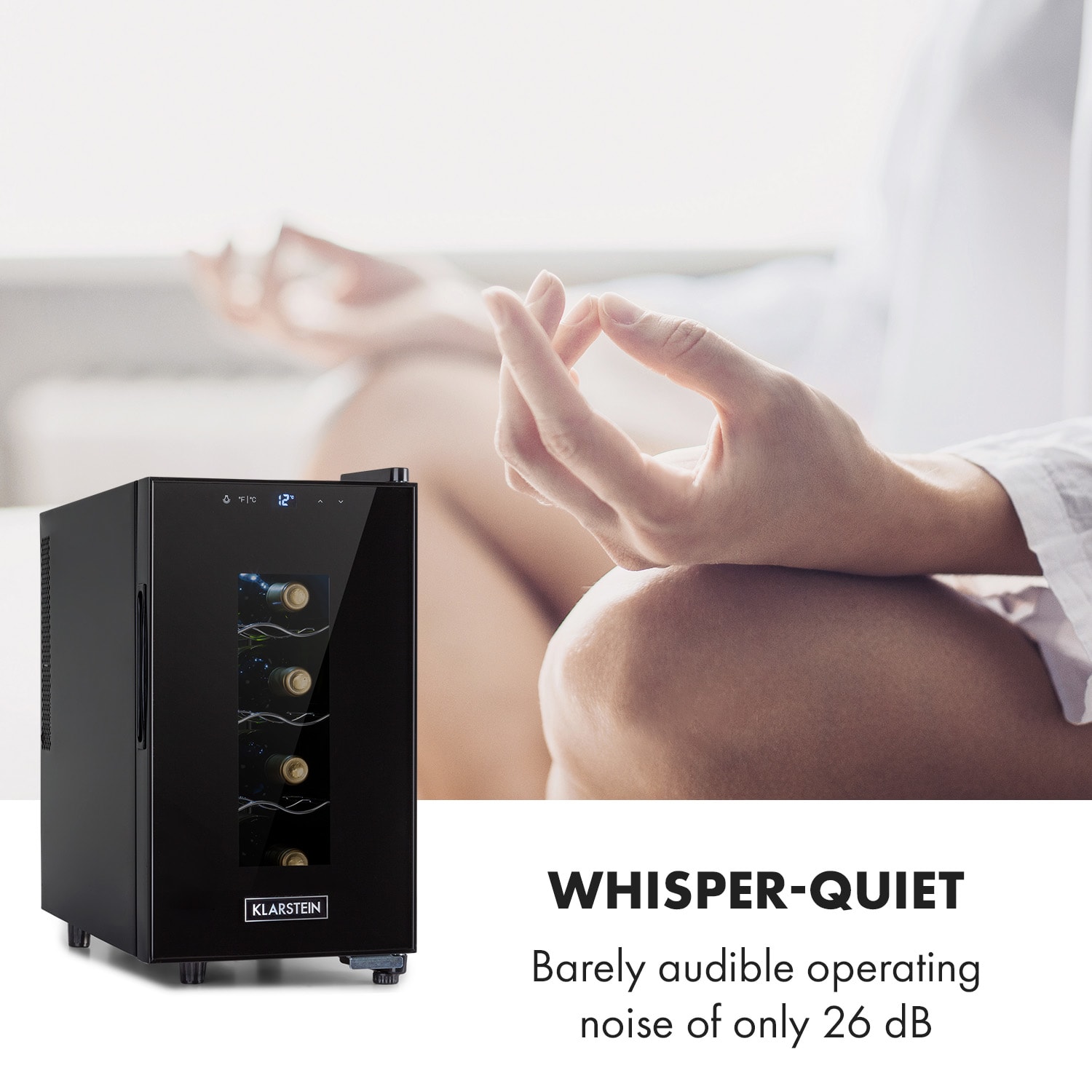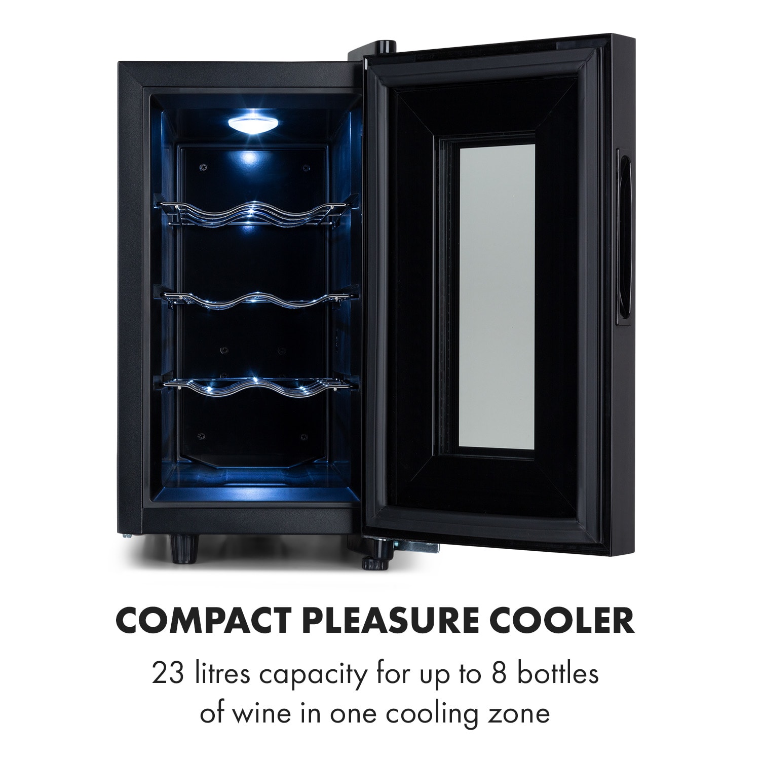 Vynikajúce vína chutia mimoriadne dobre zo štýlovej vinotéky Klarstein Bellevin 8 Uno, pretože sú vždy vychladené na tú správnu teplotu pre okamžitý pôžitok.Či už jemné červené víno, šumivé biele alebo svieže ružové: do štýlovej vinotéky Bellevin 8 Uno sa zmestí v jednej 23 litrovej chladiacej zóne až do 8 fliaš vína. Všetky fľaše sú prehľadne uložené na troch skladovacích úrovniach s výsuvnými kovovými policami. Pomocou dotykového ovládacieho panela a LCD displeja vo vonkajšej strane dvier sa dá teplota nastaviť individuálne a pohodlne na hodnotu medzi 11 a 18 °C. Zapínateľné jasné biele LED svetlo vo vnútri poskytuje potrebný prehľad a dokonalo uvádza obsah vinotéky na scénu.Dvere s dvojitým sklom nielen dobre vyzerajú, ale tiež poskytujú kedykoľvek rýchly prehľad o obsahu chladničky na nápoje Klarstein Bellevin 8 Uno. Interiér má štýlovú čiernu farbu, čo umocňuje luxusný efekt zariadenia. Kombinácia skla, ušľachtilej ocele a svetla robí z vinotéky dekoratívny doplnok každej miestnosti. Vďaka svojim kompaktným rozmerom je okrem toho mini vinotéka Bellevin 8 Uno ideálna aj na pracovnú dosku do malých priestorov. Vďaka sotva počuteľnému prevádzkovému hluku s hodnotou iba 26 dB sa dá bez problémov umiestniť aj v spálňach alebo hosťovských izbách.Praktická, s krásnym tvarom a výrazná: vinotéka Bellevin 8 Uno od spoločnosti Klarstein.