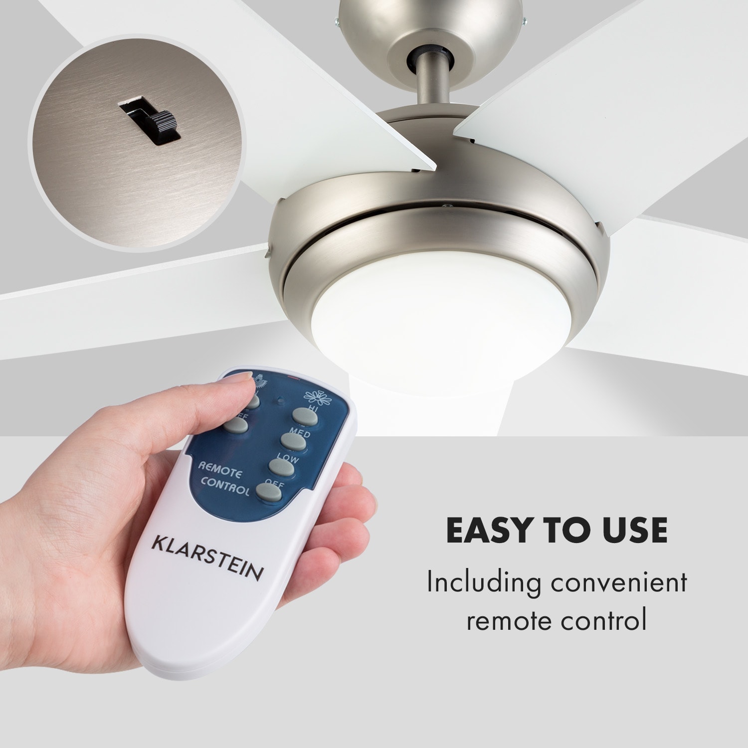 Klarstein prináša do každej miestnosti pomocou stropného ventilátora 2 v 1 Bolero svetlo a čerstvý vzduch. V kombinácii, ktorá je praktická a luxusná zároveň, zjednocuje stropný ventilátor so stropnou lampou. Toto spojenie sa ukázalo ako mimoriadne šikovné, pretože väčšina miestností má obvykle na strope iba jedno elektrické pripojenie na lampu – nehovoriac o tom, že aj lampa, aj ventilátor majú byť ideálne umiestnené uprostred stropu. Zariadenie Bolero eliminuje všetky zložité stavebné práce, pretože jednoducho používa dostupné pripojenie pre obidve zariadenia.Vo vnútri ozdobného tela sa nachádza motor pre ventilátor a tiež integrované stropné svetlo z mliečneho skla. Obidve zariadenia môžu byť prevádzkované spoločne alebo samostatne. Na ovládanie je k dispozícii pohodlný diaľkový ovládač, ktorý ti dokonca ušetrí cestu k vypínaču svetla. Ako svietidlo môžu byť podľa potreby použité všetky žiarovky s objímkou E14 do 60 W, takže aj veľké miestnosti budú optimálne osvetlené.Pri spotrebe energie 55 W zaujme stropný ventilátor Klarstein Bolero príjemne nízkou spotrebou aj pri nepretržitej prevádzke. Dva smery otáčania ventilátora zabezpečujú, že päť lopatiek rotora s priemerom 134 cm smeruje prúd vzduchu k stropu alebo k podlahe. V dôsledku toho podporuje stropný ventilátor vnútornú klímu počas chladných aj teplých dní. Pri prúdení vzduchu smerom k stropu rozvádza stúpajúci teplý vzduch v miestnosti a pomáha tak rovnomernému zohrievaniu miestnosti v chladnom období. Ak je naopak prúd vzduchu nasmerovaný k zemi, vytvára príjemne svieži vánok, ktorý sa postará o ochladenie v horúcich dňoch alebo nociach. Intenzita prúdenia vzduchu sa dá prispôsobiť individuálnym požiadavkám pomocou troch rýchlostí otáčania.Stropný ventilátor Bolero od spoločnosti Klarstein je skutočným vizuálnym zdokonalením každej miestnosti. Telo s kartáčovaným niklovým povrchom vyžaruje luxus, ktorý bude ladiť s moderným aj klasickým obytným a pracovným prostredím. Biele lopatky rotora z MDF tento efekt zosilňujú a zdôrazňujú. Matný sklenený kryt lampy príjemným spôsobom tlmí ostré svetlo žiarovky bez toho, aby priestor ukrátil o svetlosť.Upozorňujeme, že elektroinštalácie smú byť vykonávané iba vyškoleným odborným personálom. Na pripájanie ventilátora preto privolajte elektrikára.