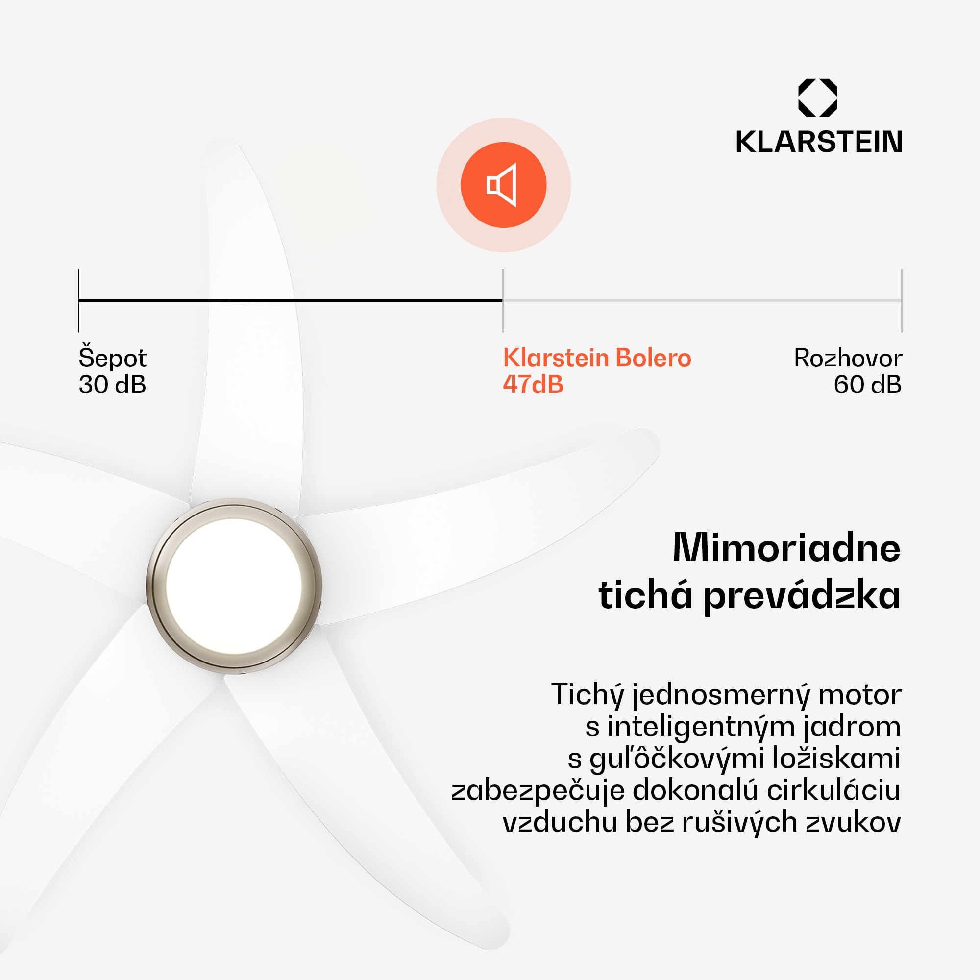 Stropný ventilátor s osvetlením Klarstein Bolero sa vyznačuje vysokou kvalitou materiálov a atraktívnym dizajnom.S piatimi lopatkami a maximálnym prietokom vzduchu 10 260 m³ za hodinu zabezpečuje príjemné prostredie v miestnostiach do 25 štvorcových metrov.Ovládanie prebieha diaľkovým ovládačom, pričom je možné nastaviť šesť rôznych výkonových stupňov a dva smery otáčania. V lete ventilátor fúka vzduch nadol pre osviežujúci vánok, zatiaľ čo v zime režim spätného chodu nasáva vzduch nahor a jemne rozvádza teplý vzduch po miestnosti.S výkonom 60 wattov a svetelným tokom 800 lumenov je integrovaná lampa bez problémov použiteľná ako stropné svetlo. Používatelia môžu vybrať z troch farieb svetla a intenzity osvetlenia, čím prispôsobia svetlo nálade a potrebám.Ventilátor je vhodný na použitie v interiéri aj exteriéri, napríklad na terasách a balkónoch, čo umožňuje jeho individuálne a flexibilné využitie podľa potreby.