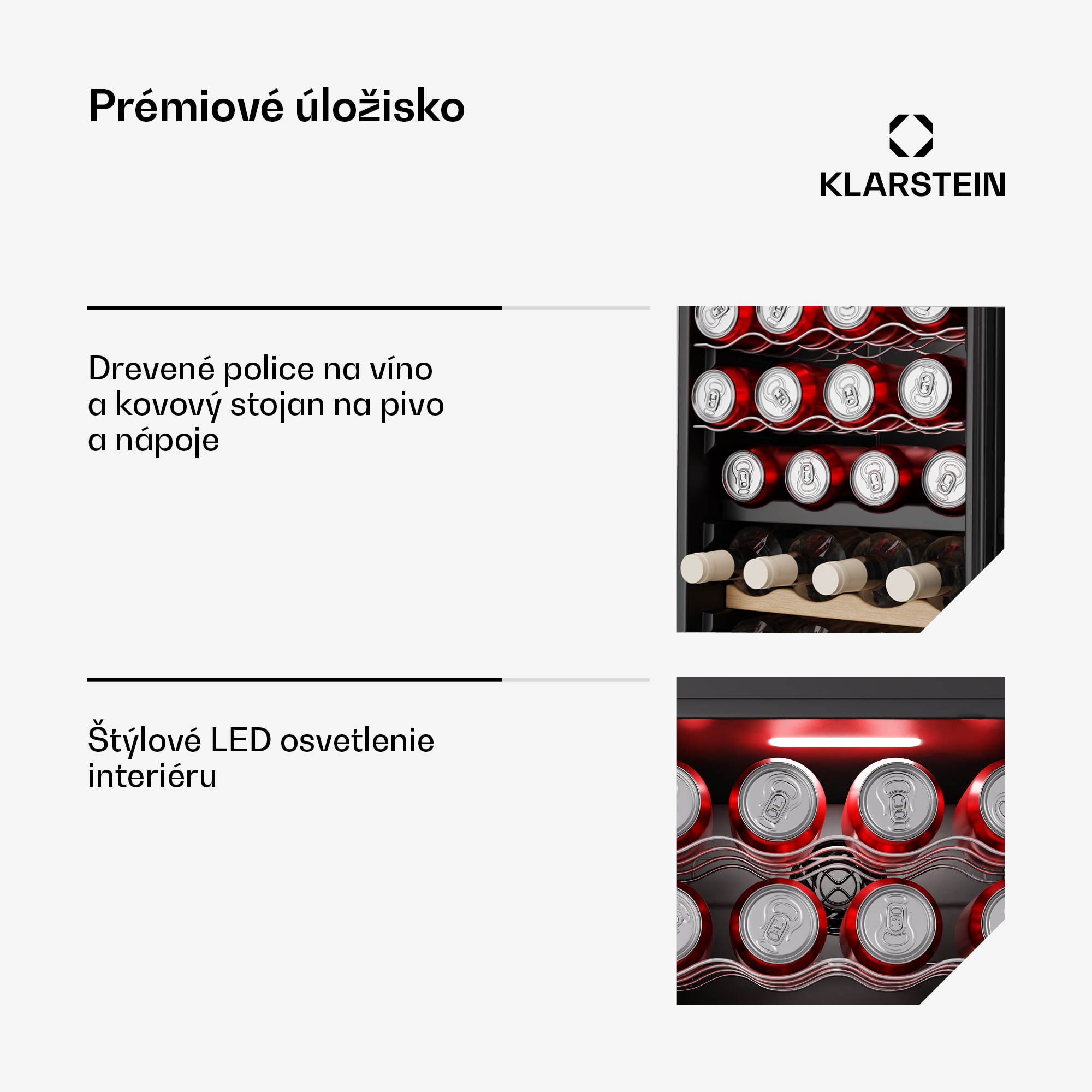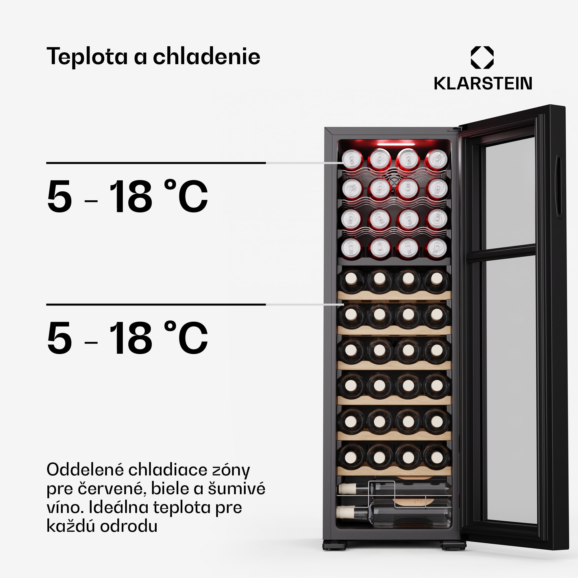 Zažite optimálne skladovanie vašich vín a nápojov s vinotékou a chladničkou na nápoje Klarstein Bovella 44 Duo+. Vďaka oddeleným chladiacim zónam môžete skladovať červené, biele a šumivé vína súčasne pri ideálnej teplote. Chladnička na víno a nápoje Klarstein Bovella 44 Duo+ je všestranným spoločníkom do každej domácnosti. S objemom 121 litrov ponúka priestor až pre 44 fliaš a je ideálna na skladovanie rôznych druhov vína a iných nápojov. Táto dvojzónová vinotéka umožňuje skladovať rôzne druhy vína pri ich optimálnej teplote od 5 do 18 °C. Elegantný dizajn so štýlovým vnútorným LED osvetlením a intuitívnym dotykovým ovládacím panelom z nej robí ozdobu každej kuchyne alebo obývačky. Vďaka funkciám ochrany proti vibráciám a UV žiareniu zostanú vaše vína uchované v tej najlepšej kvalite. Chladnička má tichú prevádzku s hlučnosťou len 43 dB a možno ju flexibilne umiestniť ako voľne stojaci spotrebič.Uistite sa, že je chladnička umiestnená na rovnom povrchu. Police pravidelne čistite mäkkou handričkou a vyhýbajte sa priamemu slnečnému žiareniu.Zažite dokonalé podmienky na skladovanie svojich vín a nápojov. Objednajte si chladničku na víno a nápoje Klarstein Bovella 44 Duo+ 2 v 1 ešte dnes!