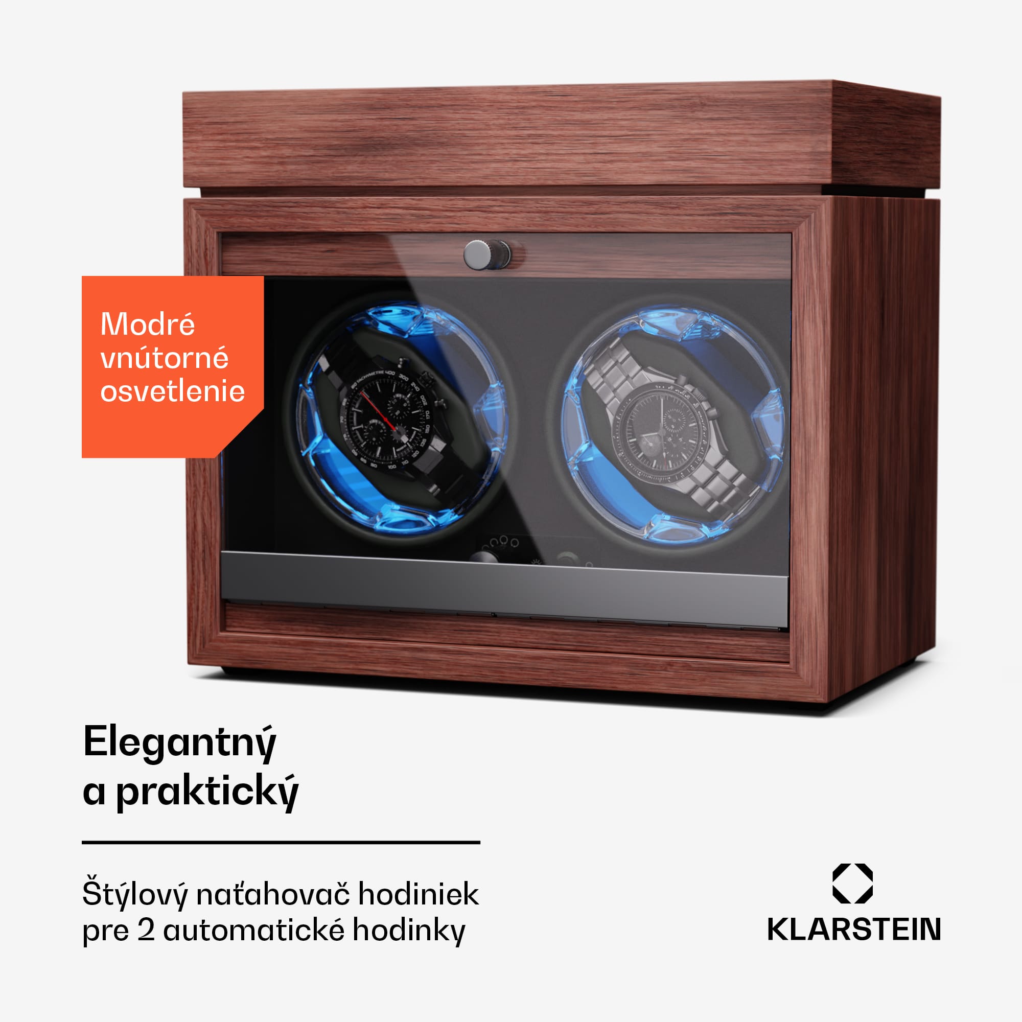 Dokonale tvarované precízne remeselné spracovanie! S naťahovačom hodiniek Klarstein Brienz 2 budú vaši elegantní spoločníci vždy dobre udržiavaní a pripravení na použitie. Automatické hodinky uložené v zariadení sa nepretržite naťahujú pomocou 4 režimov otáčania, ktoré simulujú pohyb zápästia. K starostlivosti o strojček hodiniek prispieva aj rotácia, ktorá účinne pôsobí proti stuhnutiu olejového mazania. Naťahovač hodiniek a stojan na hodinky Brienz 2 má elegantné puzdro dreveného vzhľadu, ktoré štýlovo zapadne do ambientu každej miestnosti. Štýlové integrované modré osvetlenie LED možno nastaviť pomocou jednoduchého a intuitívneho ovládania. Praktický otočný gombík na nastavenie požadovaného režimu sa nachádza vpravo. Vďaka integrovanému vankúšiku z pamäťovej peny možno do naťahovača ľahko umiestniť hodinky s rôznymi veľkosťami remienkov, ako aj dámske i pánske hodinky. Napájanie sa uskutočňuje prostredníctvom USB kábla, ktorý možno použiť s akýmkoľvek napájacím zdrojom USB, a preto je úplne nezávislý od prevládajúceho typu zásuvky. Ďalšou zaujímavosťou tohto modelu je malá priehradka na šperky v hornej časti, ktorá poskytuje bezpečné miesto na prstene, náramky, náhrdelníky a podobné predmety, keď sa práve nenosia.Vďaka svojim skromným rozmerom a hladkému chodu tichého motorčeka s prevádzkovou hlučnosťou nižšou ako 10 dB možno naťahovač hodiniek jednoducho umiestniť priamo na nočný stolík alebo do iných nehlučných zón.Upozorňujeme, že zobrazené hodinky nie sú súčasťou dodávky.