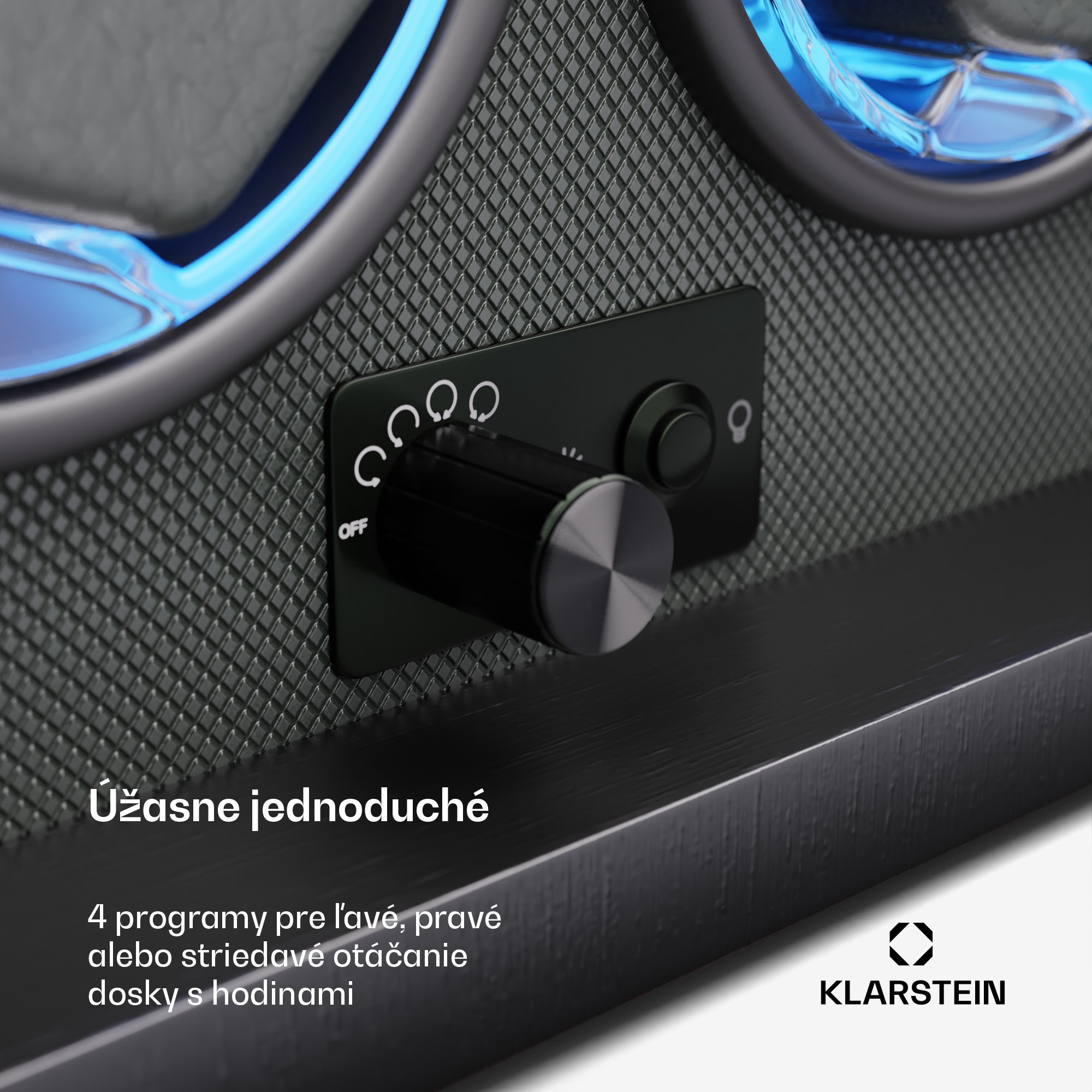 Dokonale tvarované precízne remeselné spracovanie! S naťahovačom hodiniek Klarstein Brienz 4 budú vaši elegantní spoločníci vždy dobre udržiavaní a pripravení na použitie. Automatické hodinky uložené v zariadení sa nepretržite naťahujú pomocou 4 režimov otáčania, ktoré simulujú pohyb zápästia. K starostlivosti o strojček hodiniek prispieva aj rotácia, ktorá účinne pôsobí proti stuhnutiu olejového mazania. Naťahovač hodiniek a stojan na hodinky Brienz 4 má elegantné puzdro dreveného vzhľadu, ktoré štýlovo zapadne do ambientu každej miestnosti. Štýlové integrované modré osvetlenie LED možno nastaviť pomocou jednoduchého a intuitívneho ovládania. Praktický otočný gombík na nastavenie požadovaného režimu sa nachádza vpravo. Vďaka integrovanému vankúšiku z pamäťovej peny možno do naťahovača ľahko umiestniť hodinky s rôznymi veľkosťami remienkov, ako aj dámske i pánske hodinky. Napájanie sa uskutočňuje prostredníctvom USB kábla, ktorý možno použiť s akýmkoľvek napájacím zdrojom USB, a preto je úplne nezávislý od prevládajúceho typu zásuvky.Vďaka svojim skromným rozmerom a hladkému chodu tichého motorčeka s prevádzkovou hlučnosťou nižšou ako 10 dB možno naťahovač hodiniek jednoducho umiestniť priamo na nočný stolík alebo do iných nehlučných zón.Upozorňujeme, že zobrazené hodinky nie sú súčasťou dodávky.