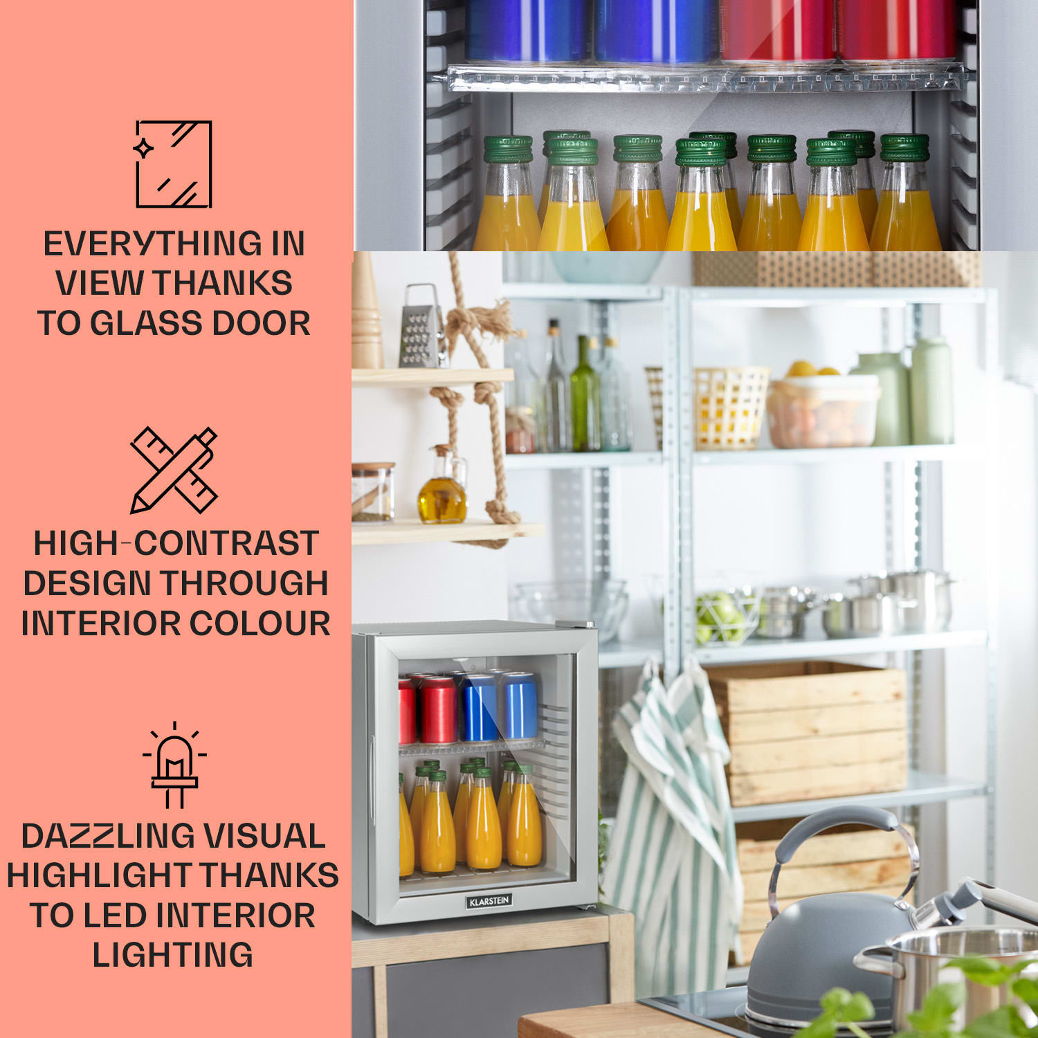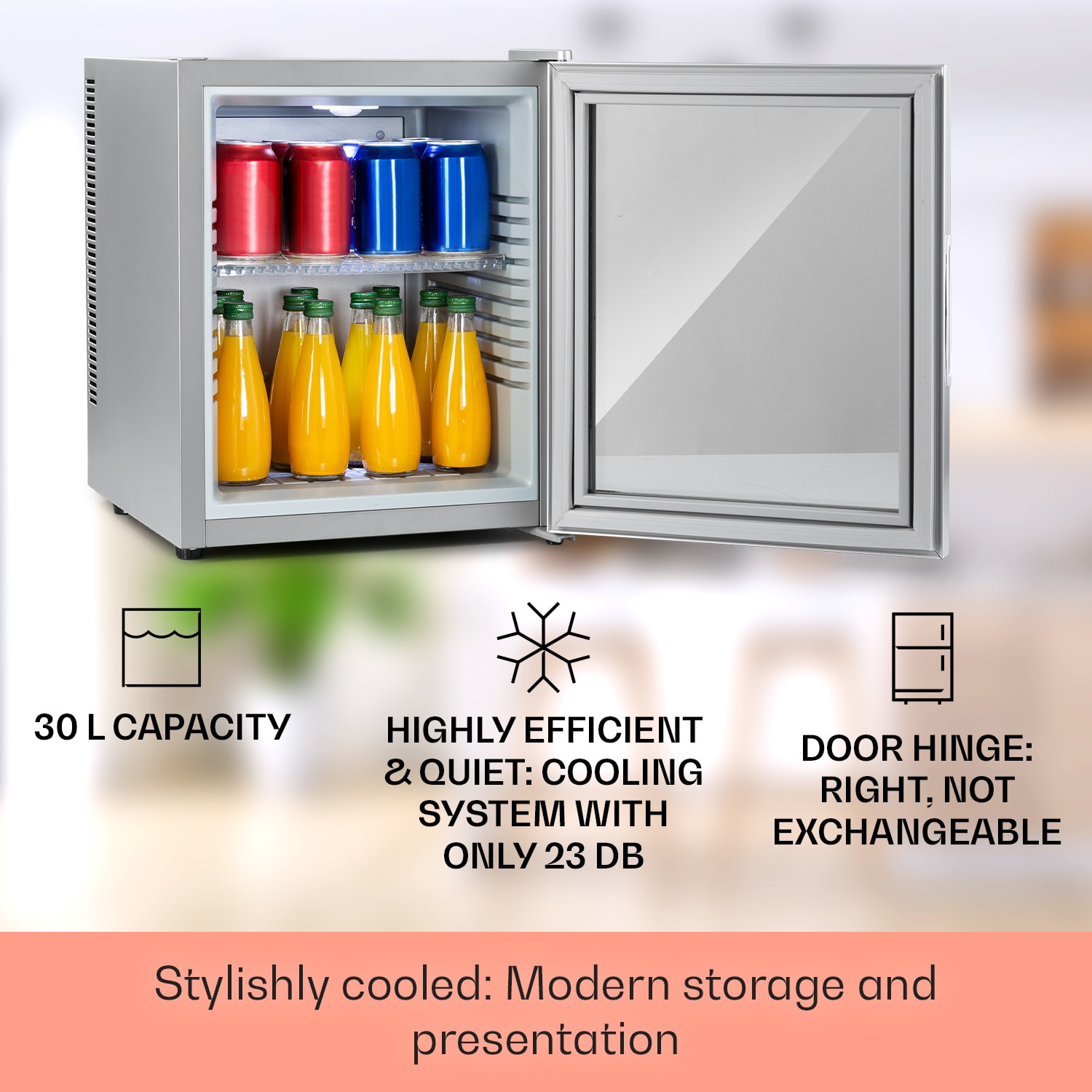 Kompaktná s veľkou úložnou kapacitou: mini-chladnička Klarstein Brooklyn 32 ponúka dostatok priestoru s 32 litrami úžitkového objemu. Na reguláciu chladenia podľa potreby sú k dispozícii 3 stupne od 12 do 18 °C. Brooklyn 32 pôsobí výnimočným dojmom predovšetkým vďaka senzačnému dizajnu: panoramatické sklenené dvere umožňujú neustály výhľad do jej interiéru. Vnútorné LED svetlo tiež spoľahlivo osvetlí uložené potraviny aj po otvorení dvierok.Prínos pre každú malú domácnosť: mini-chladnička Klarstein Brooklyn 32
