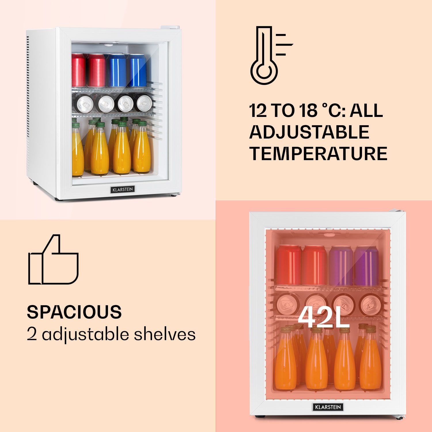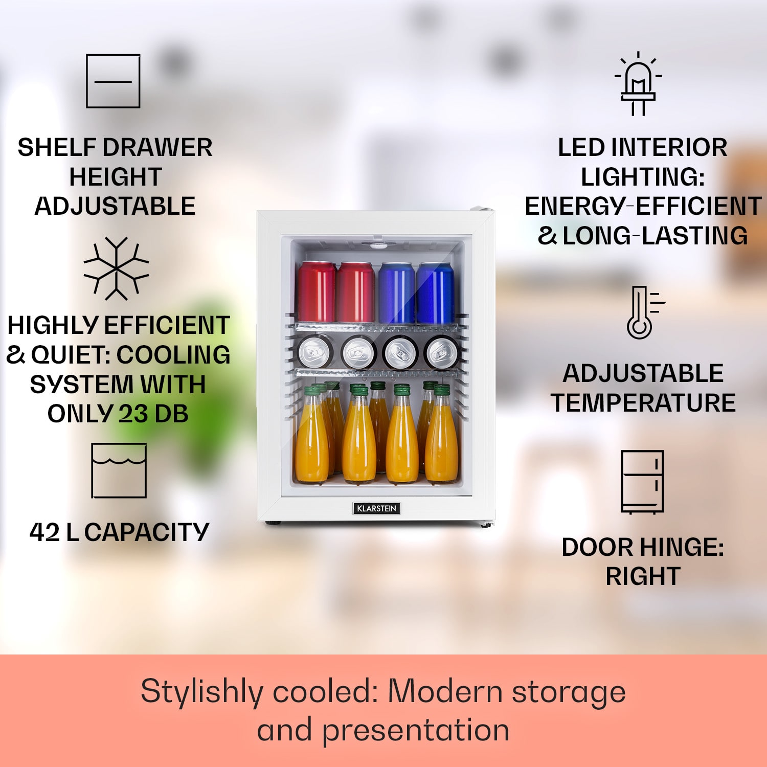 Kompaktná s veľkou úložnou kapacitou: mini-chladnička Klarstein Brooklyn 42 ponúka dostatok priestoru so 42 litrami úžitkového objemu. Na chladenie podľa potreby je možné nastaviť teplotu v rozsahu 12 až 18 °C. Brooklyn 42 pôsobí výnimočným dojmom predovšetkým vďaka senzačnému dizajnu: panoramatické sklenené dvere umožňujú neustály výhľad do jej interiéru. Vnútorné LED svetlo osvetľuje uložené potraviny, zatiaľ čo systém automatického odmrazovania Auto DeFrost minimalizuje tvorbu ľadu v chladničke aj pri častom otváraní dvierok.Prínos pre každú malú domácnosť: Klarstein Brooklyn 42 Minibar.