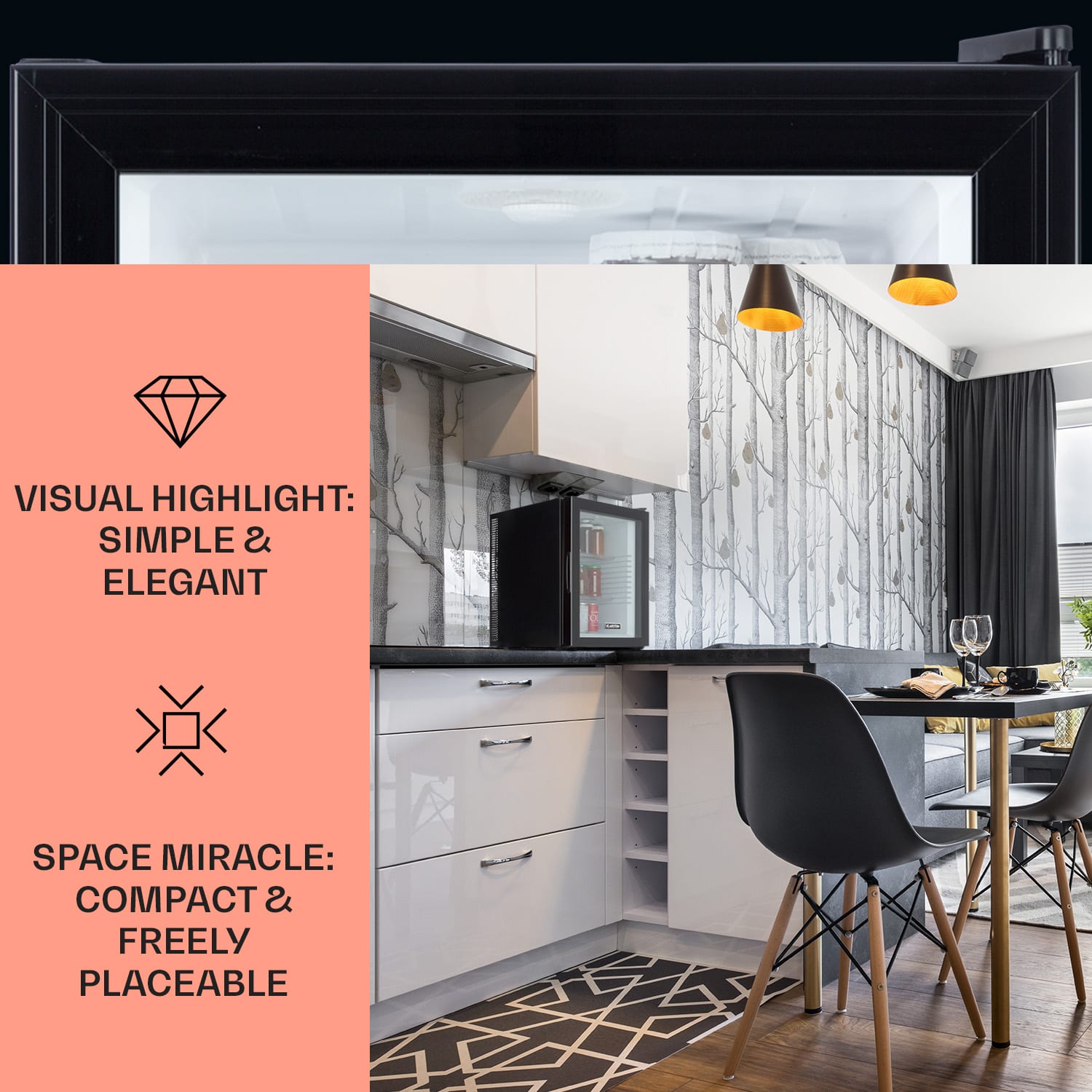 Kompaktná s veľkou úložnou kapacitou: mini-chladnička Klarstein Brooklyn 42 ponúka dostatok priestoru so 42 litrami úžitkového objemu. Na chladenie podľa potreby je možné nastaviť teplotu v rozsahu 12 až 18 °C. Brooklyn 42 pôsobí výnimočným dojmom predovšetkým vďaka senzačnému dizajnu: panoramatické sklenené dvere umožňujú neustály výhľad do jej interiéru. Vnútorné LED svetlo osvetľuje uložené potraviny, zatiaľ čo systém automatického odmrazovania Auto DeFrost minimalizuje tvorbu ľadu v chladničke aj pri častom otváraní dvierok.Prínos pre každú malú domácnosť: Klarstein Brooklyn 42 Minibar.