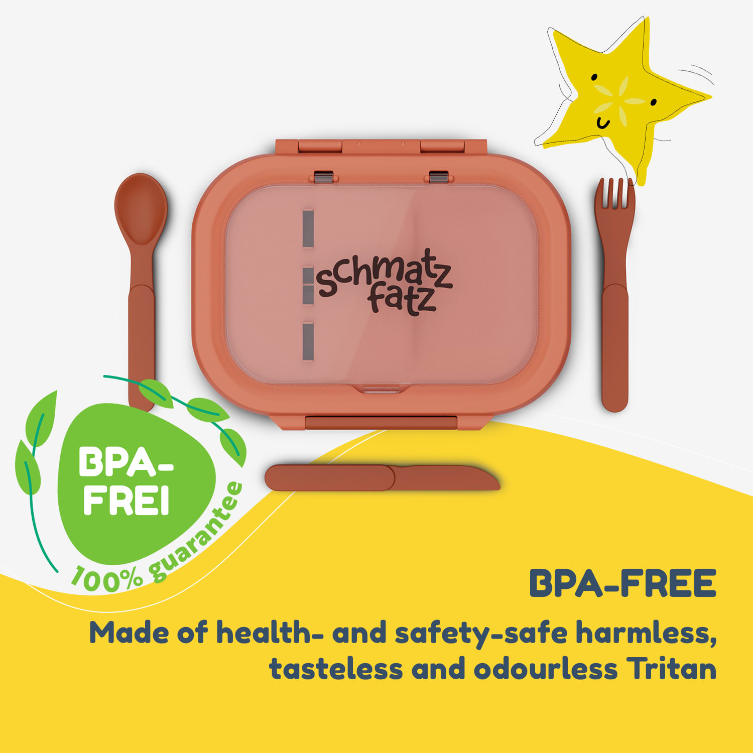 Či už sa chystáte do práce, školy alebo na výlet, desiatový box Schmatzfatz Bunko sa postará o to, aby vaše jedlo zostalo čerstvé, chutné a starostlivo usporiadané počas celého dňa.Disponuje tromi praktickými priehradkami, vďaka ktorým si môžete jedlo prehľadne rozdeliť bez toho, aby sa chute alebo arómy premiešali. Navyše vo veku nájdete malú priehradku s príborom – lyžicou, vidličkou a nožom, takže budete mať všetko potrebné vždy po ruke.Box je vyrobený z odolného Tritanu bez BPA, ktorý je bezpečný pre vaše zdravie a zaručí vám dlhoročné používanie bez poškodenia. Po každom použití ho jednoducho vložíte do umývačky riadu a je pripravený na ďalší deň.