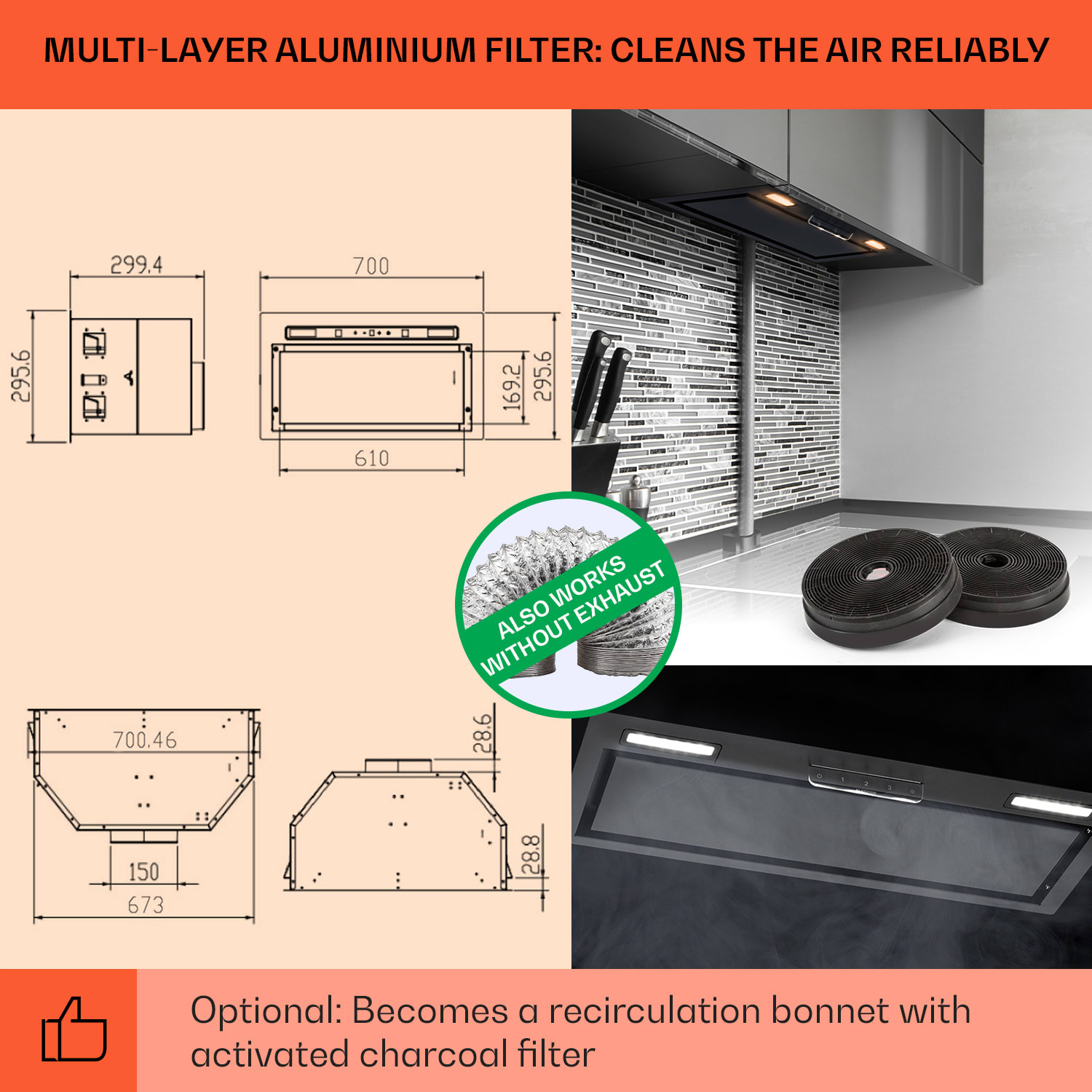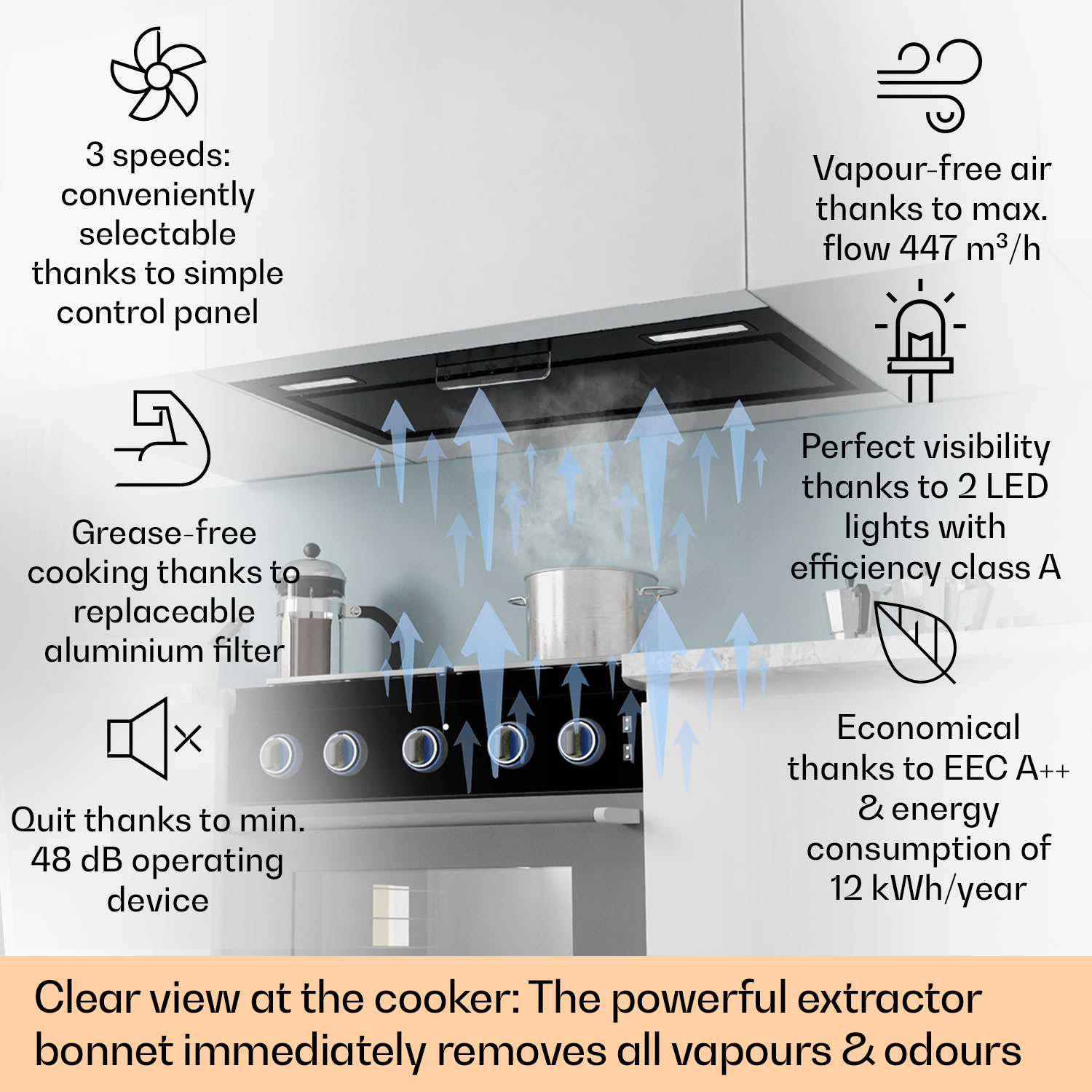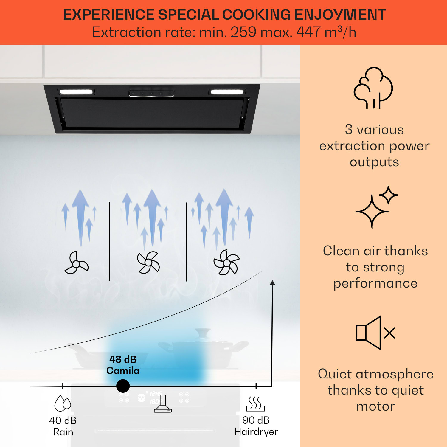 Najlepší vzduch v kuchyni: digestor Camila od Klarstein sa bez okrajov skryje do kuchynskej linky. Odtiaľ rýchlo odstraňuje paru a výpary pri varení – s výkonom motora 70 W, tromi rýchlosťami a prietokom až 397 m³/h odsávaného vzduchu. Prostredníctvom jednoduchého dotykového ovládania môžete ovládať odsávanie a osvetlenie a ľahko aktivovať posilňovač výkonu i 5-minútový časovač do vypnutia. Vďaka svojmu čistému a zároveň elegantnému dizajnu sa digestor Camila krásne začlení do každého kuchynského prostredia.
