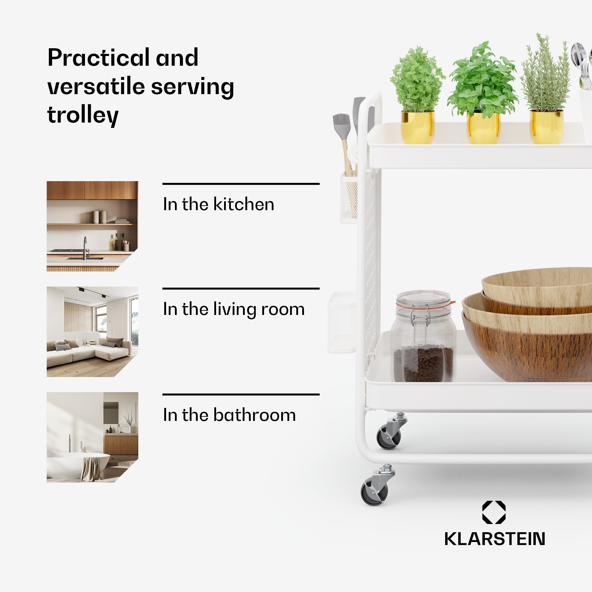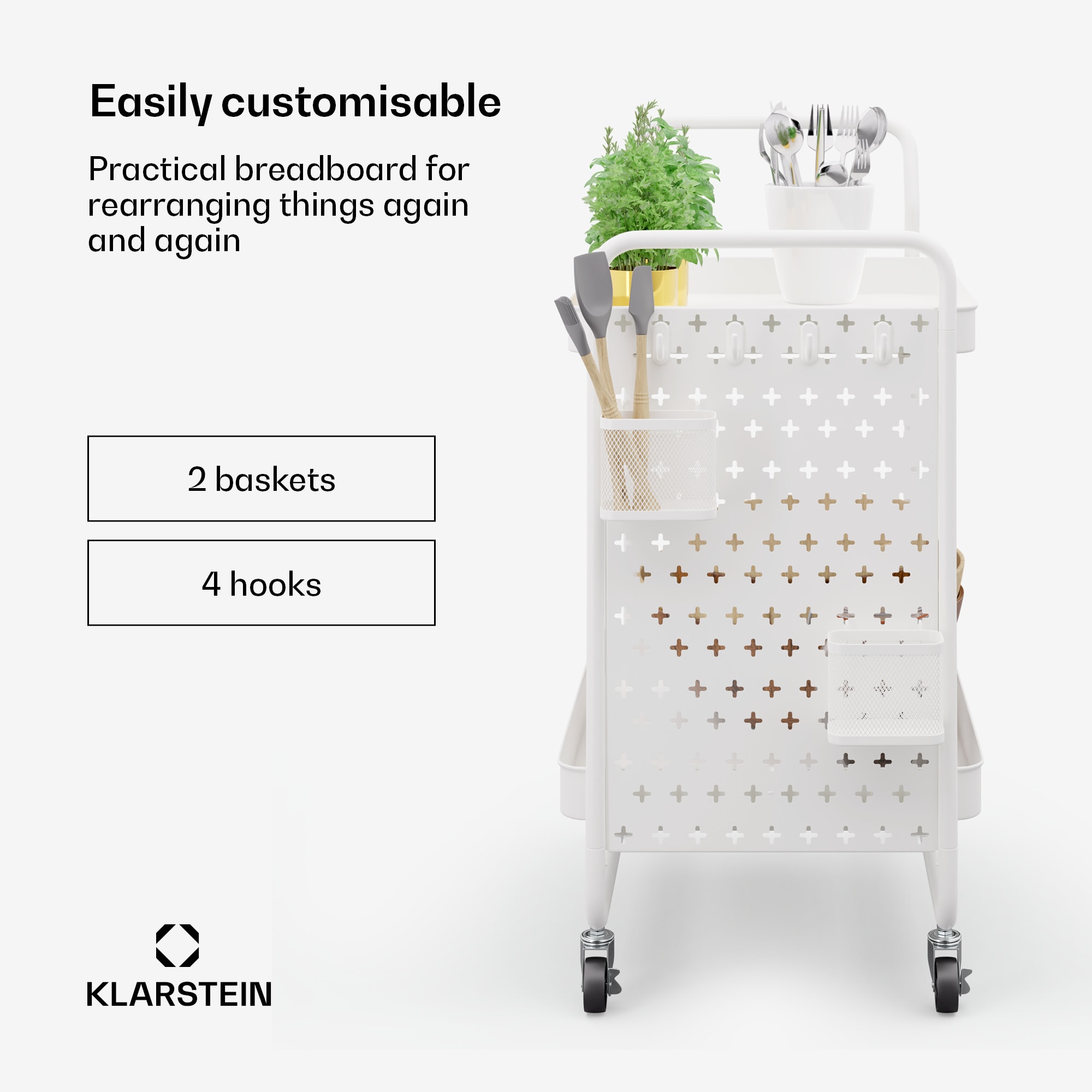 Luxus pre kuchyňu, jedáleň a obývaciu izbu: kuchynský vozík Klarstein Chibije tu vždy, keď potrebujete viac miesta a je pastvou pre oči medzi kuchynskými komorníkmi. Vozík Chibi je celý vyrobený z kovu a zameriava sa na stabilitu a štýl.Miesto na všetko: servírovací vozík Klarstein Chibi disponuje 2 policami na prehľadné uloženie riadu, zásob, uterákov, kozmetiky kúpeľňového náčinia . To zaisťujú police, 2 košíky a 4 priložené háčiky, ktoré je možné jednotlivo pripevniť na dosku. Vďaka kolieskam z tvrdej gumy sa servírovací vozík hladko pohybuje aj po kobercoch. Kuchynský komorník s radosťou vykonáva svoju prácu ako príborník alebo príručný stolík.Ušľachtilý a kvalitný: Vozík Klarstein Chibi je vaša elegantná kovová organizačná pomôcka pre jednoduchú obsluhu.