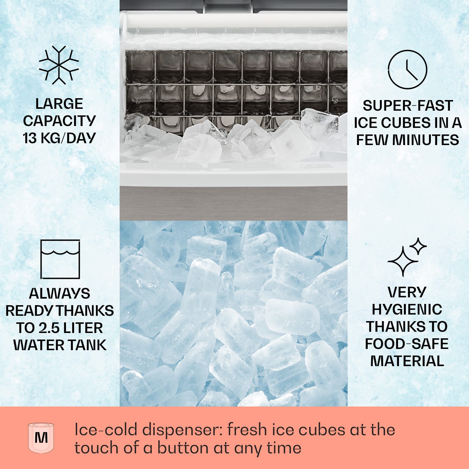 Mrazivo osviežujúci chlad: s ľadom z ľadomatu Klarstein Clearcube perfektne vychladíte všetky drinky. Či už sú to kokteily alebo iné nápoje, priehľadné kocky ľadu sa hodia ku každému. Výkonný výrobník ľadu Clearcube denne vyprodukuje až 13 kg priehľadného ľadu a hodí sa na použitie na párty alebo na záhradných oslavách. Aj na bežné domáce použitie je Clearcube nanajvýš vhodný: s ním máte doma vždy k dispozícii čerstvé, priehľadné a estetické kocky ľadu na chladenie nápojov. Obsluha ľadomatu Clearcube je veľmi jednoduchá a pohodlná prostredníctvom ovládacieho poľa s dotykovým displejom. Po použití môžete odolnú konštrukciu z ušľachtilej ocele ľahko vyčistiť, ušľachtilý finish s čiernym povrchom pritom zapadne do každého priestoru. Krištáľovo čisté kocky ľadu: výrobník ľadu Clearcube od spoločnosti Klarstein ponúka priehľadné kocky ľadu na každú príležitosť.