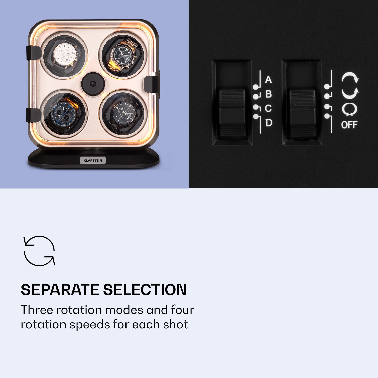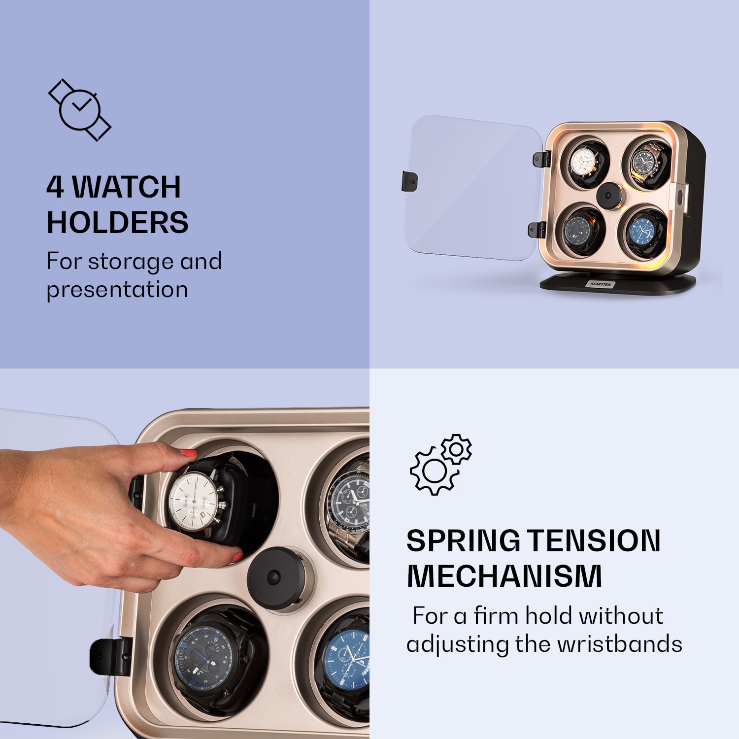 Klarstein Clover, naťahovač na hodinky, 4 hodiniek, 3 otáčania, 4 rýchlosti, modré LED osvetlenie, plastový kryt – Kúpiť