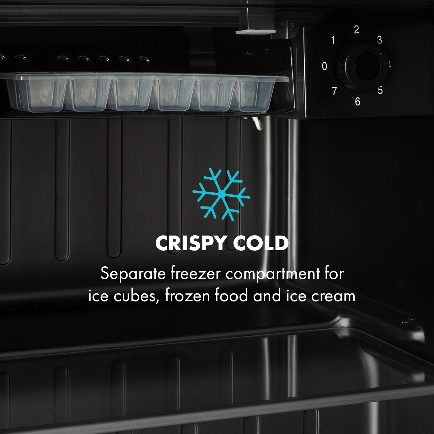 Komiksový superhrdina medzi kompaktnými chladničkami! Chladnička Klarstein Cool Vibe 46+ má objem 46 litrov a 2 úrovne, čo poskytuje dostatok priestoru pre všetky druhy potravín. Dve priehradky vo dverách poskytujú potrebný úložný priestor na fľaše a poháre. V samostatnej mraziacej priehradke v hornej časti sú navyše vždy pripravené kocky ľadu, mrazené potraviny alebo zmrzlina. Táto mini chladnička Klarstein Cool Vibe 46+ zodpovedá svojmu názvu nielen svojím interiérom: jej predná strana je navrhnutá s osviežujúcou potlačou. Cool výroky, emotikony a drzé obrázky – nech sa páči, Cool Vibe 46+ to všetko má!