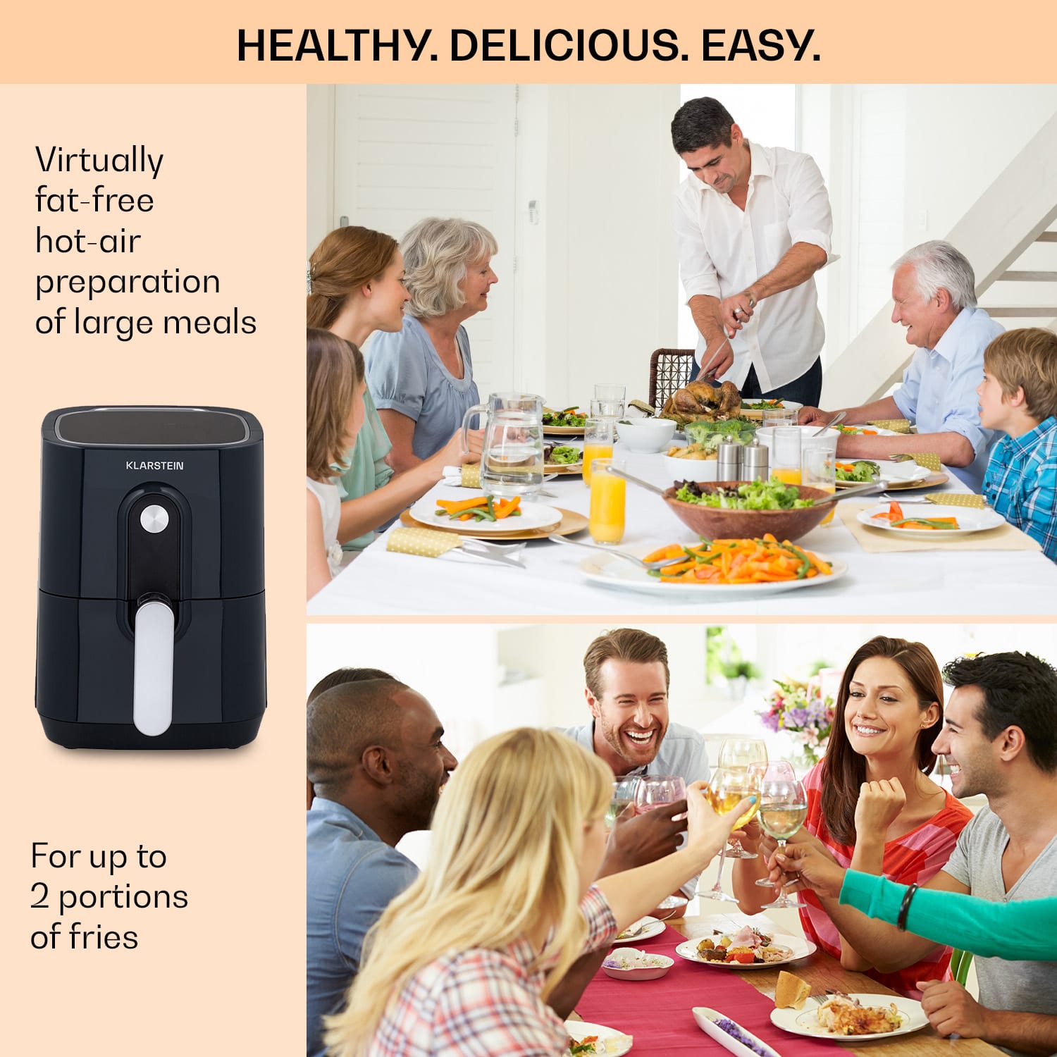Raz, dva, tri, chrumkáme! Teplovzdušná fritéza Klarstein Crisp-Pro vám rýchlo a jednoducho pripraví fritované pochúťky, ako sú hranolky, kuracie krídla, krokety a mnoho ďalších, a to všetko s nízkym obsahom tuku, takže zároveň aj zdravým spôsobom.Vďaka cirkulujúcemu horúcemu vzduchu fritéza Crisp-Pro frituje, pečie, griluje alebo opeká s výkonom 1400 W a jedlo pripraví šetrne a rýchlo zo všetkých strán. Teplovzdušná fritéza s objemom 2,8 litra ponúka dostatok priestoru na hranolky, kuracie stehná, ryby alebo zeleninu. Teplotu a čas prevádzky môžete naprogramovať samostatne alebo použiť jeden z 8 prednastavených programov. Aby ste po jedle všetko rýchlo a jednoducho všetko zvládli, fritovacia nádoba je potiahnutá nepriľnavou vrstvou a dá sa vyčistiť za okamih. AJ nádoba a grilovací rošt sú vhodné do umývačky riadu. Objavte zdravý a chrumkavý spôsob fritovania s teplovzdušnou fritézou Crisp-Pro od Klarstein.