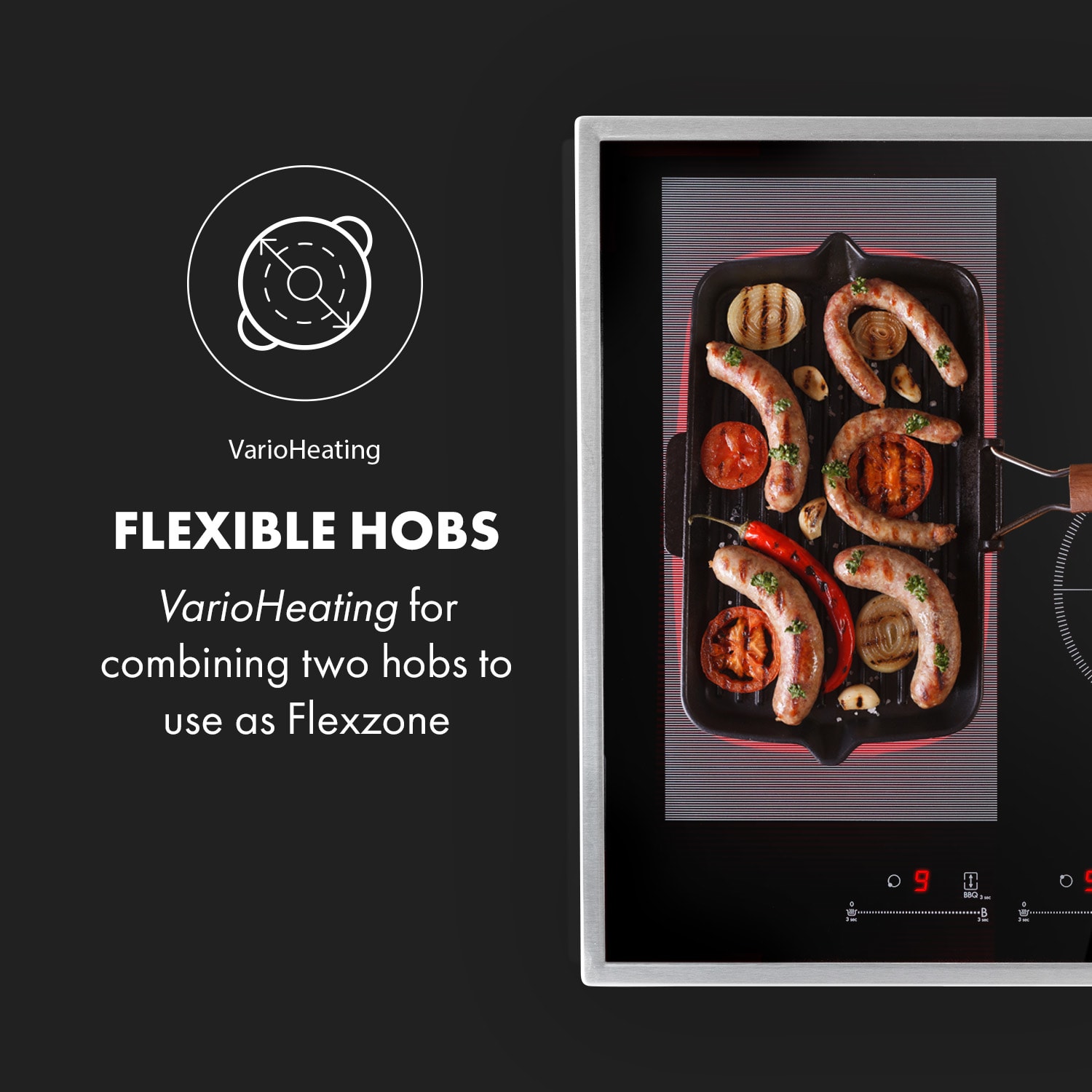 Jednoducho flexibilné varenie: Indukčná varná doska Klarstein Delicatessa 77 Hybrid Prime umožňuje optimálne využitie priestoru s minimálnou spotrebou energie pri varení. Kombinuje pri tom technické inovácie s klasickým vzhľadom a prináša do kuchynskej linky so svojím luxusným sklokeramickým povrchom s rámom z ušľachtilej ocele nový lesk.Vstavaná varná doska Klarstein Delicatessa 77 Hybrid Prime ponúka štyri varné platne s celkovým výkonom až 7000 W, ktoré sa rozdeľujú na 1 x 2500 W, 1 x 2000 W a 2 x 1500 W na jednotlivých varných plochách a privádzajú obsah hrncov a panvíc do varu v špičkových časoch. Pritom sa zjednocujú obidve ľavé varné zóny do jednej flexi zóny pomocou funkcie VarioHeating: vďaka funkcii rozpoznania veľkosti hrnca sa s maximálnou flexibilitou prispôsobí veľkosti umiestnených hrncov, panvíc alebo kastrólov, a tak sa zohrieva aj veľký kuchynský riad, ktorý sa nezmestí na jednu varnú plochu. Na jednej strane zariadenie Delicatessa 77 Hybrid Prime naozaj využíva len energiu, ktorá je vhodná pre daný hrniec, a na druhej strane umožňuje používať takmer akúkoľvek veľkosť hrnca alebo panvice. Zariadenie Delicatessa 77 Hybrid Prime myslí aj na milovníkov veľkých panvicových jedál, ako napríklad paella. Pravá varná zóna má priemer 28 cm a poskytuje bez problémov dostatok potrebného miesta na veľké panvice. Výkon jednotlivých plôch a tiež flexi plochy je možné ovládať samostatne a majú k dispozícii funkciu ThermoBoost, ktorá zvyšuje výkon s cieľom rýchleho zohriatia až na 3500 W. Sklokeramická varná doska Klarstein Delicatessa 77 Hybrid Prime sa jednoducho ovláda pomocou integrovaného dotykového panelu SenseControl s touch-to-slide ovládaním výkonu posunutím prsta po ploche a pomocou digitálneho displeja. Takže ani gombíky a regulátory nenarúšajú povrch kuchynskej linky. Okrem výkonu sa dá naprogramovať aj časovač až na 99 minút pre každú varnú dosku. Časovač buď vypne varnú dosku po uplynutí nastaveného času, alebo vydá akustický signál.Aby počas varenia všetko prebiehalo hladko, vstavaný sporák Delicatessa 77 Hybrid Prime má širokú škálu poistiek: Ochrana proti prehriatiu s automatickým vypnutím sa aktivuje, ak je varná platňa príliš horúca. Indikátor zvyškového tepla princípu EcoThermal Control Vás informuje nielen o tom, či sú vypnuté varné plochy stále horúce. Umožňuje tiež varenie pomocou zvyškového tepla na úsporu energie. Funkcia ThermalRecall si pamätá nastavenú teplotu a použije sa, ak by bol proces varenia krátkodobo prerušený a neskôr by sa v ňom malo pokračovať. Okrem toho môže byť aktivovaný detský zámok, aby sa zabránilo náhodným zmenám nastavení varenia.Opticky indukčná varná doska Klarstein Delicatessa 77 Hybrid Prime presviedča svojím ľahko udržiavateľným sklokeramickým povrchom s rámom z kartáčovanej ušľachtilej ocele, ktorý skúsene uvádza indukčný sporák na scénu. Týmto spôsobom sa varná doska hravo začlení do každej kuchynskej linky – či už klasickej, alebo modernej. Materiál, potrebný na inštaláciu do pracovnej dosky, je priamo súčasťou balenia.