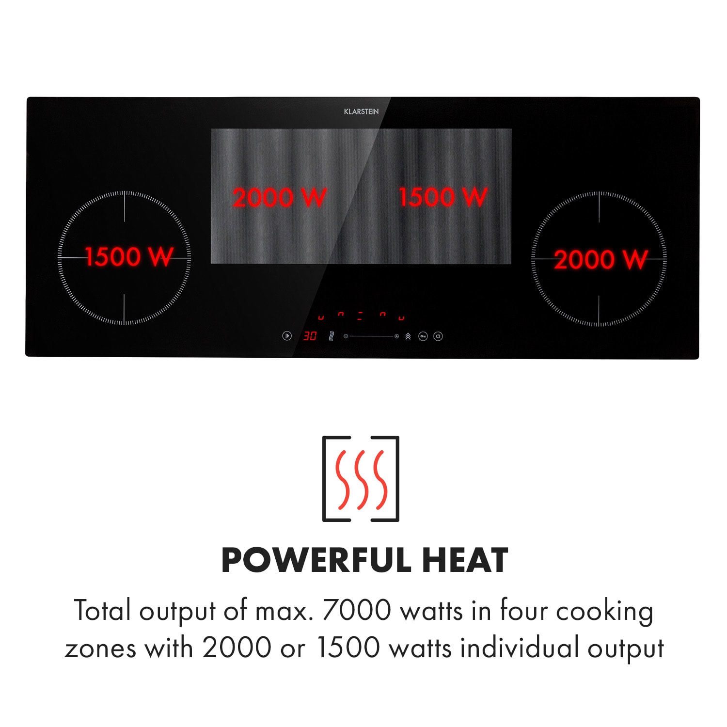 Jednoducho flexibilné varenie: Indukčná varná doska Klarstein Delicatessa 90 Slim umožňuje optimálne využitie priestoru s minimálnou spotrebou energie pri varení. Kombinuje pri tom technické inovácie s luxusným vzhľadom a prináša do kuchynskej linky so svojím sklokeramickým povrchom nový lesk.Vstavaná varná doska Klarstein Delicatessa 90 Slim ponúka štyri varné platne s celkovým výkonom až 7000 W, ktoré sa rozdeľujú na 2 x 2000 W a 2 x 1500 W na jednotlivých varných plochách a privádzajú obsah hrncov a panvíc do varu v špičkových časoch. Pritom sa zjednocujú obidve stredné varné zóny do jednej flexi zóny pomocou funkcie VarioHeating: vďaka funkcii rozpoznania veľkosti hrnca sa s maximálnou flexibilitou prispôsobí veľkosti hrncov, panvíc alebo kastrólov, a tak zohrieva aj veľký kuchynský riad, ktorý sa nezmestí na jednu varnú plochu. Výkon jednotlivých plôch a tiež flexi plochy je možné ovládať samostatne a majú k dispozícii funkciu ThermoBoost, ktorá zvyšuje výkon s cieľom rýchleho zohriatia až na 2800 W. Sklokeramická varná doska Klarstein Delicatessa 90 Slim sa jednoducho ovláda pomocou integrovaného dotykového panela SenseControl s ovládaním výkonu posunutím prsta po ploche a pomocou digitálneho displeja. Takže ani gombíky a regulátory nenarúšajú povrch kuchynskej linky. Okrem výkonu sa dá naprogramovať aj časovač až na 99 minút pre každú varnú dosku. Časovač buď vypne varnú dosku po uplynutí nastaveného času, alebo vydá akustický signál.Aby počas varenia všetko prebiehalo hladko, vstavaný sporák Delicatessa 90 Slim má širokú škálu poistiek a pomocných funkcií: Ochrana proti prehriatiu s automatickým vypnutím, indikátorom zvyškového tepla, funkciou udržania jedla v teple, s detskou poistkou a funkciou ThermalRecall na krátke prerušenie varenia.V kuchynskej linke zabudovaná varná doska Klarstein Delicatessa 90 Slim zaujme predovšetkým štíhlymi rozmermi s hĺbkou iba 35 cm. Vďaka tomu je perfektná na použitie s digestorom výsuvným z pracovnej dosky. Opticky zaujme indukčná varná doska svojím ľahko udržiavateľným sklokeramickým povrchom, ktorý skúsene uvádza indukčný sporák na scénu. Týmto spôsobom sa varná doska hravo začlení do každej kuchynskej linky – či už klasickej, alebo modernej.