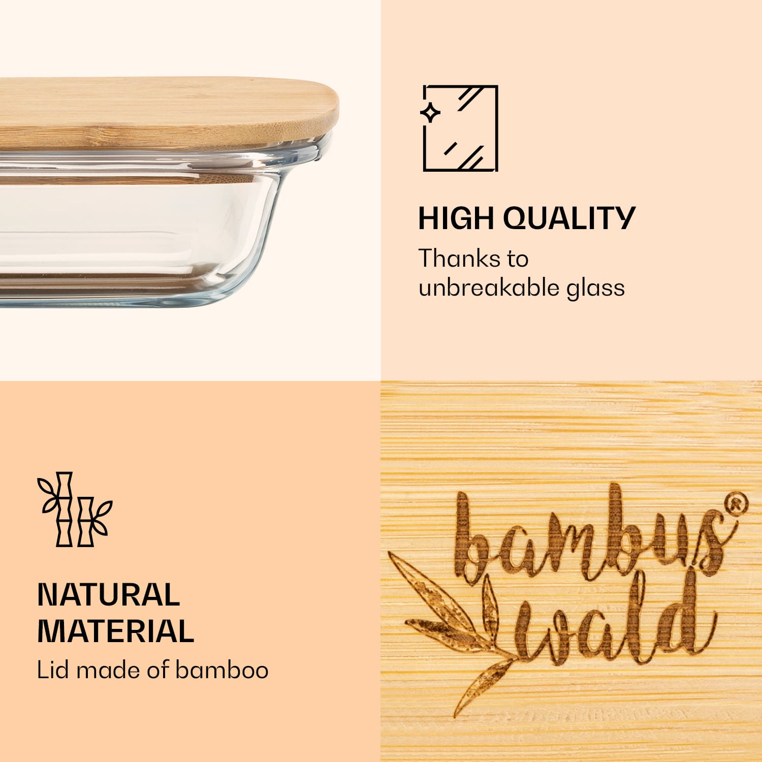 Máte už dosť plastov, umelej hmoty a spol.? So servírovacími boxmi Bambuswald môžete svoje studené mäso a syry uchovávať v udržateľných boxoch. Vďaka vyhotoveniu zo skla a bambusu neobsahujú plasty a zmäkčovadlá. Samozrejme môžete do štýlových boxov uložiť aj predvarené jedlá, zeleninu alebo ovocie. Nádoby sú vyrobené z nerozbitného a žiaruvzdorného borosilikátového skla a sú ideálne aj na použitie v rúre. Okrem toho vám priehľadné skladovacie nádoby poskytujú optimálny prehľad o výbere potravín.Sklenená konštrukcia sa dá ľahko umývať v umývačke riadu. Aby sa drevo dlhodobo zachovalo, odporúčame uzávery opláchnuť ručne.