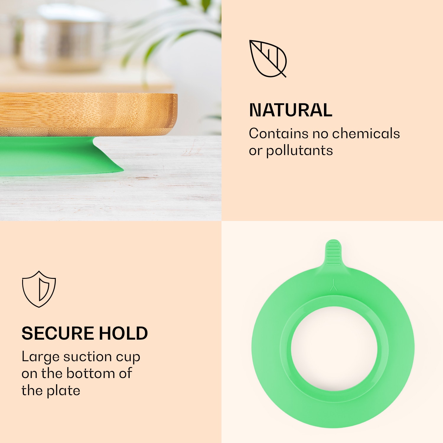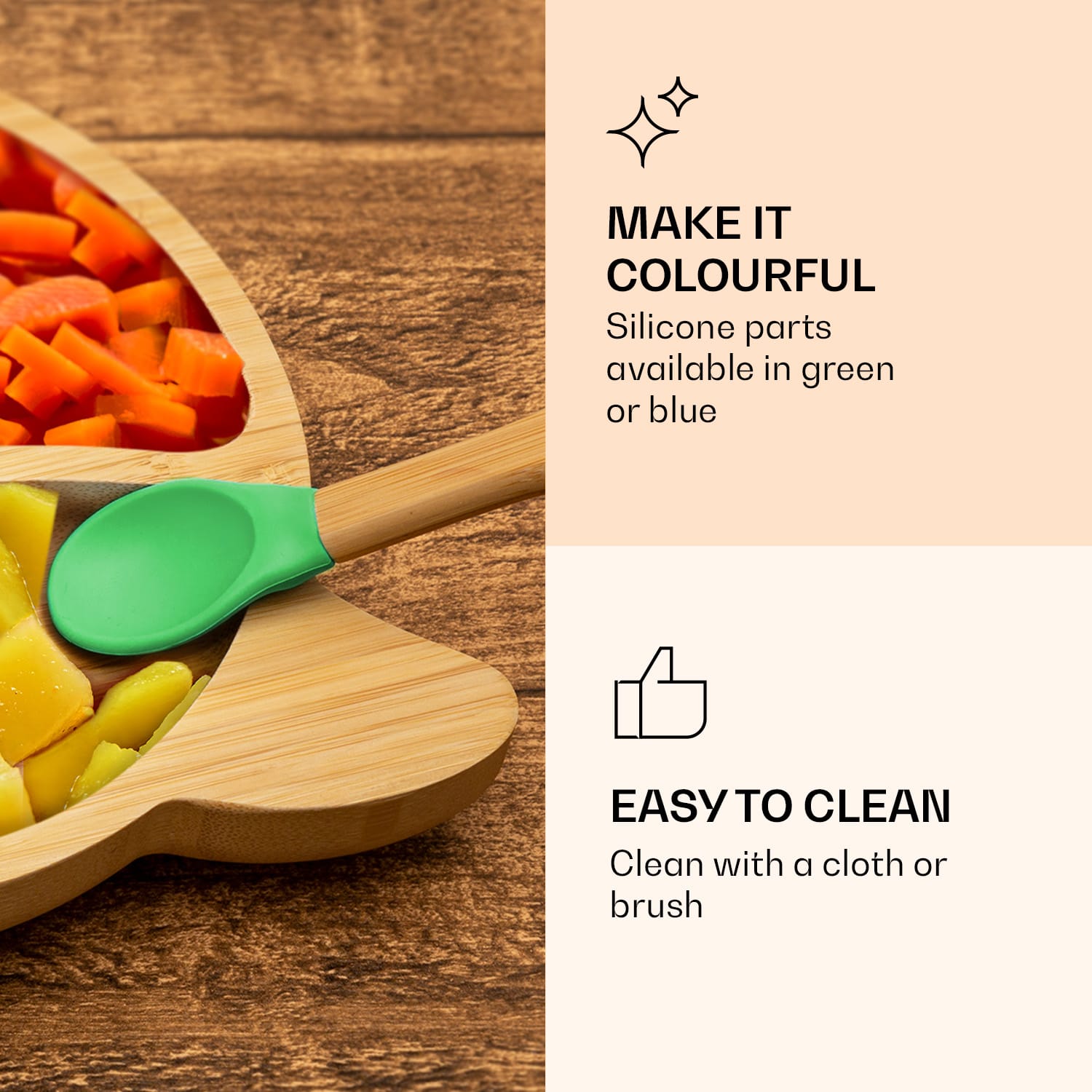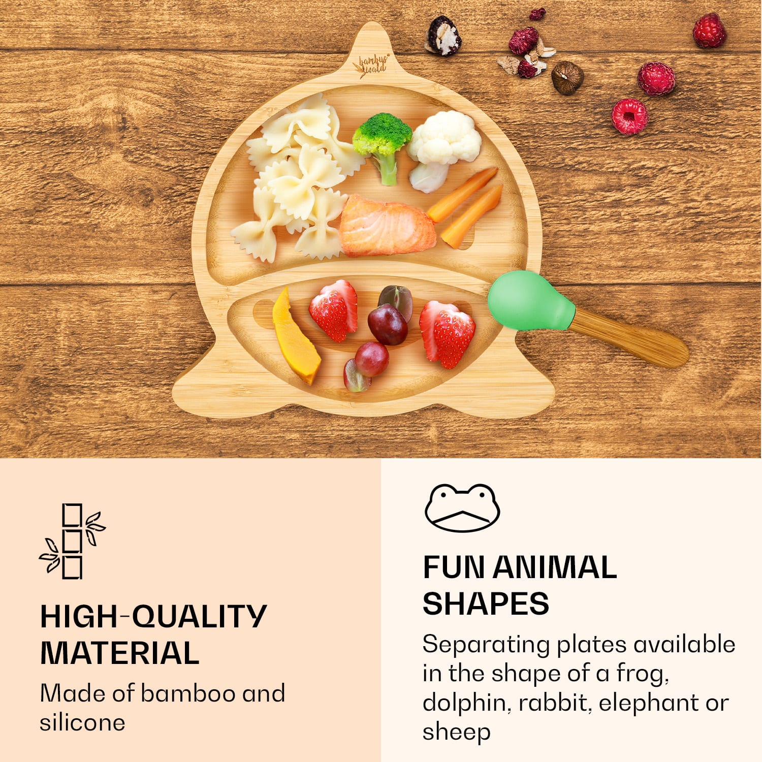 Hra a zábava pri jedle! Detský riad s bambusovým tanierom a lyžičkou od Klarstein bambuswaldu je takmer nezničiteľný! Postará sa o to robustný bambusový materiál a silikónová prísavka, ktorá pripevňuje plytký tanier k stolu. Malým gurmánom urobia radosť predovšetkým veselé zvieracie tvary taniera: so žabkou, zajacom, ovečkou, slonom alebo delfínom sa predsa je oveľa zaujímavejšie! Všetky delené taniere sú vyrobené z prírodného bambusového materiálu a neobsahujú žiadne chemikálie ani škodlivé látky. Kontroly kvality okrem toho zaručujú, že sa k potravinám nedostáva žiadny zápach ani chuť. Riad preto môžeš kedykoľvek naplniť teplými aj studenými, pevnými aj tekutými potravinami. Motivujúca učebná jedálenská súprava – pozostáva z taniera a farebne zladenej lyžičky – je skvelým tipom na darček pre novopečených rodičov a ich malých potomkov.