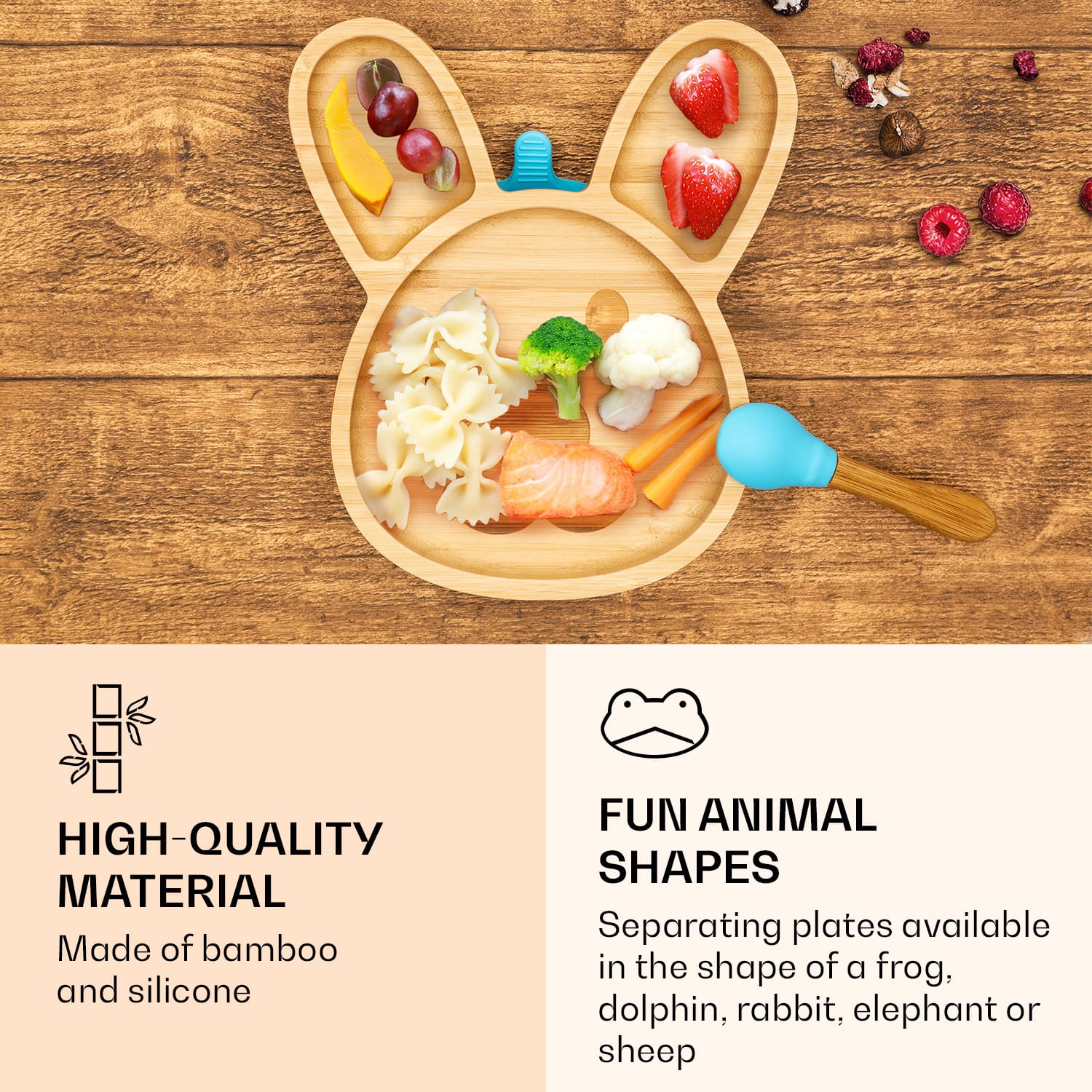 Hra a zábava pri jedle! Detský riad s bambusovým tanierom a lyžičkou od Klarstein bambuswaldu je takmer nezničiteľný! Postará sa o to robustný bambusový materiál a silikónová prísavka, ktorá pripevňuje plytký tanier k stolu. Malým gurmánom urobia radosť predovšetkým veselé zvieracie tvary taniera: so žabkou, zajacom, ovečkou, slonom alebo delfínom sa predsa je oveľa zaujímavejšie! Všetky delené taniere sú vyrobené z prírodného bambusového materiálu a neobsahujú žiadne chemikálie ani škodlivé látky. Kontroly kvality okrem toho zaručujú, že sa k potravinám nedostáva žiadny zápach ani chuť. Riad preto môžeš kedykoľvek naplniť teplými aj studenými, pevnými aj tekutými potravinami. Motivujúca učebná jedálenská súprava – pozostáva z taniera a farebne zladenej lyžičky – je skvelým tipom na darček pre novopečených rodičov a ich malých potomkov.