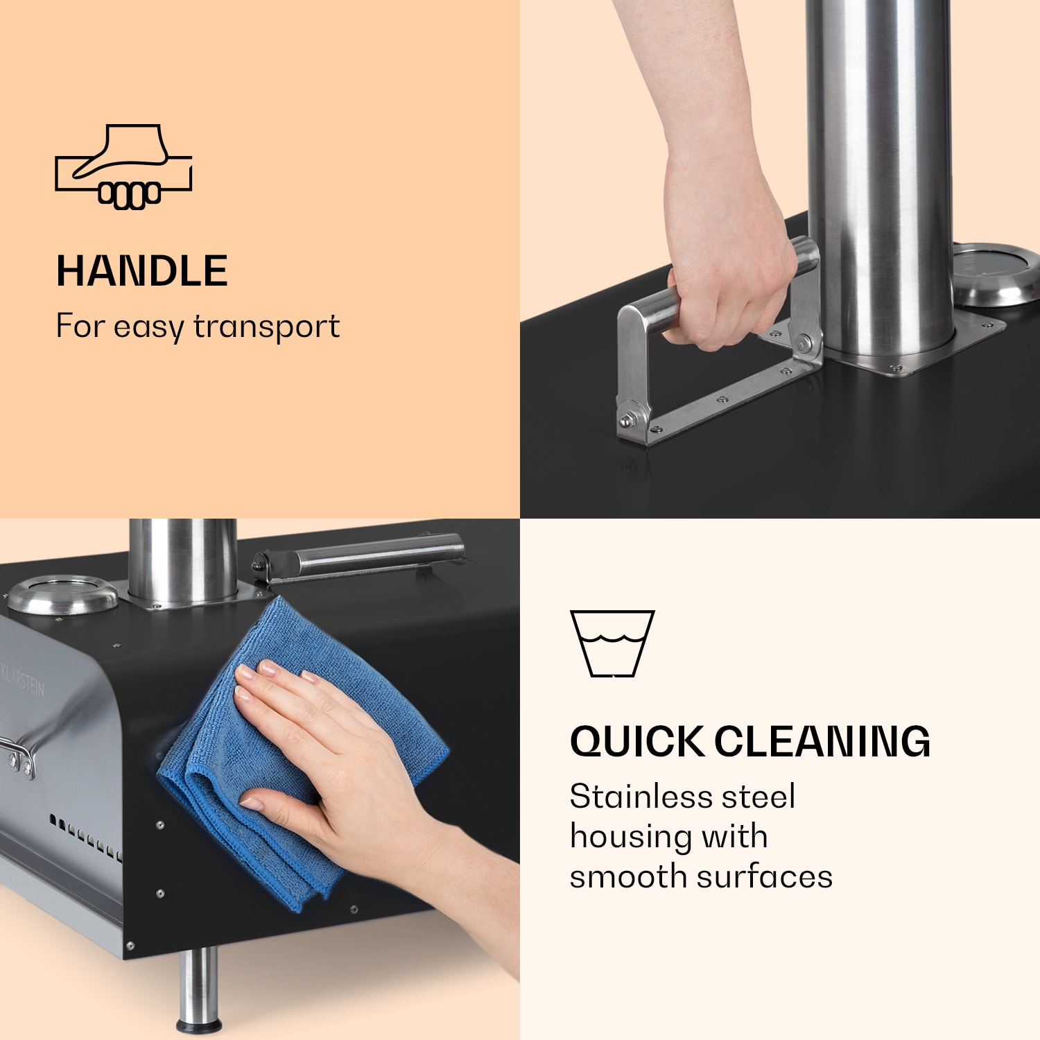 Najlepšie gurmánske zážitky úplne bez elektriny: jedinečná pec na pizzu Diavolo od Klarsteinu ti umožní pripraviť aromatické jedlá na skutočnom ohni. Pizza, chlieb z pece, mäso, zelenina alebo koláče – upečené tradične, no s najmodernejšou technológiou pece na pelety, chutia nezameniteľne. Umiestni Diavolo do exteriéru, zadnú časť naplň drevenými peletami a vyhrej ju na požadovanú teplotu. Integrovaný teplomer ti spoľahlivo ukáže presnú teplotu, zatiaľ čo konštrukcia z nehrdzavejúcej ocele sa postará o rýchle rozdelenie tepla a zaujímavý komín zaisťuje dobré odsávanie dymu.