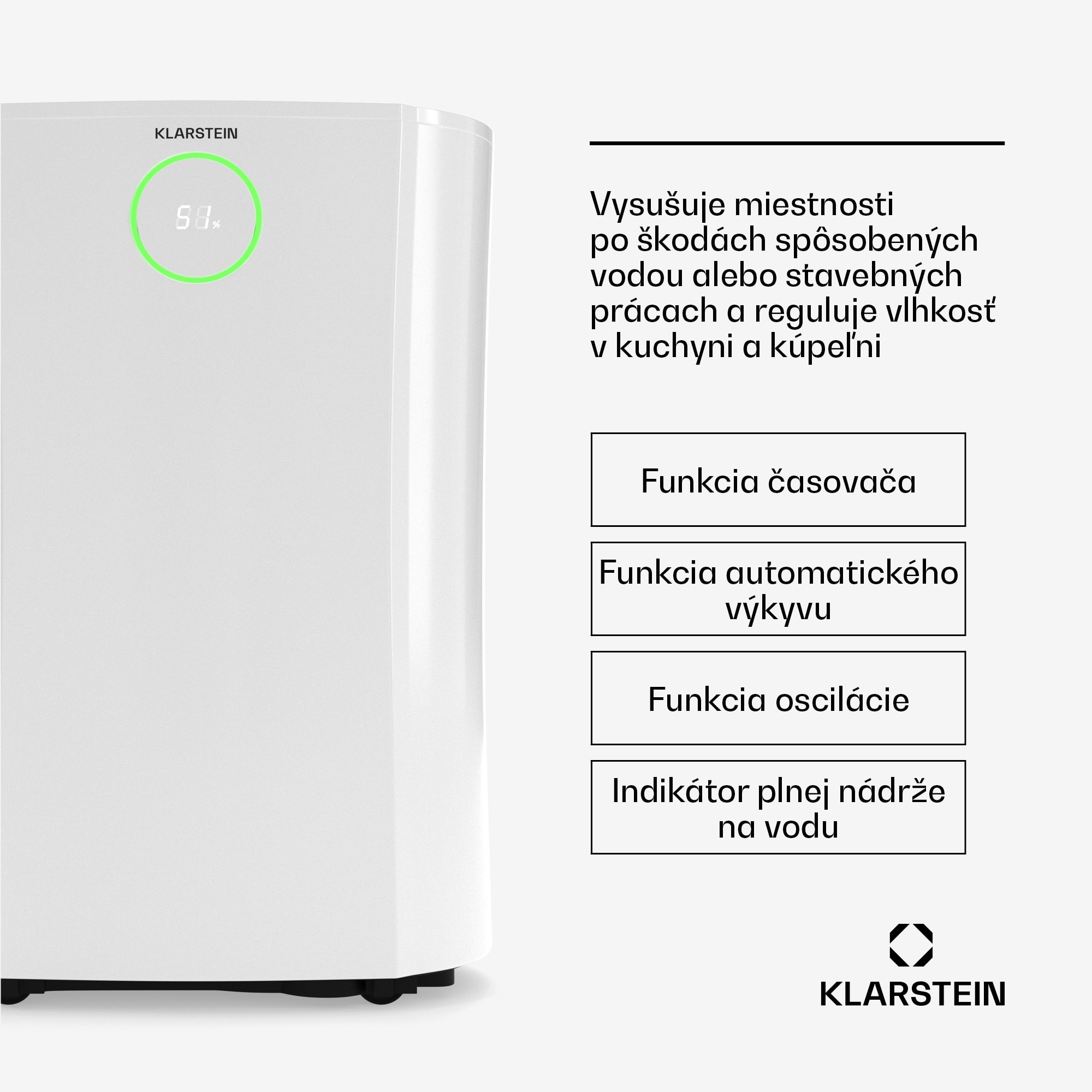 Odvlhčovač vzduchu Klarstein DryFy ProConnect 16L ponúka výkonnú a efektívnu reguláciu vlhkosti pre váš domov alebo kanceláriu. S pôsobivým výkonom odvlhčovania až 16 litrov za deň je toto zariadenie ideálne pre miestnosti do 18m². Vďaka inteligentnému senzoru vlhkosti je možné nastaviť požadovanú vlhkosť v 5% prírastkoch od 40-80% vlhkosti v miestnosti, čo umožňuje presnú kontrolu a zabraňuje plytvaniu energiou. Spotrebič pracuje optimálne pri teplotách v rozmedzí 5-35 °C. Integrovaná funkcia Wi-Fi vám umožňuje ovládať odvlhčovač prostredníctvom aplikácie Klarstein, takže môžete pohodlne regulovať vlhkosť odkiaľkoľvek. Tento odvlhčovač do domu je ideálny pre každodenné použitie.Odvlhčovač vzduchu Klarstein DryFy ProConnect 16L má filter s aktívnym uhlím, ktorý okrem vlhkosti odstraňuje zo vzduchu aj prach, pachy a baktérie, čím zabezpečuje zdravú klímu v miestnosti. Trojfarebný LED indikátor zobrazuje aktuálnu vlhkosť. Odnímateľná nádrž na vodu má objem 2,5 litra a ľahko sa vyprázdňuje. Dodatočné funkcie ako 24-hodinový časovač, rôzne prevádzkové režimy a automatické odmrazovanie robia z Klarstein DryFy ProConnect 16L všestranný a spoľahlivý odvlhčovač vzduchu.