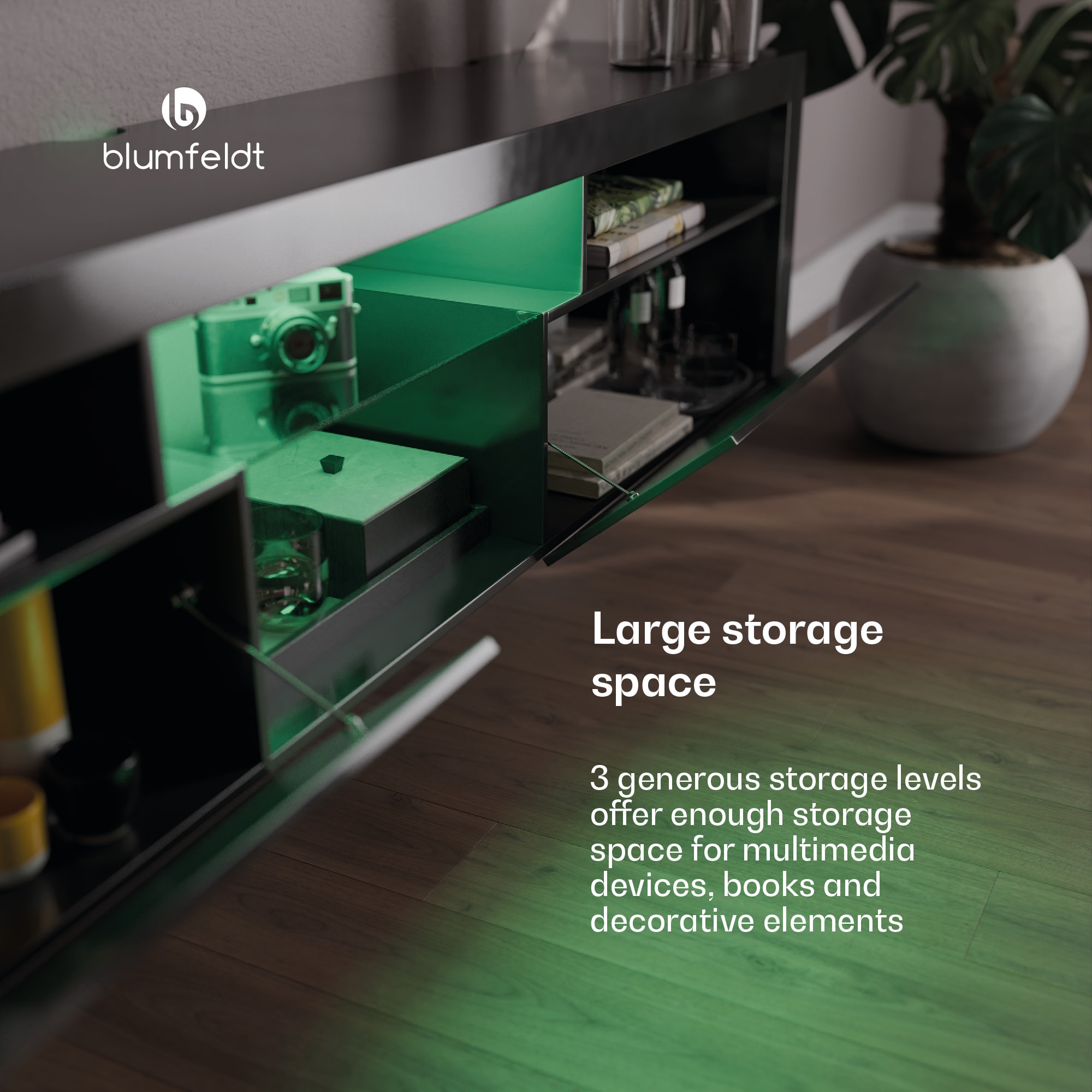 TV skrinkablumfeldt Elgin kombinuje moderný štýl a funkčnosť a prináša tak pôsobivý kus nábytku pre váš domov. Vďaka svojmu modernému dizajnu s matnou doskou a laminátom vyžaruje nielen štýl, ale aj robustnosť, vďaka čomu sa stane ozdobou vašej obývačky.Integrované LED osvetlenie umožňuje prispôsobiť atmosféru podľa vašich preferencií. Variabilný výber farieb a štyri rôzne režimy osvetlenia vytvárajú individuálnu svetelnú náladu pre každú príležitosť TV skrinka blumfeldt Elgin s tromi veľkorysými úložnými úrovňami ponúka dostatok miesta na multimediálne zariadenia, knihy a dekorácie.Jednoduchá montáž je zabezpečená jasným návodom a premyslenou konštrukciou, takže vaša TV skrinka je pripravená na použitie už za 20 minút. S rozmermi 150 x 40 x 30 cm sa perfektne hodí do vašej obývačky a ponúka maximálnu nosnosť 30 kg pre váš televízor.