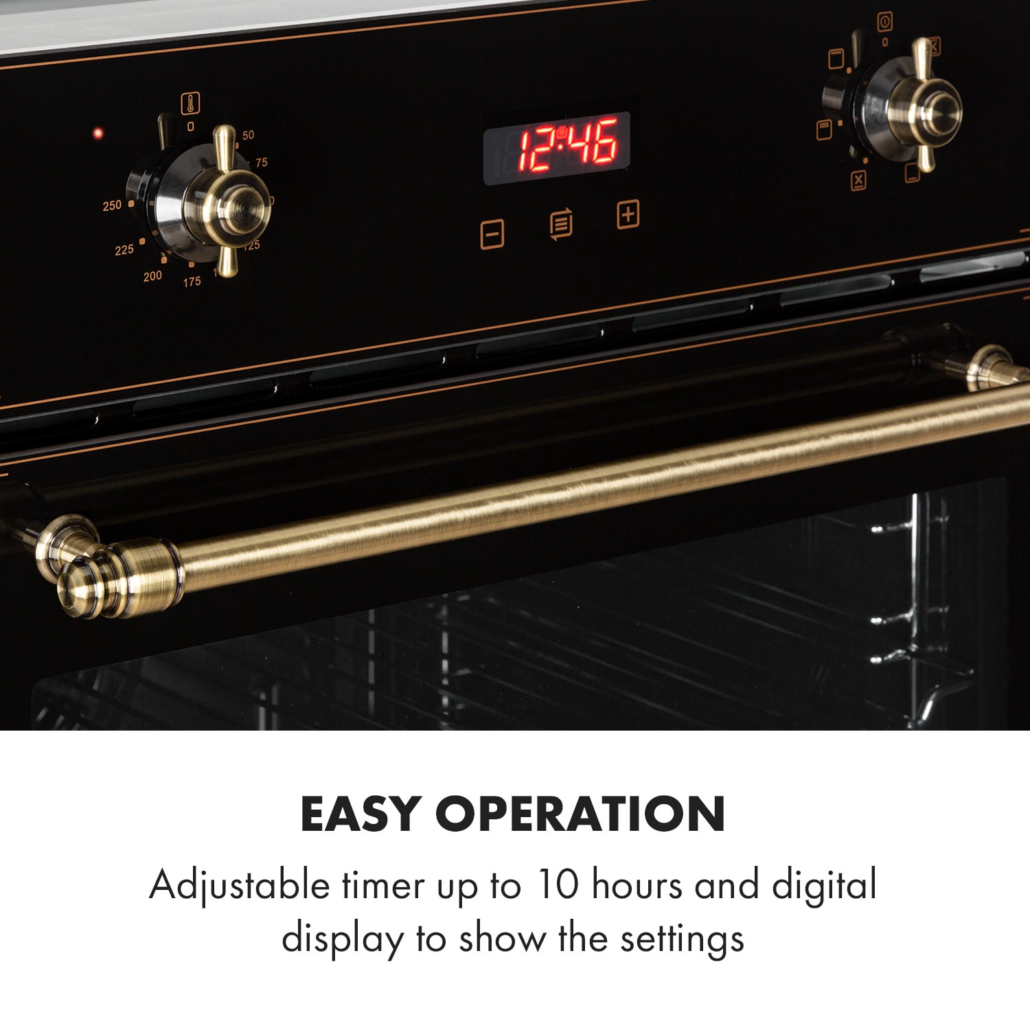 Čas na luxus: vstavaná rúra Klarstein Elizabeth vizuálne kombinuje šarm 19. storočia s modernou technikou 21. storočia a Vašu kuchyňu spraví očarujúcou.S rúrou Klarstein Elizabeth vnesiete do svojej kuchyne čistý retro dizajn. Otočné regulátory v mosadznom dizajne, rovnaká rukoväť na dvierkach a zaoblené okienko rúry oživujú čaro minulosti. Zariadenie má okrem toho najnovšie funkcie: s 2200 W a s triedou energetickej účinnosti A pripravuje šikovne a ekonomicky koláče, nákypy alebo pizzu vo svojom veľkom priestore s kapacitou 70 litrov. Vo vnútri sa dá zapnúť cirkulujúci vzduch, horný a spodný ohrev, ako aj funkcia grilu v 6 kombináciách. Zariadenie splní všetky požiadavky na nekomplikovaný a efektívny kuchynský sporák. Vstavaná rúra Elizabeth okrem toho ponúka ľahko ovládateľný časovač varenia až do 10 hodín, voliteľné teploty od 50 do 250 °C a integrovaný digitálny displej, ktorý zobrazuje všetky nastavenia.So svojím klasicko-krásnym dizajnom a mosadzne sfarbenými prvkami prináša elektrická rúra Elizabeth od spoločnosti Klarstein elegantné akcenty v retro štýle a upúta pohľad v každej kuchyni.