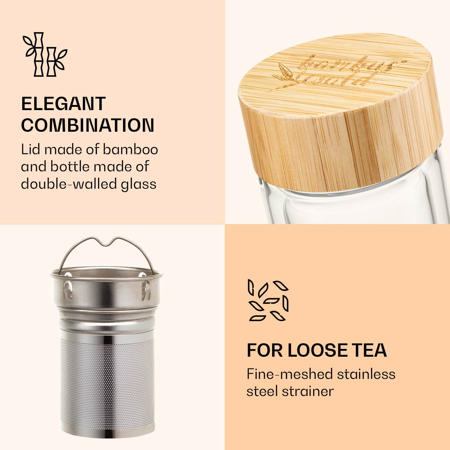 Štýlová cestovná fľaša na čaj: fľaša na čaj Bambuswald s kvalitným bambusovým uzáverom, odnímateľným sitkom a ochranným krytom je ideálny spoločník, či už do kancelárie, pri športovaní alebo na univerzitu.Štíhla fľaša zo skla odolného proti teplu a chladu a tak je vhodná na studené aj teplé nápoje. Jej dvojité sklo sa s jeho izolačným účinkom stará o to, aby si nápoje dlho udržali svoju teplotu. Nerezové sitko na čaj dodáva optimálny pôžitok z čaju. Sypaný čaj dajte jednoducho do sitka a prelejte horúcou vodou – a hotový je čerstvo zaliaty čaj. Fľašu Bambuswald môžete samozrejme použiť aj na kávu alebo iné nápoje. Bezpečný uzáver so závitom je vyrobený z udržateľného, rýchlo dorastajúceho bambusu. Vďaka pribalenému ochrannému krytu je nová fľaša na čaj chránená pred nárazmi a škrabancami.Tvarovo pekná, praktická a ekologická: užívajte si horúce alebo studené nápoje – na cestách alebo doma – s fľašou na čaj Bambuswald.
