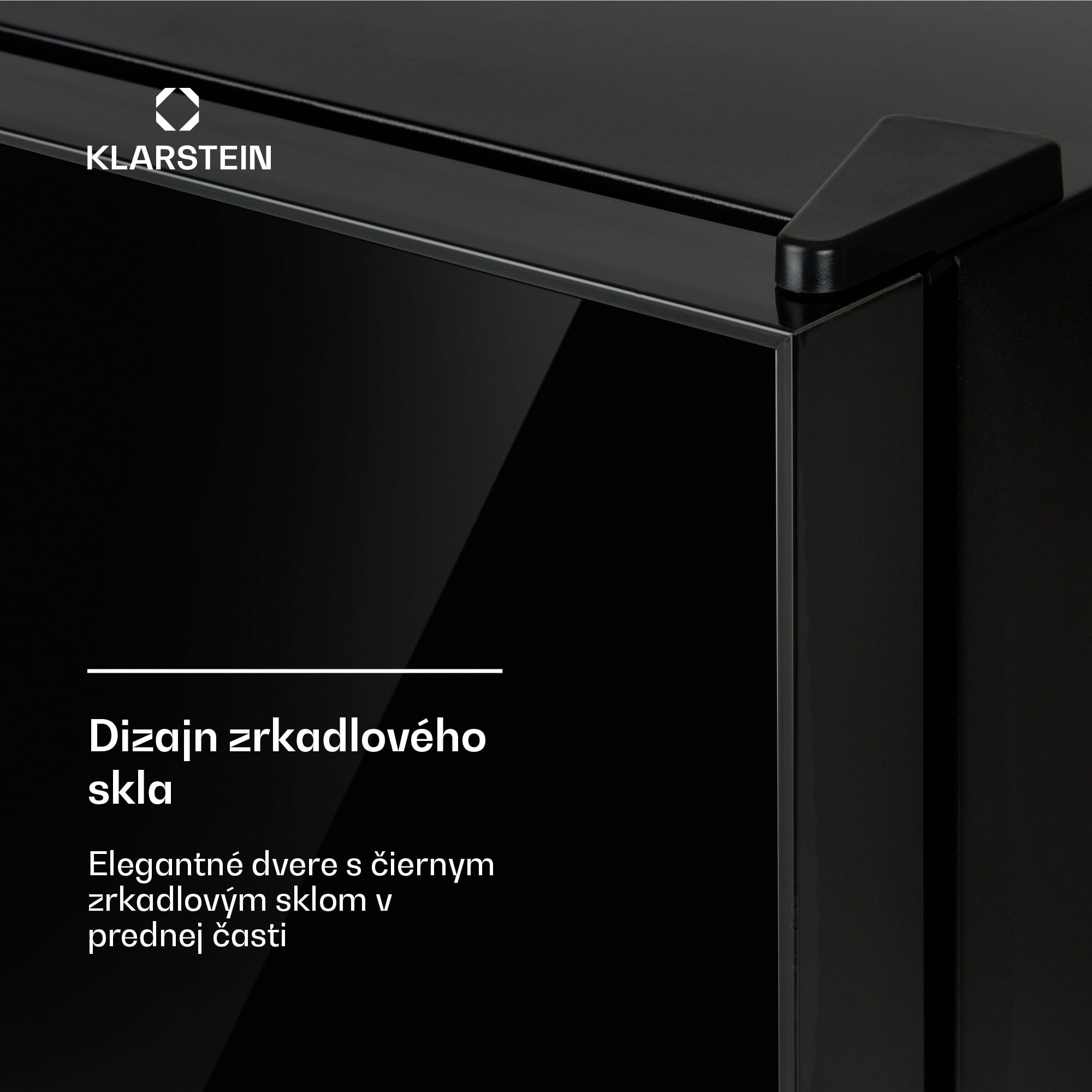Malá chladnička v zrkadlovej čiernej farbe. Mini chladnička Klarstein Frosty pomôže pri skladovaní občerstvenia, nápojov, liekov alebo kozmetiky pri nízkych teplotách – v hosťovskej izbe, na internáte alebo v spálni.Kompaktná a napriek tomu celkom veľká z hľadiska chladenia: Mini chladnička Klarstein Frosty s kapacitou 10 litrov je ideálnym miestom na skladovanie všetkých dôležitých drobností, ktorým nerobí dobre teplo. Či už ide o lak na nechty, alebo kozmetické krémy, masti a tabletky, alebo jednoducho len o čokoládu a smoothies – všetko tu zostane čerstvé. Požadovaná teplota sa dá nastaviť po stupňoch v rozmedzí od 12 do 18 °C. Aby sa zabezpečilo prehľadné skladovanie liekov v chladničke, zariadenie má oddeľovaciu sklenenú policu a pri otvorení v nej zasvieti jasné biele vnútorné osvetlenie.Aj exteriér kompaktnej chladničky Klarstein Frosty je žiarivý, pretože celý predný panel je vyrobený z čierneho zrkadlového skla. Vďaka tomu je Frosty v každom prostredí nielen mini chladničkou, ale tiež zaujímavým dizajnovým prvkom. Aby sa dalo zariadenie používať kdekoľvek, termoelektrický chladiaci systém vytvára iba tichý pracovný hluk s 33 dB, a tak ho možno bez problémov umiestniť aj v spálňach bez narušenia spánku.Čierna mini chladnička Klarstein Frosty zabezpečí chladnú sviežosť.